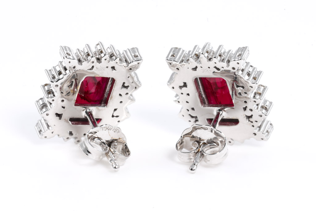 Ruby and Diamond earrings with emerald cut Mozambique Rubies totalling approximately 3.80cts (note: rubies with surface reaching inclusions) and round Diamonds totalling approximately 0.59ct (Estimated grading G-H SI). 18ct white gold. Weight 5.9g. With GIA report #2457028252. (As New)