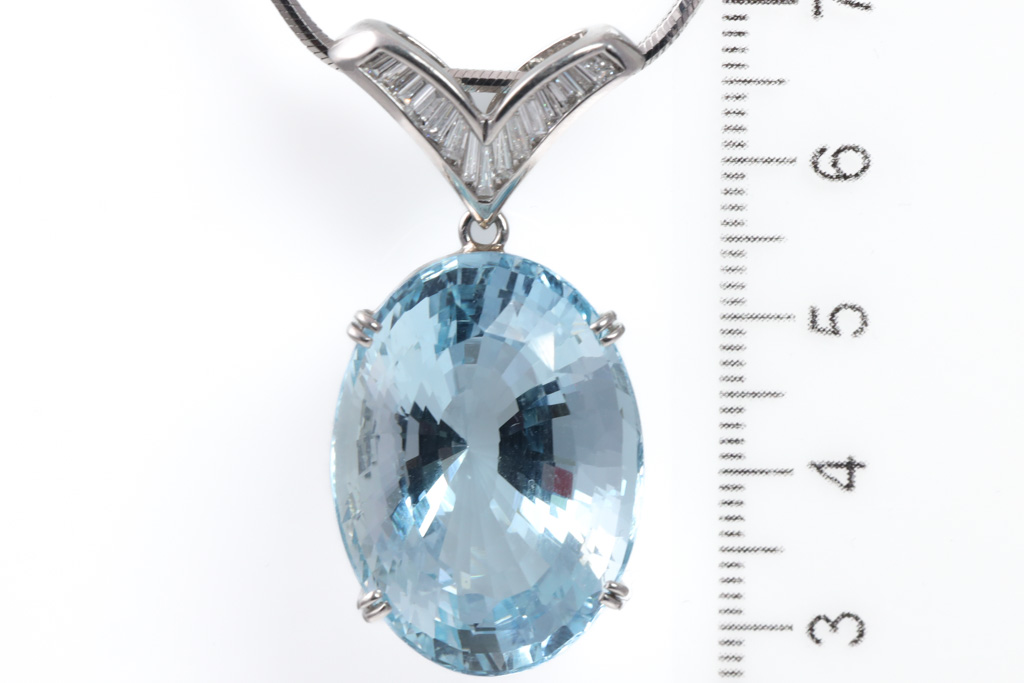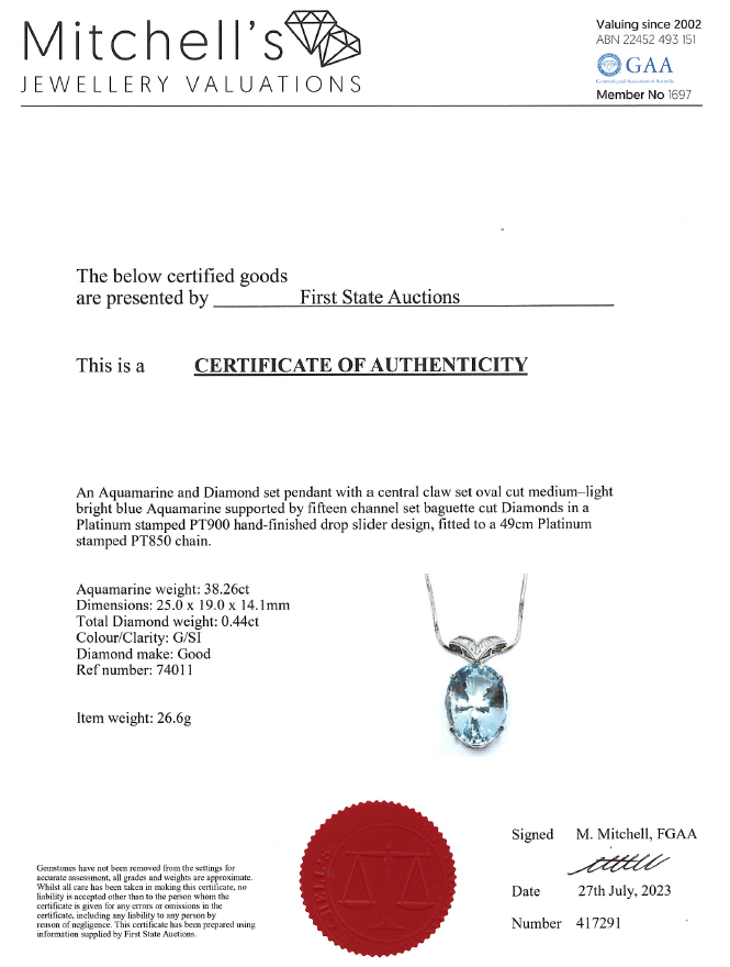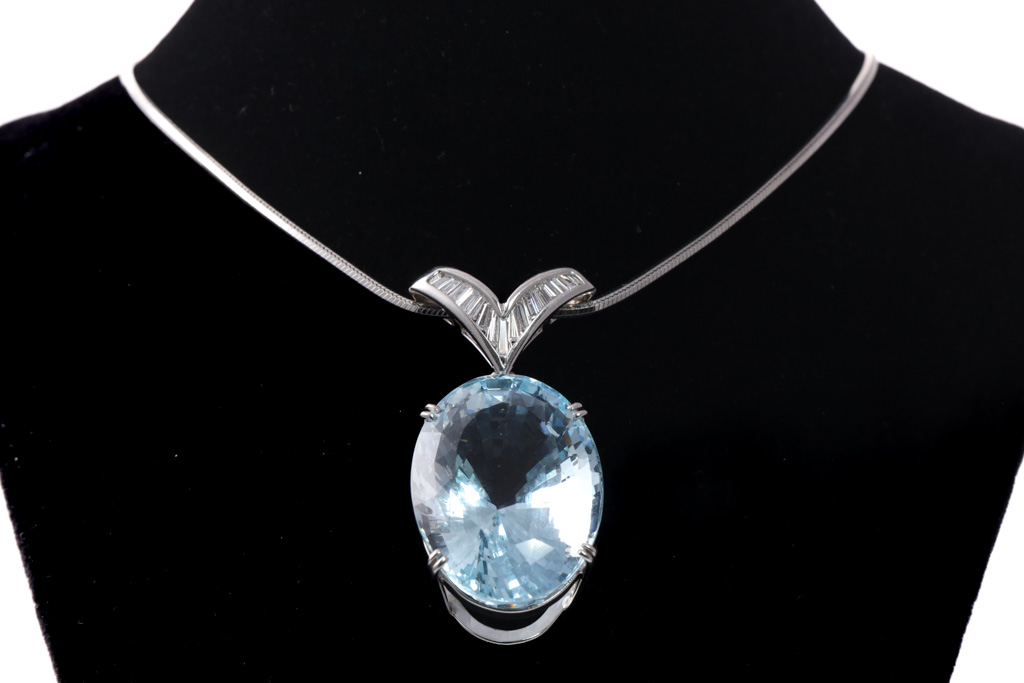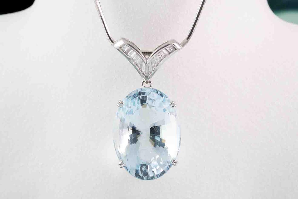 Aquamarine and Diamond pendant with oval Aquamarine of 38.26ct and baguette cut Diamonds totalling 0.44cts (Estimated grading: G-H SI). Platinum - 900 with 49cm platinum-850 chain. Weight: 26.6g. With certificate #417291. (Pre-owned)