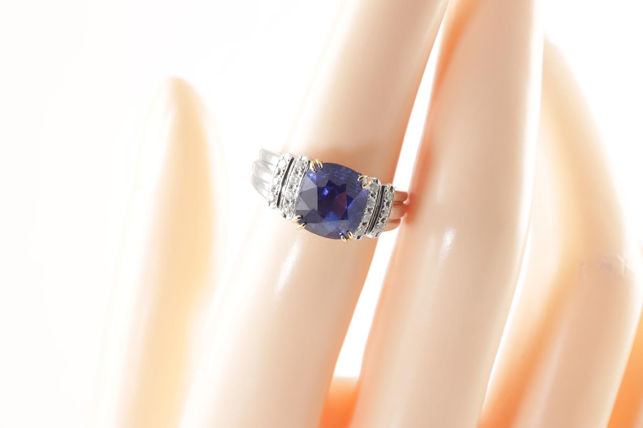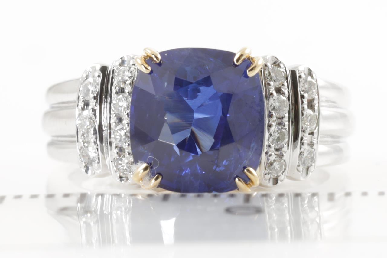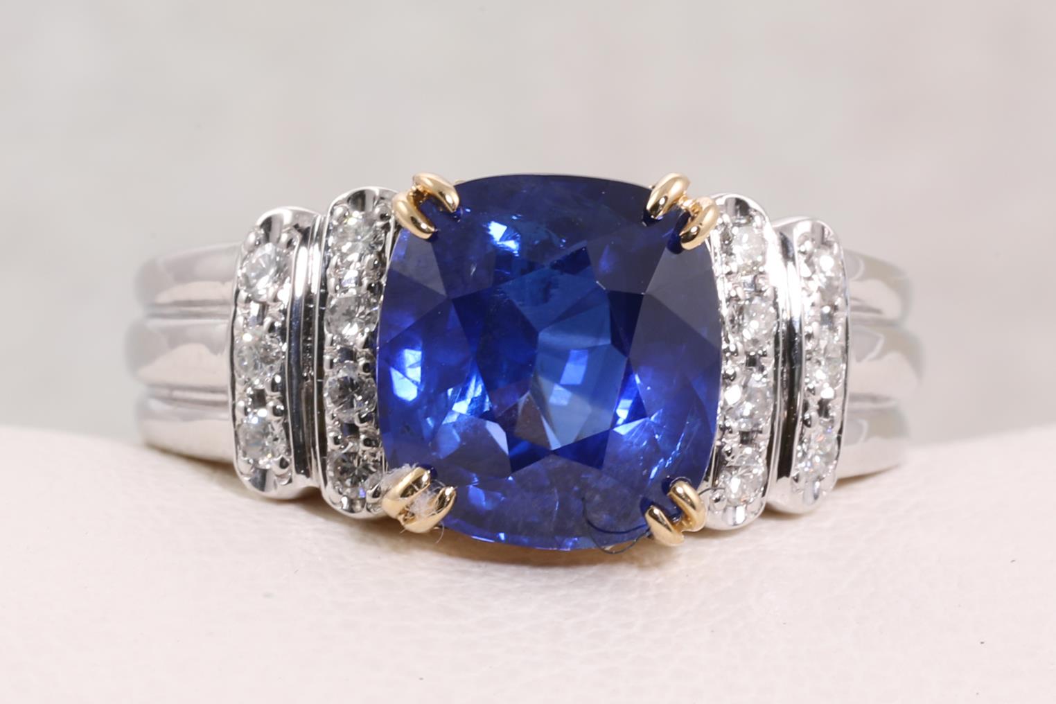 Sapphire and Diamond ring with a cushion cut blue Sapphire of 3.86ct and Diamonds totalling 0.20cts. 18ct yellow gold & platinum. Ring size L. Weight: 10.6g. With certificate #414579. (Pre-owned)