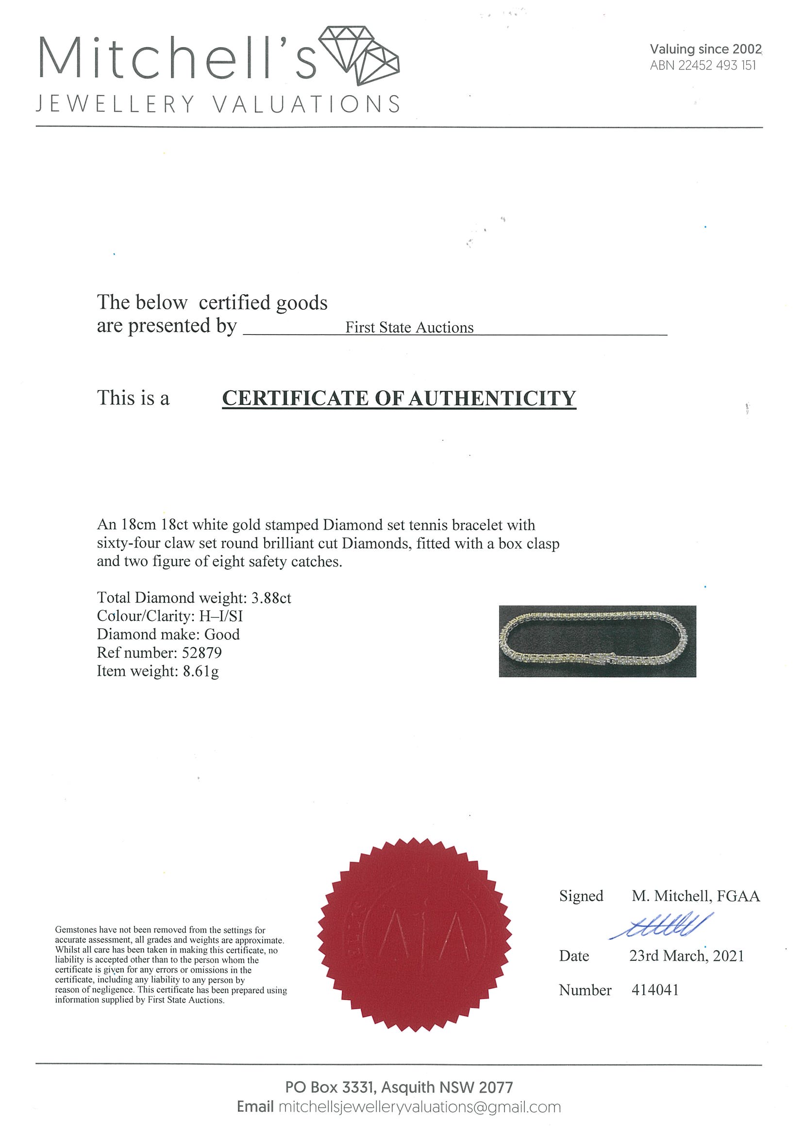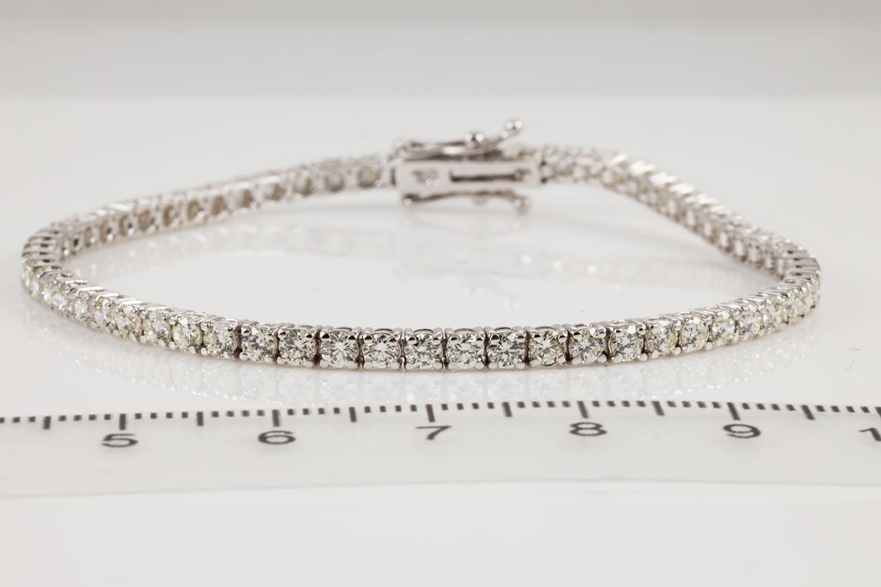 Diamond tennis bracelet with 64 round Diamonds totalling 3.88cts (Estimated grading: H-I SI). 18ct white gold. Length: 18cm Weight: 8.6g With certificate #414041. (New)