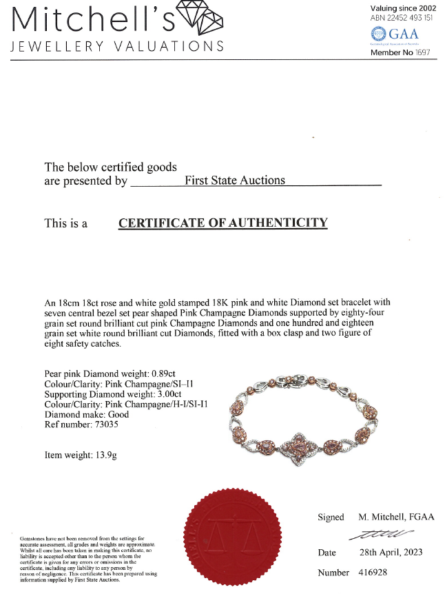 Diamond bracelet with pear shape Diamonds totalling of 0.89cts (Estimated grading: Pink Champagne SI-P1) and round Diamonds totalling 3.00cts (Estimated grading: Pink Champagne & H-I SI-P1). 18ct rose gold and white gold. Length: 18cm. Weight: 13.9g. With Certificate #416928. (As new)