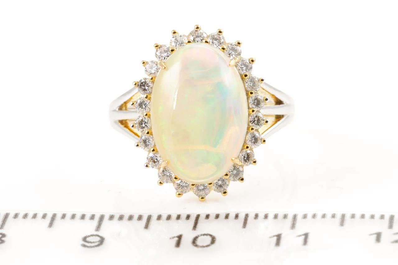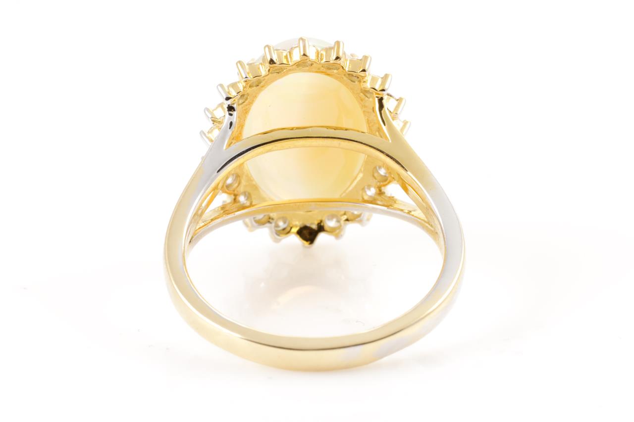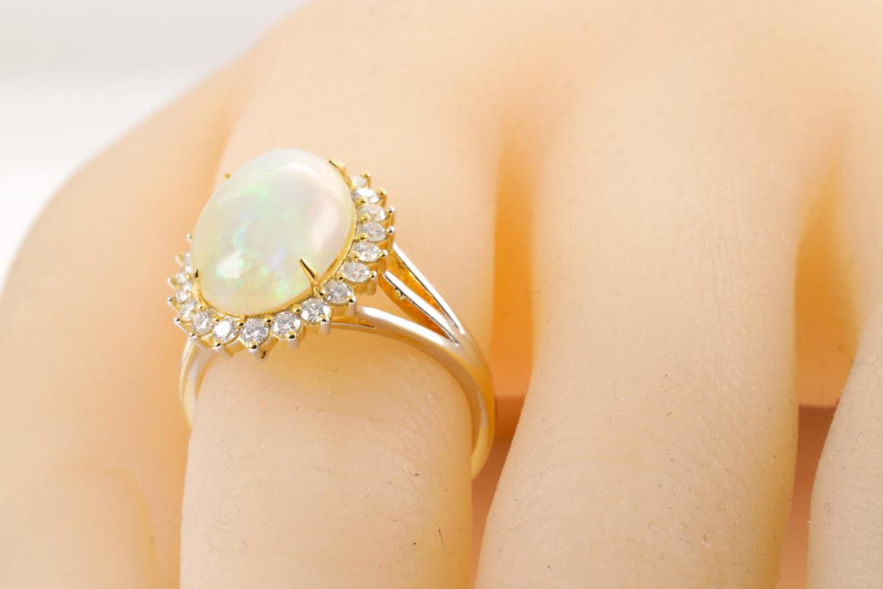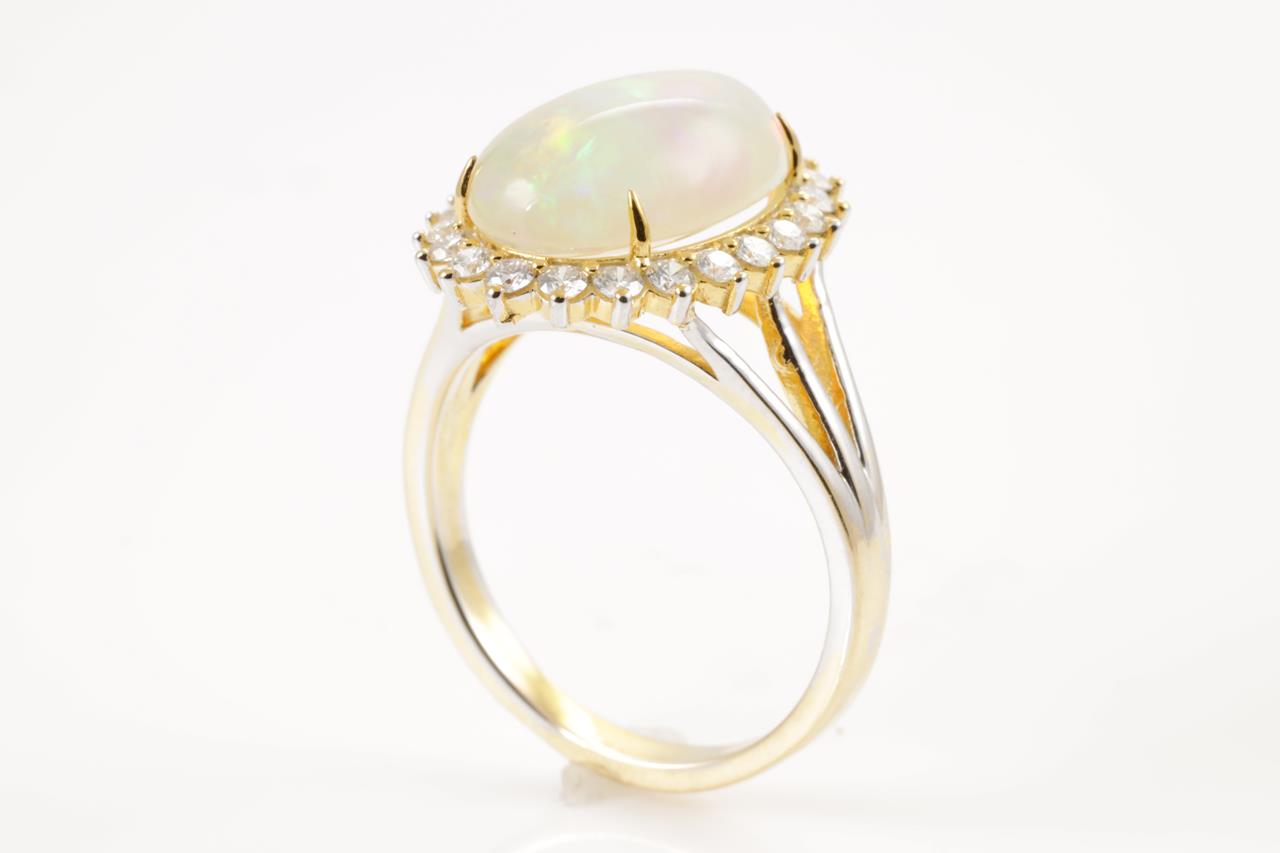 Opal and Diamond ring with an oval Noble Opal of 3.90ct and Diamonds totalling 0.51cts (Estimated grading: G SI). 18ct yellow gold. Ring size M1/2. Weight: 5.1g. (As new)