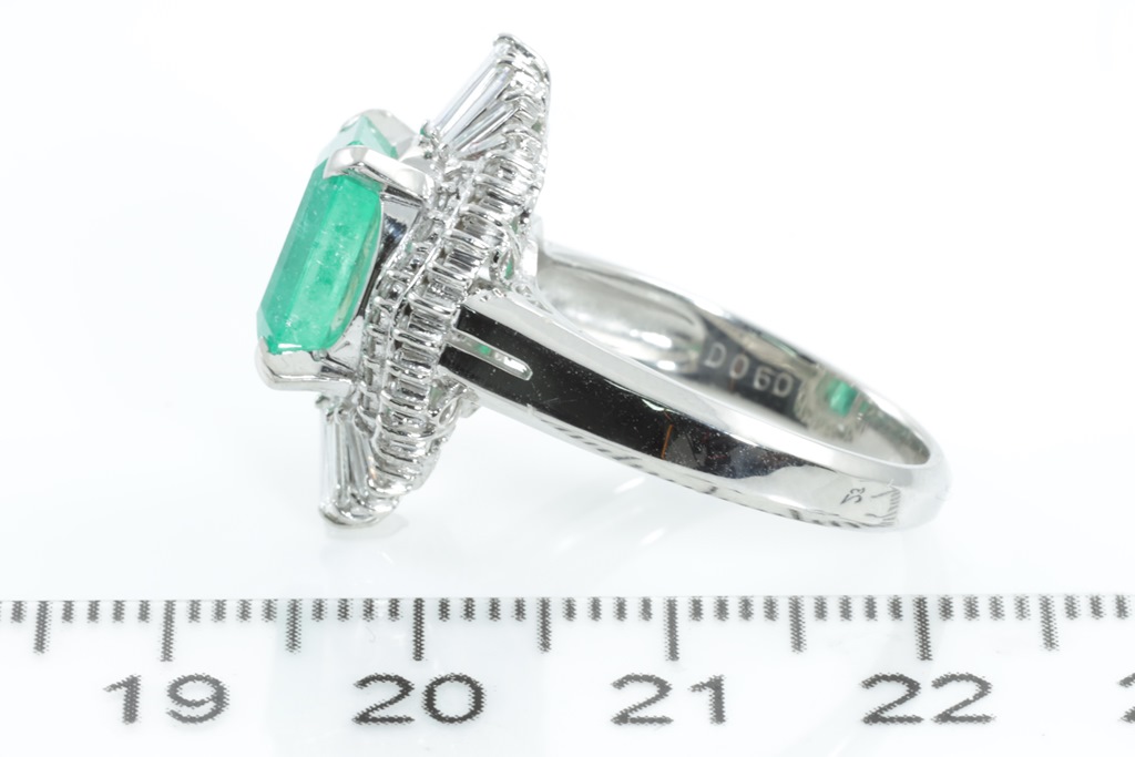 Emerald and Diamond ring with centre emerald cut Emerald of 3.91ct and surrounding round & baguette cut Diamonds totalling 0.60cts (Estimated grading: I SI). Platinum. Ring size: O. Weight: 11.8g. With certificate #415205. (Pre-owned)