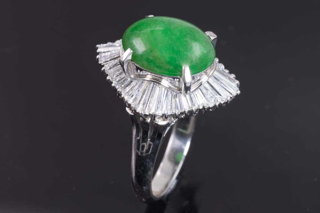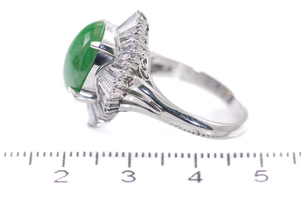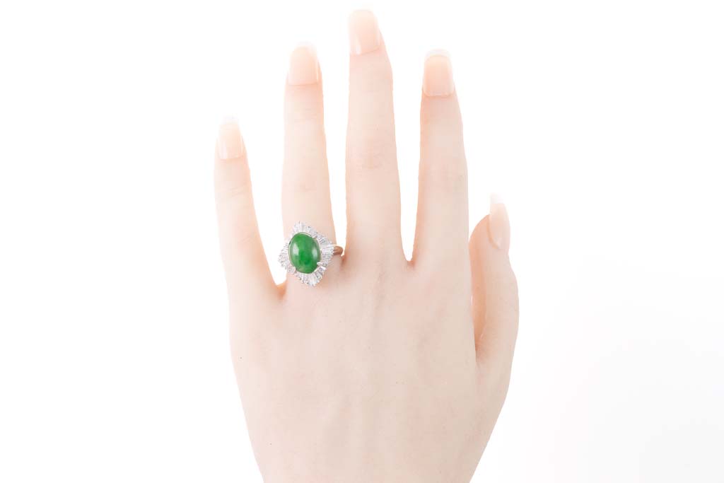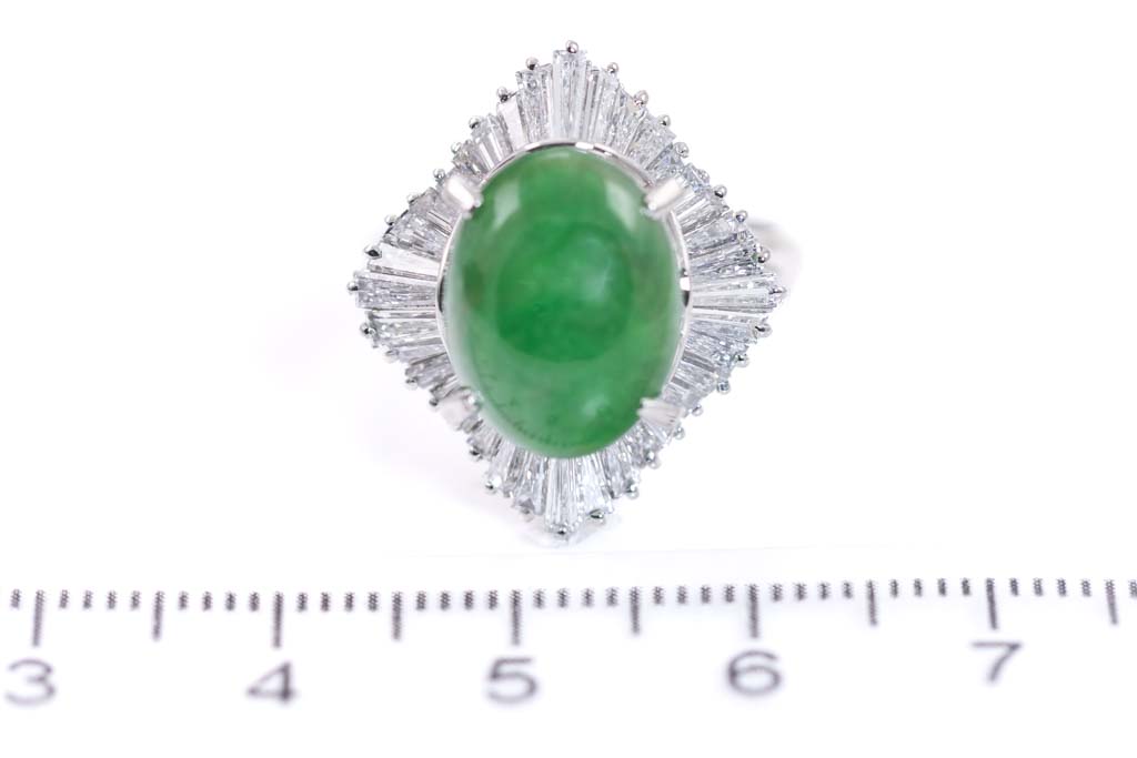 Jade and Diamond ring with cabochon cut oval shape green natural Jadeite Jade (Type A) of 3.92ct and baguette cut Diamonds totalling 1.54cts (Estimated grading: G SI-P1). Platinum-900. Ring size M. Weight: 11.5g. (Pre-owned)
