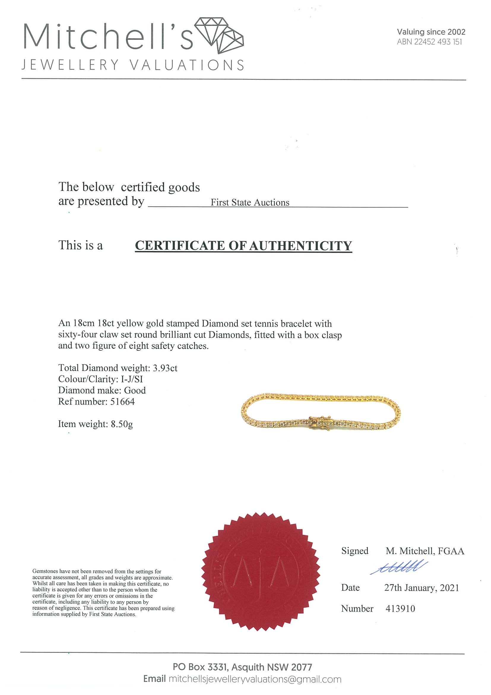 Diamond tennis bracelet with 64 round Diamonds totalling 3.93cts (Estimated grading: I-J SI). 18ct yellow gold. Length: 18cm Weight: 8.5g. With Certificate #413910. (New)