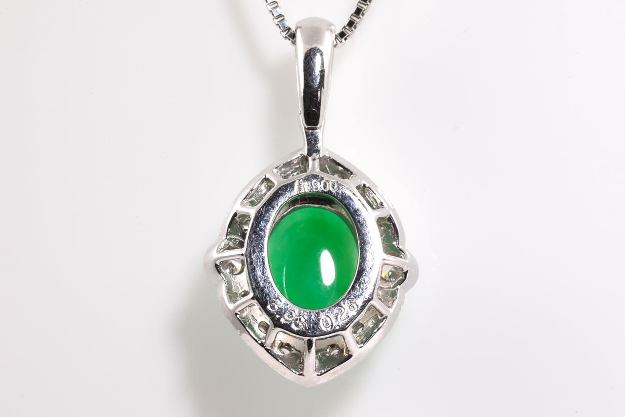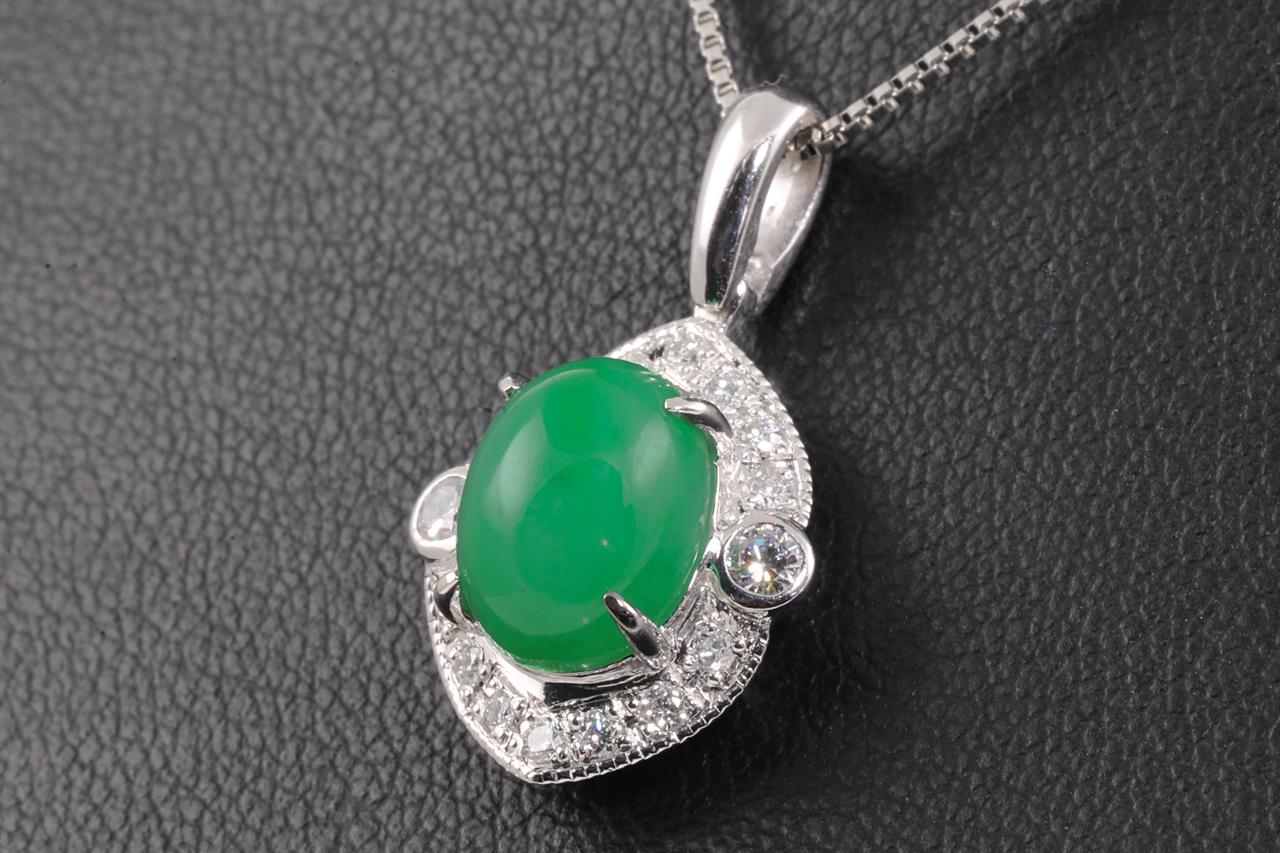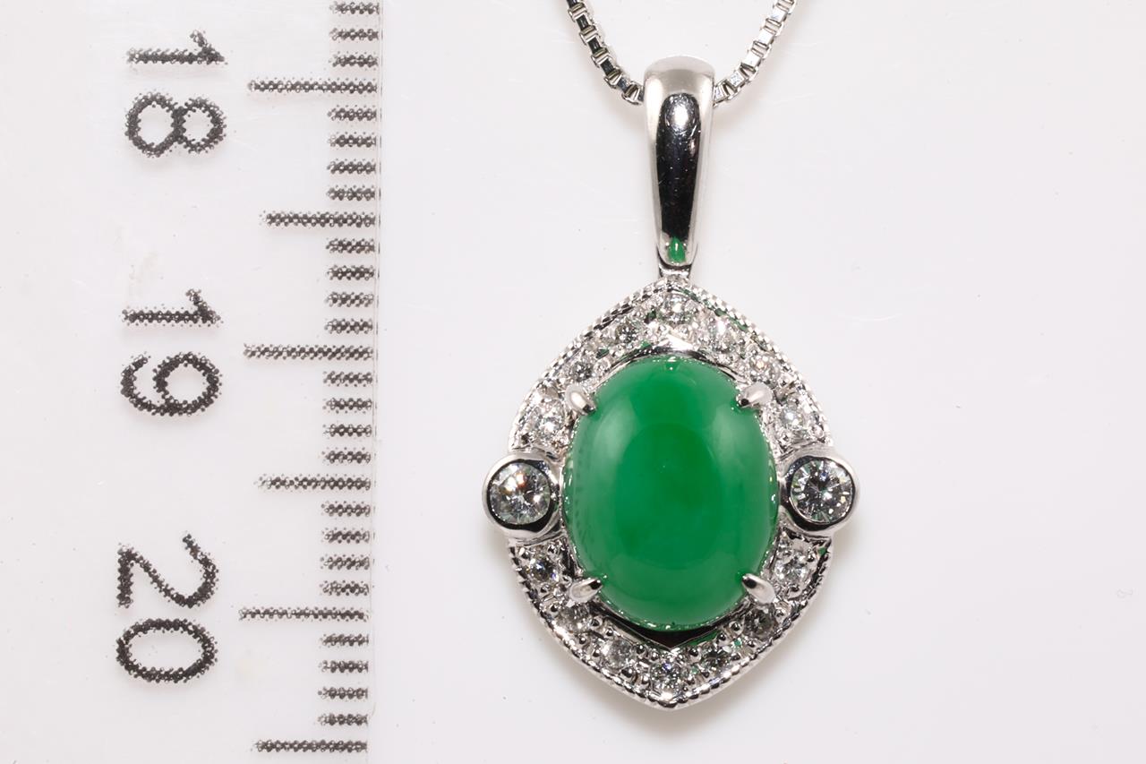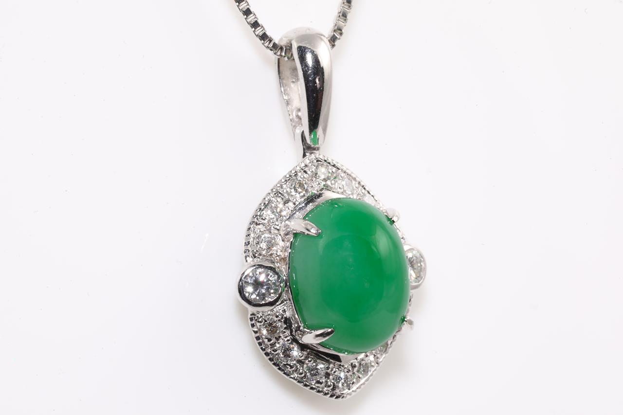 Jade and Diamond pendant with oval cabochon green natural Type A Jadeite Jade of 3.93ct and Diamonds totalling 0.26cts. Platinum with adjustable 45cm chain. Weight: 8.29g. With Gem Identification Report #087188. (Pre-owned)