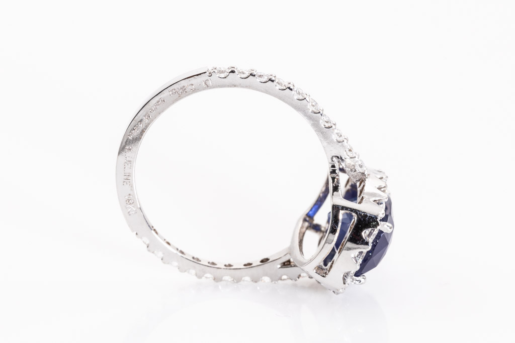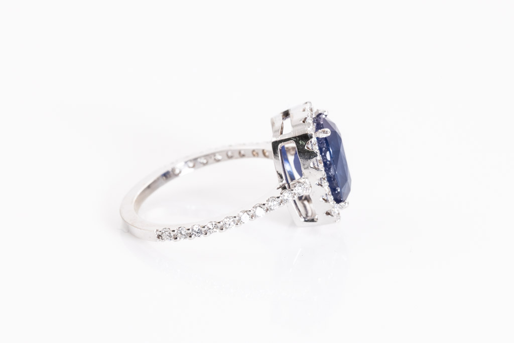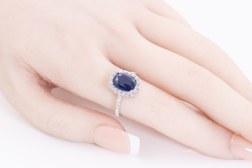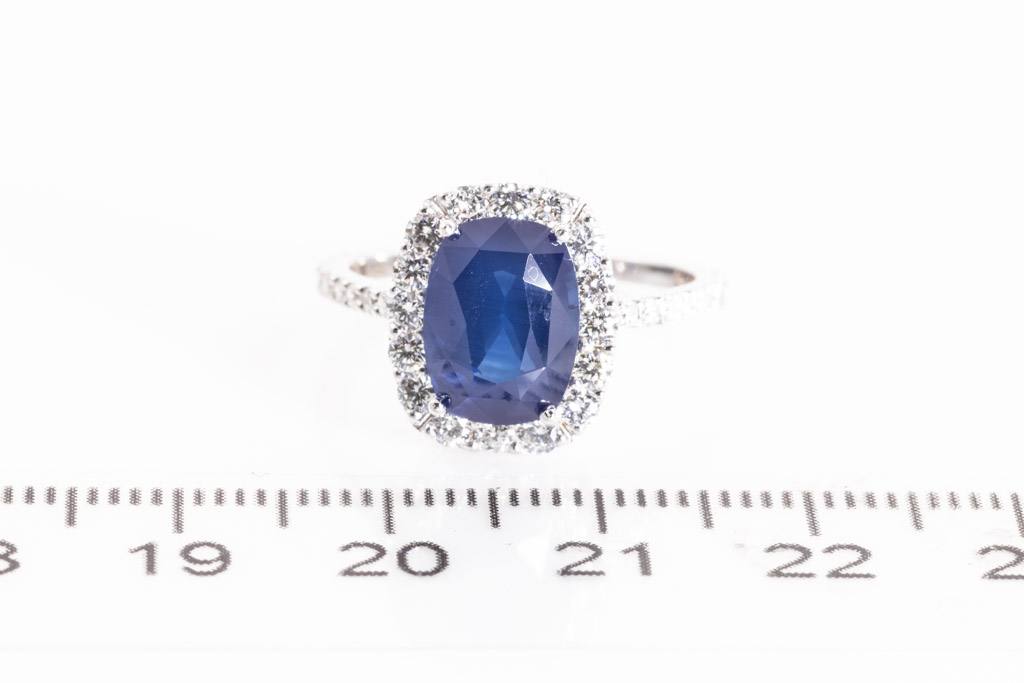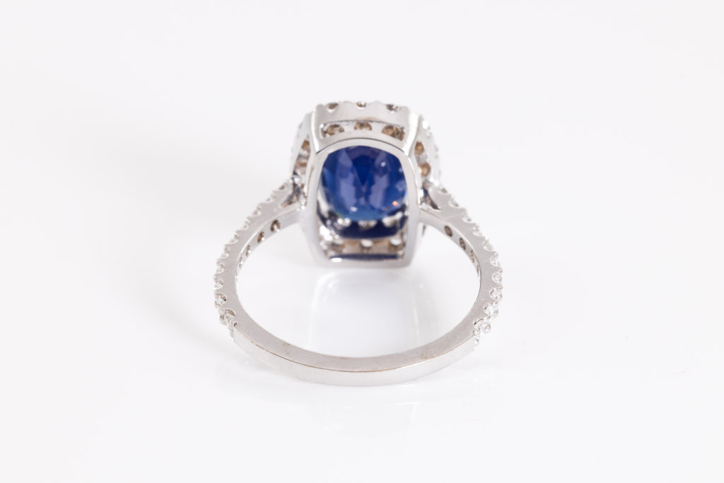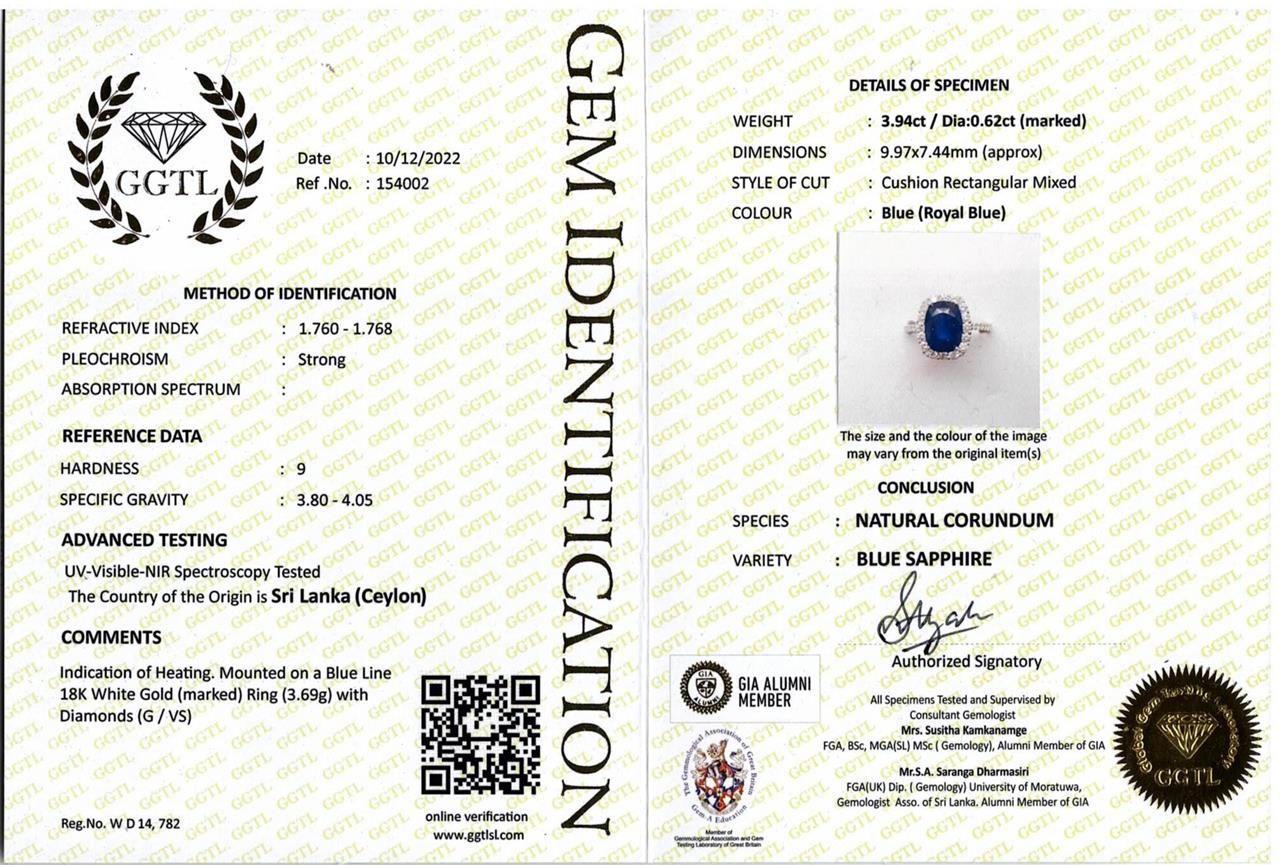 Sapphire and Diamond ring with cushion cut Royal blue Ceylon Sapphire of 3.94ct and round Diamonds totalling approximately 0.62cts (Estimated grading G VS). 18ct white gold. Ring size M 1/2 - resizing not recommended. Weight 3.7g. With gem report #154002. (As New)