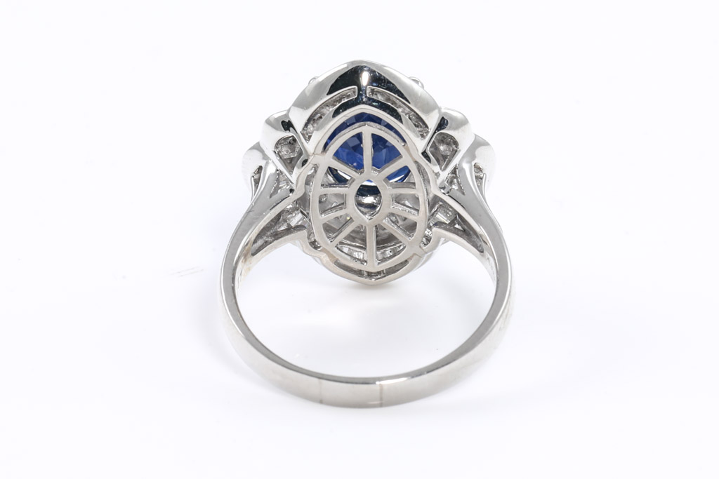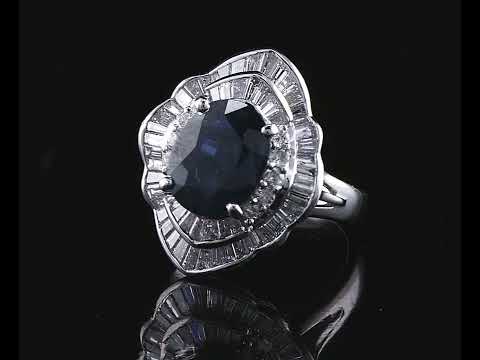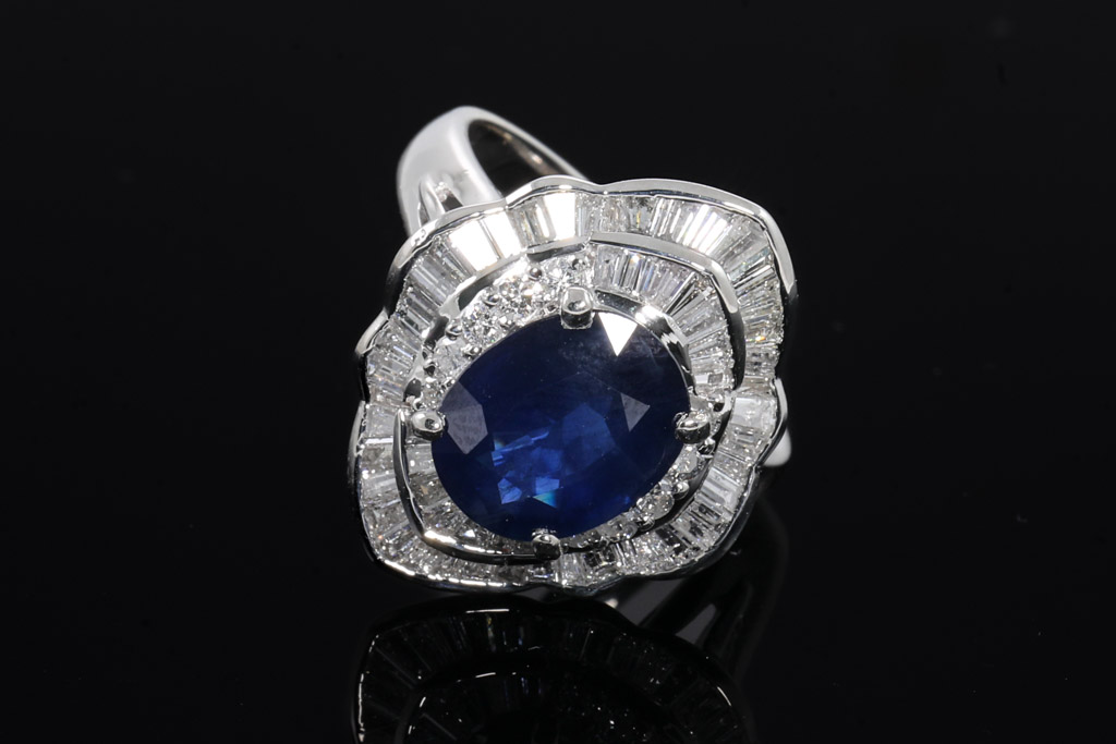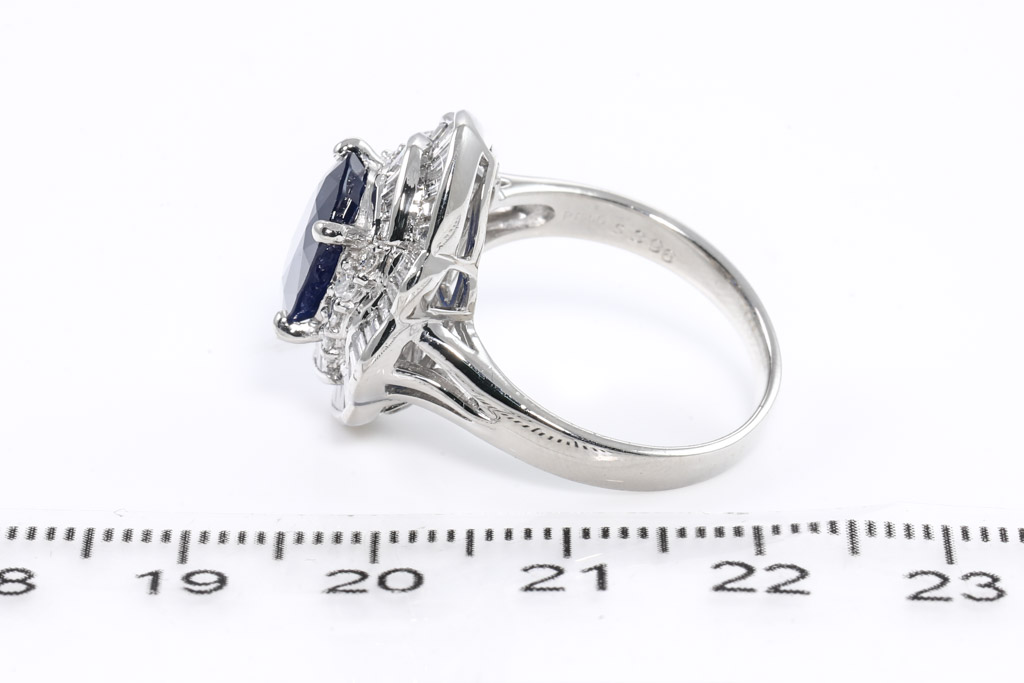 Sapphire and Diamond ring with oval blue Sapphire of 3.96ct and round & baguette cut Diamonds totalling 1.57cts (Estimated grading: H-I SI). Platinum. Ring size O3/4. Weight: 11.0g. With Certificate #416416. (Pre-owned)