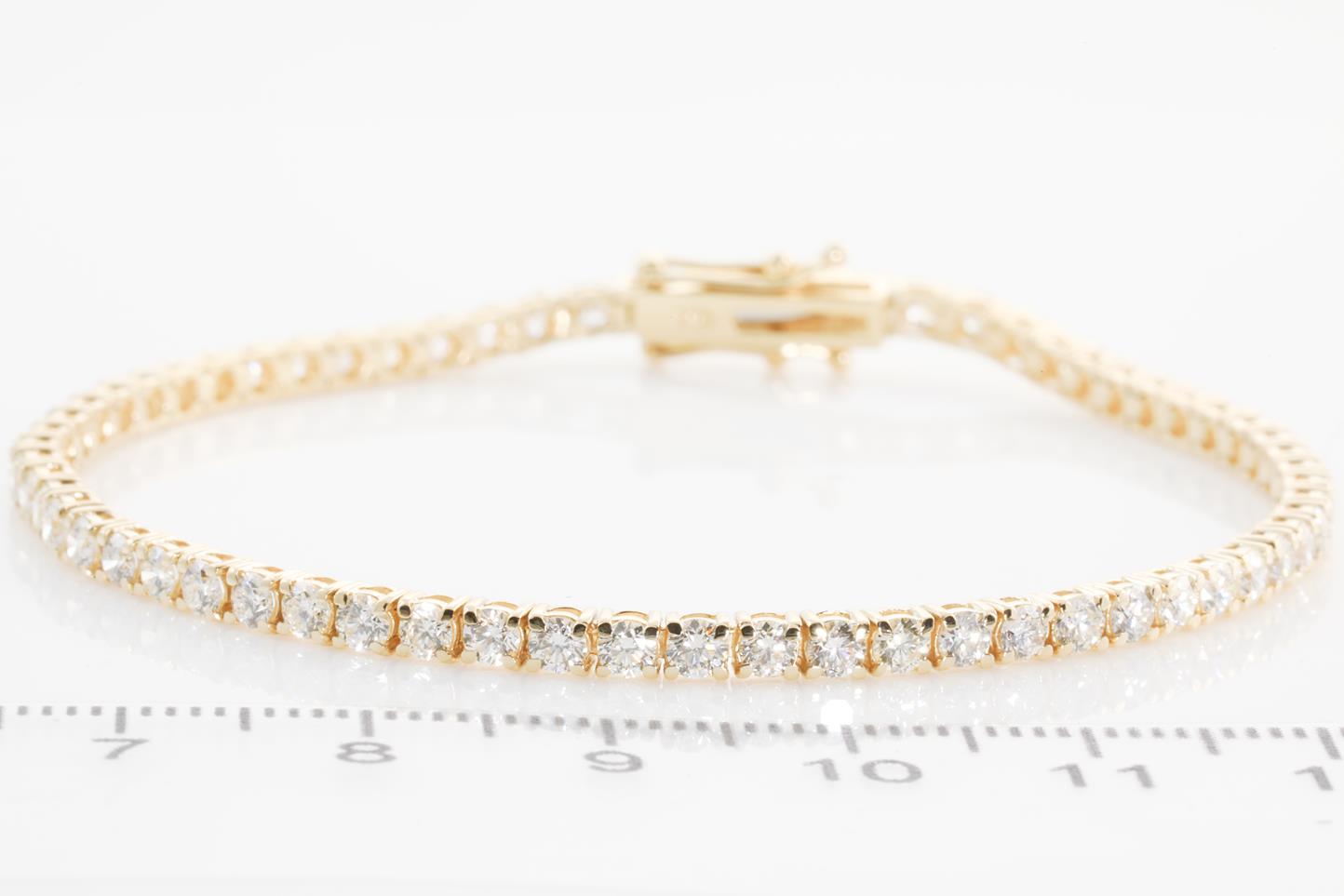 Diamond tennis bracelet with 64 round Diamonds totalling 3.97cts (Estimated grading: I-J SI). 18ct yellow gold. Length: 18cm. Weight: 8.21g. Certificate #413915. (New)