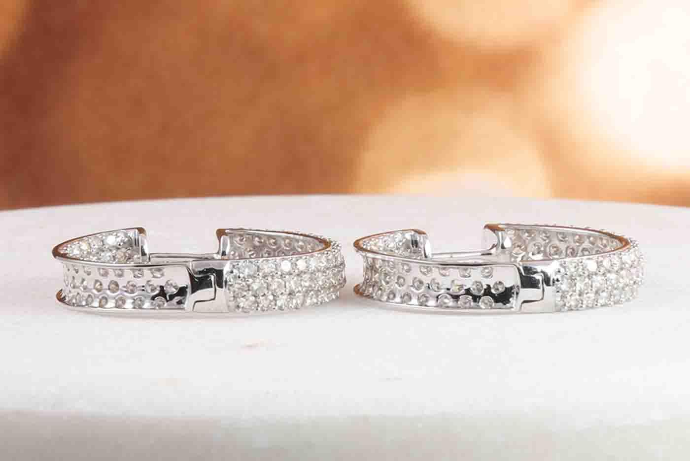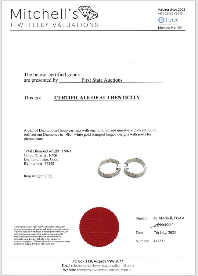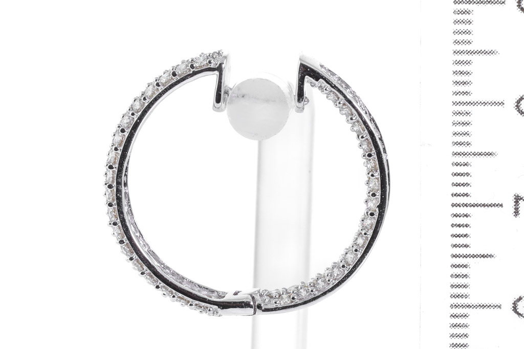 Diamond hoop earrings with 196 round Diamonds totalling 3.98cts (Estimated grading: I-J SI). Back of the hoop has the Diamonds set inside the hoop. 14ct white gold. Weight: 7.9g. With Certificate #417231. (New)