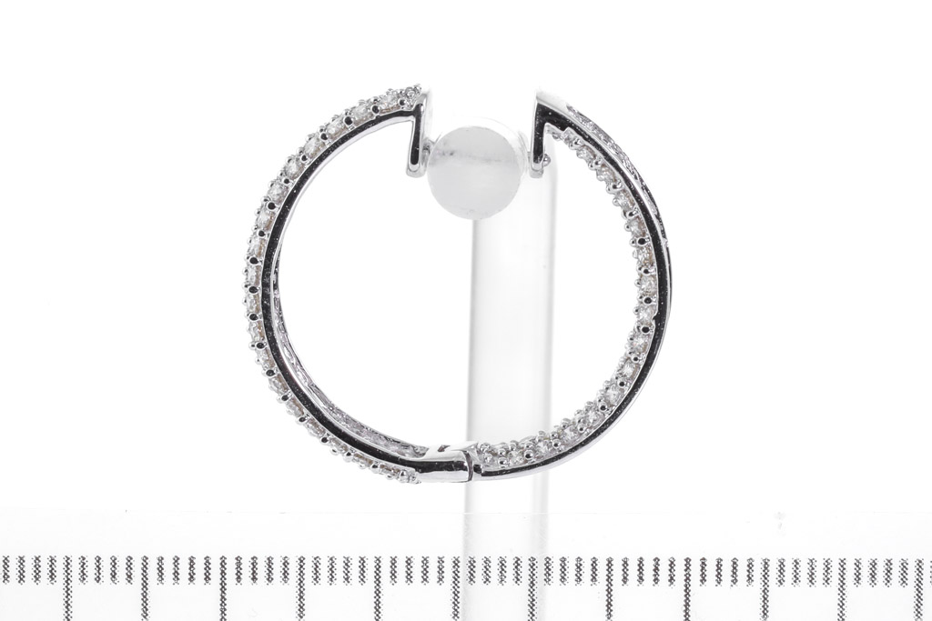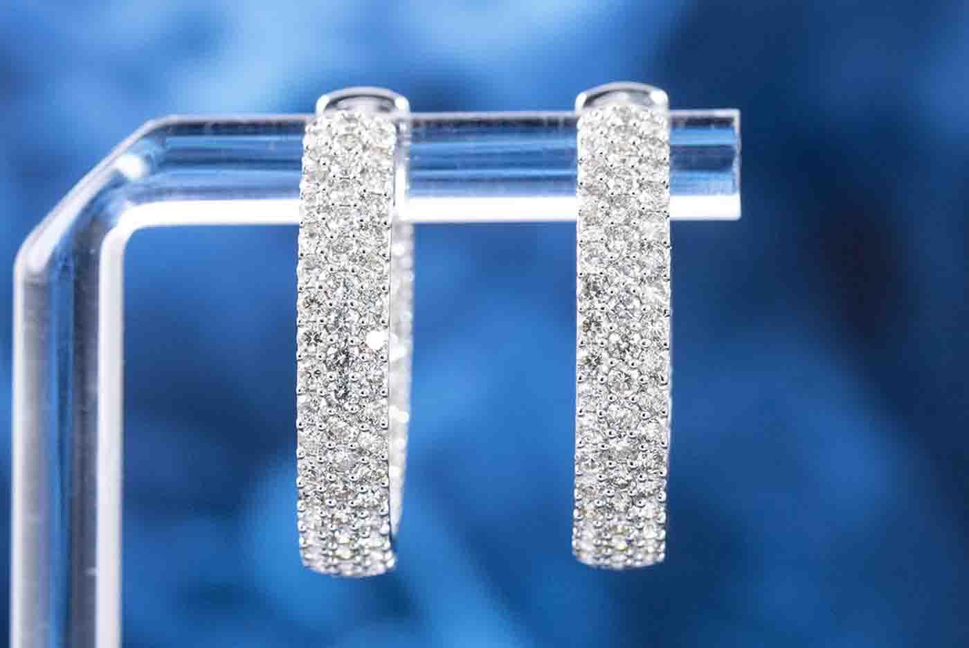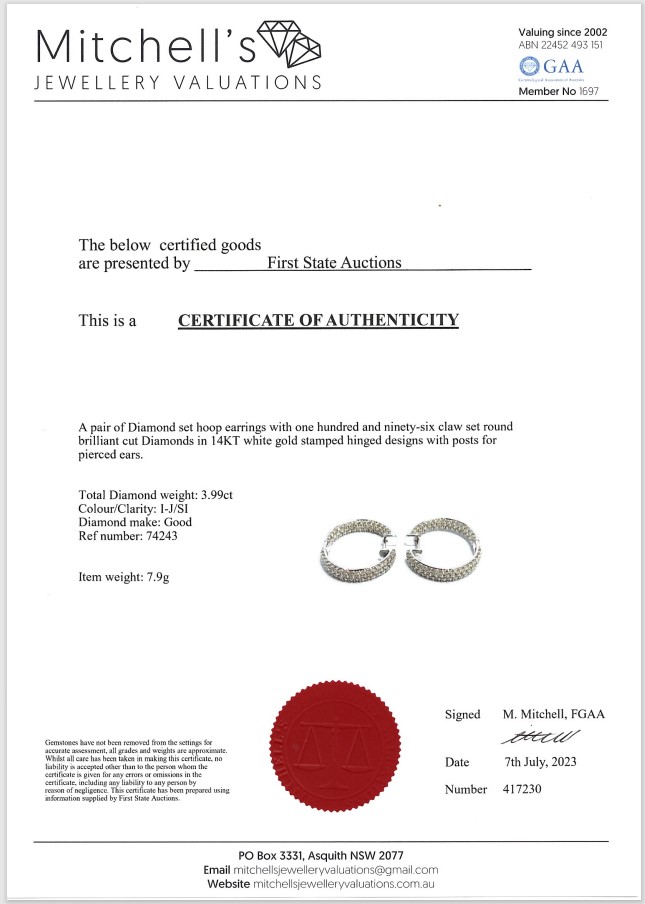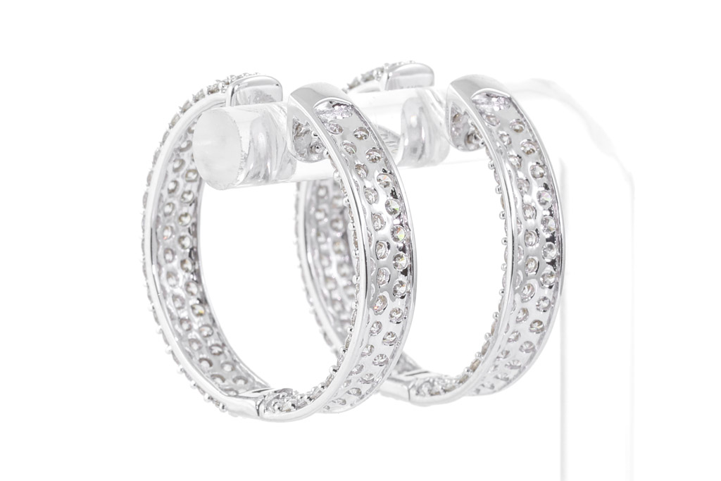 Diamond hoop earrings with 196 round Diamonds totalling 3.99cts (Estimated grading: I-J SI). Back of the hoop has the Diamonds set inside the hoop. 14ct white gold. Weight: 7.9g. With Certificate #417230. (New)