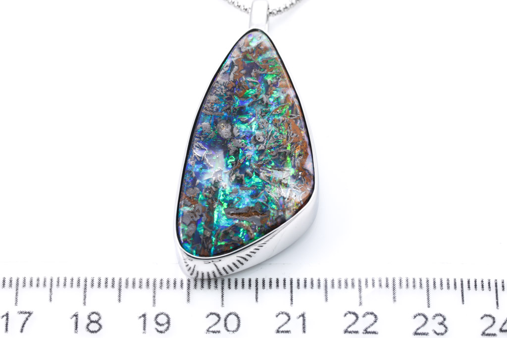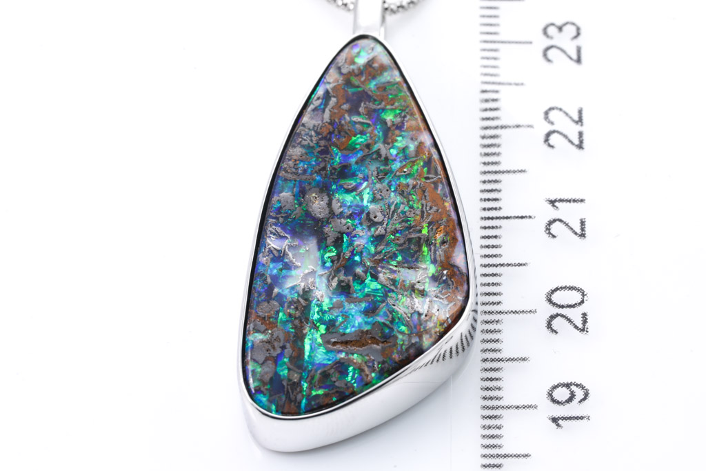 Opal pendant with solid black Boulder Opal of 40.18ct. 18ct white gold with 44cm 18ct white gold adjustable chain. Weight: 18.6g. (Pre-owned)