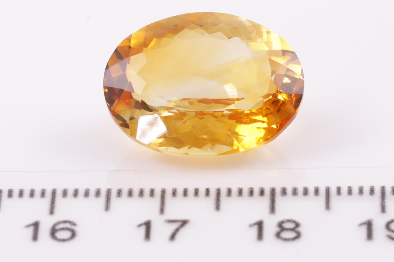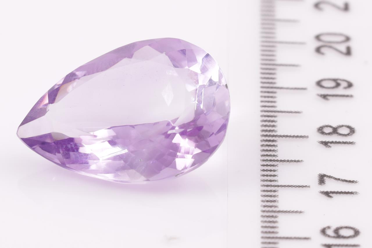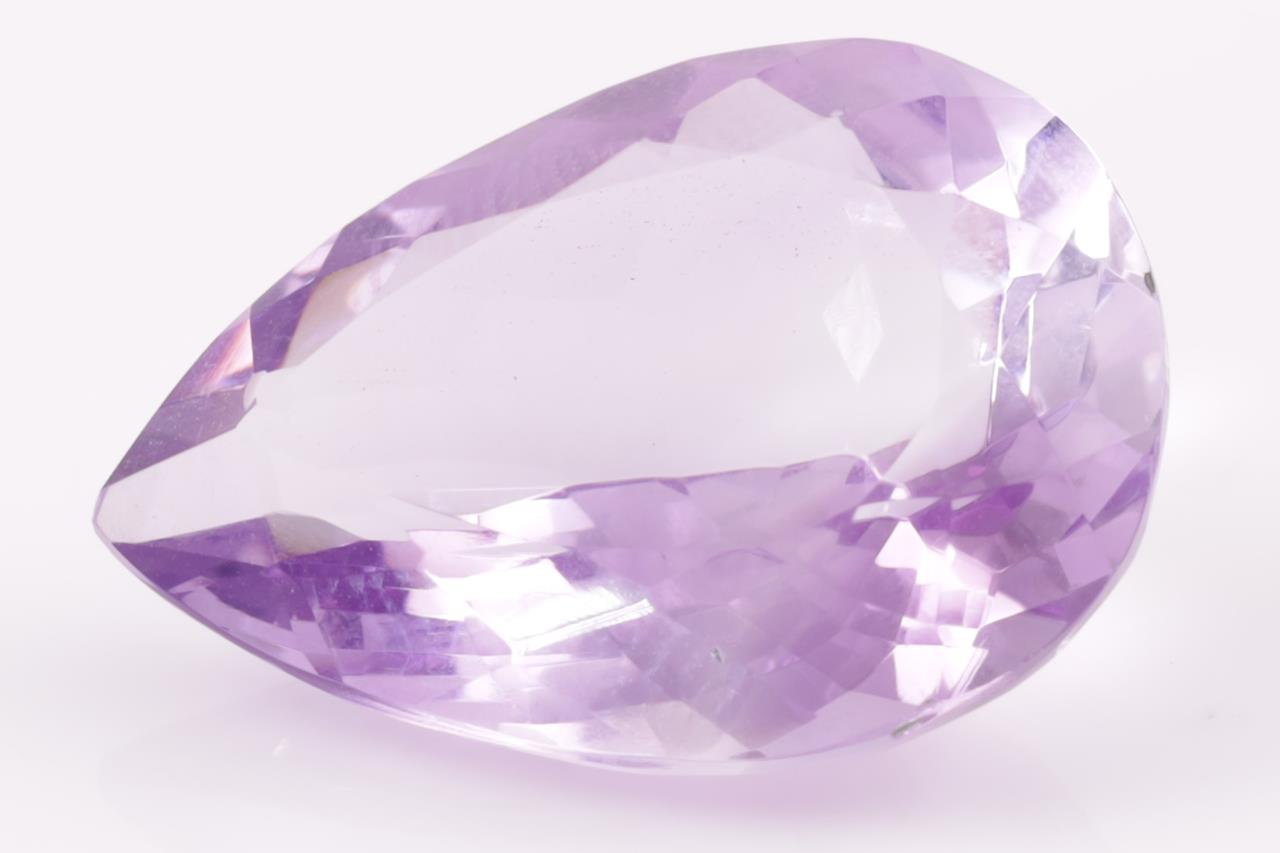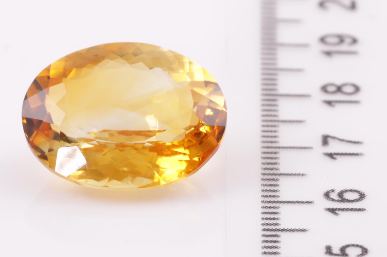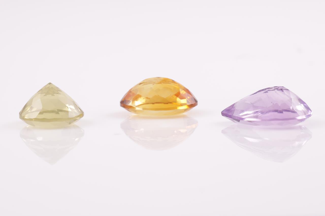 3 Loose gemstones totalling 40.19ct. Oval Citrine approx size 18.5 x 14.7 x 8.8mm, round Lemon Quartz approx size 15.1 x 9.6mm and pear Pink Amethyst approx size 21.2 x 15.5 x 8.8mm. (New)