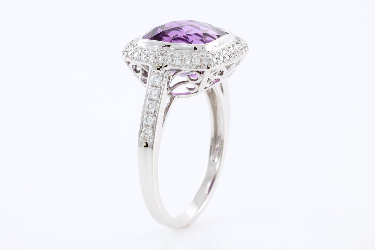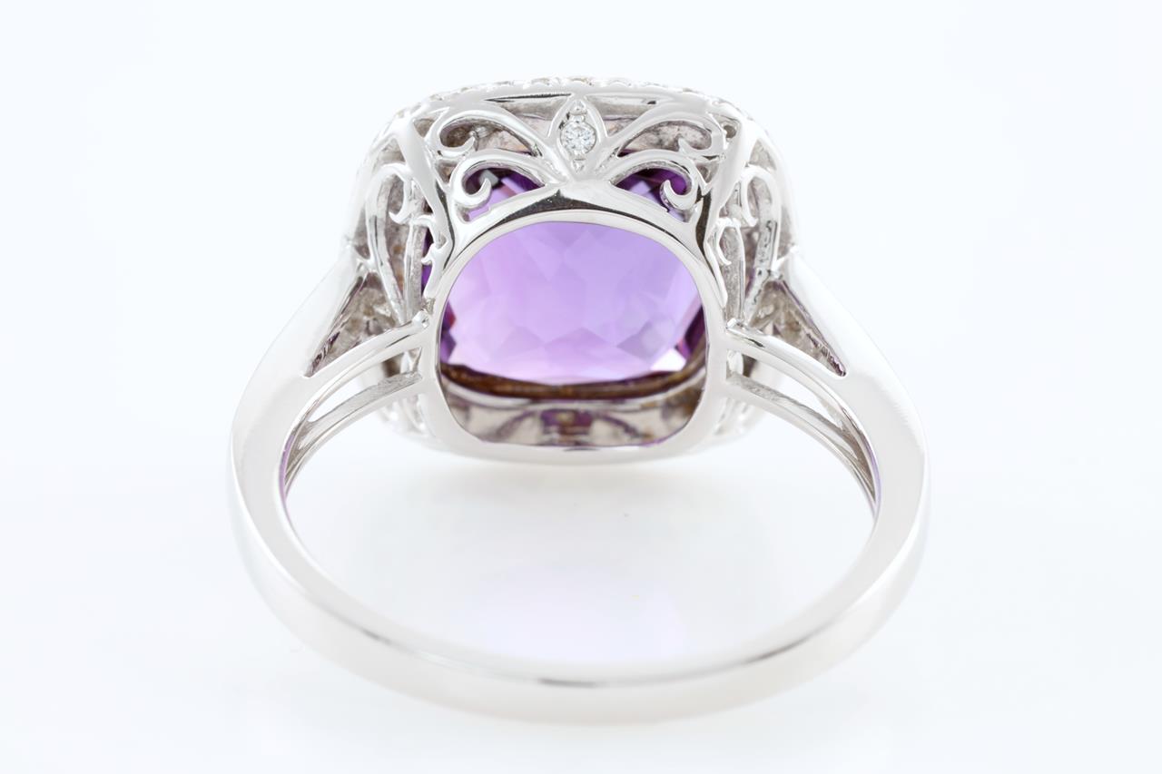Amethyst and Diamond ring with cushion checkerboard cut Amethyst of 4.01ct and Diamonds totalling 0.43cts (Estimated grading: H SI). 14ct White gold. Ring size N1/2. Weight: 4.9g (New)