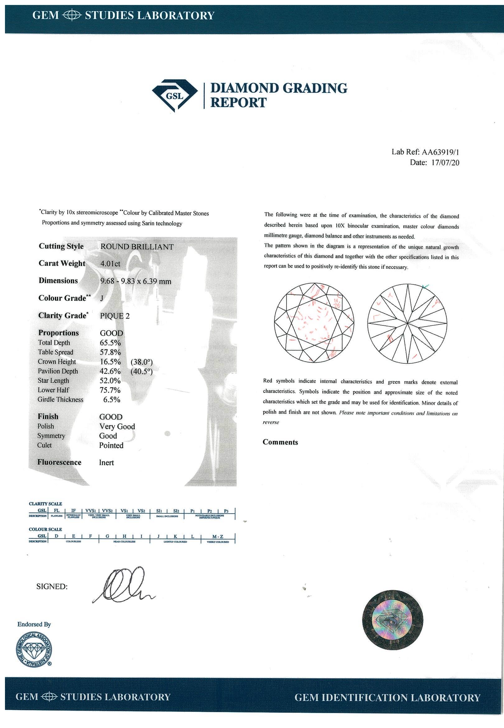 Diamond halo ring with a centre round brilliant cut Diamond of 4.01ct (With GSL Report graded as J P2 #AA63919/1) and remaining Diamonds totalling 0.43cts. 18ct white gold. Ring size K. Weight: 5.9g. (New)