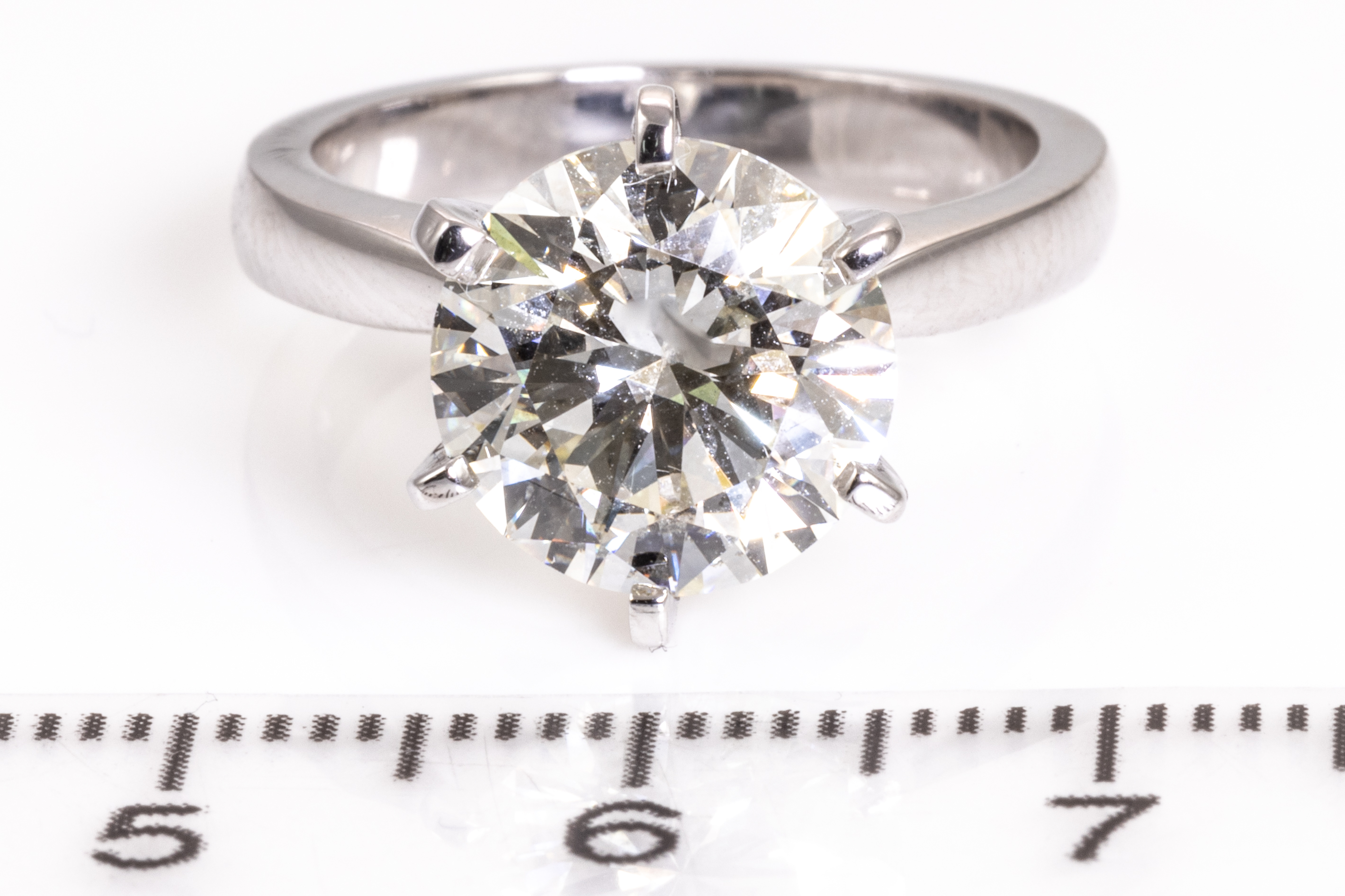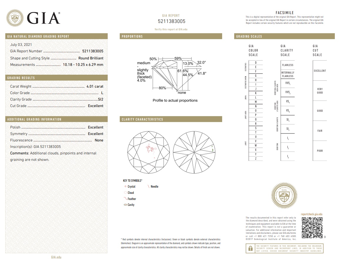 Diamond Solitaire ring with round brilliant cut Diamond of 4.01ct (with GIA report graded as L SI2 #5211383005) 18ct white gold. Ring size L. Weight: 6.4g. (New)