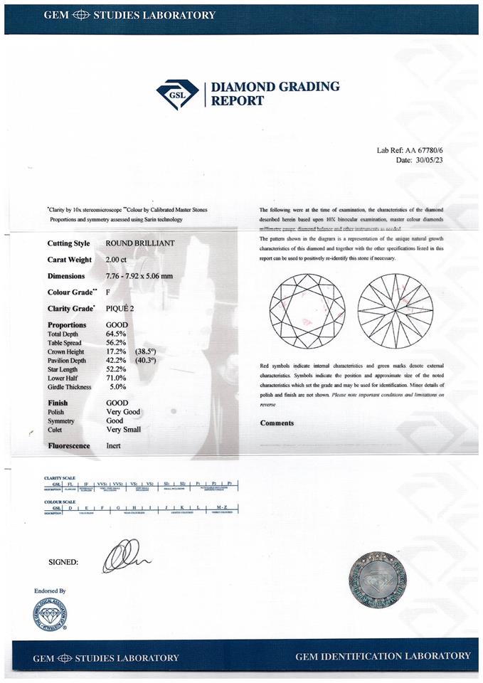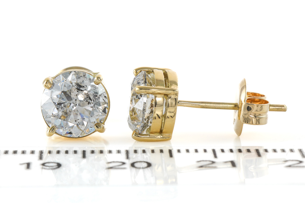 Diamond stud earrings with 2 round brilliant cut Diamonds totalling 4.02cts (Both with GSL Report graded as F P2 #AA67780/5, AA67780/6). 18ct yellow gold. Weight: 3.8g (New)