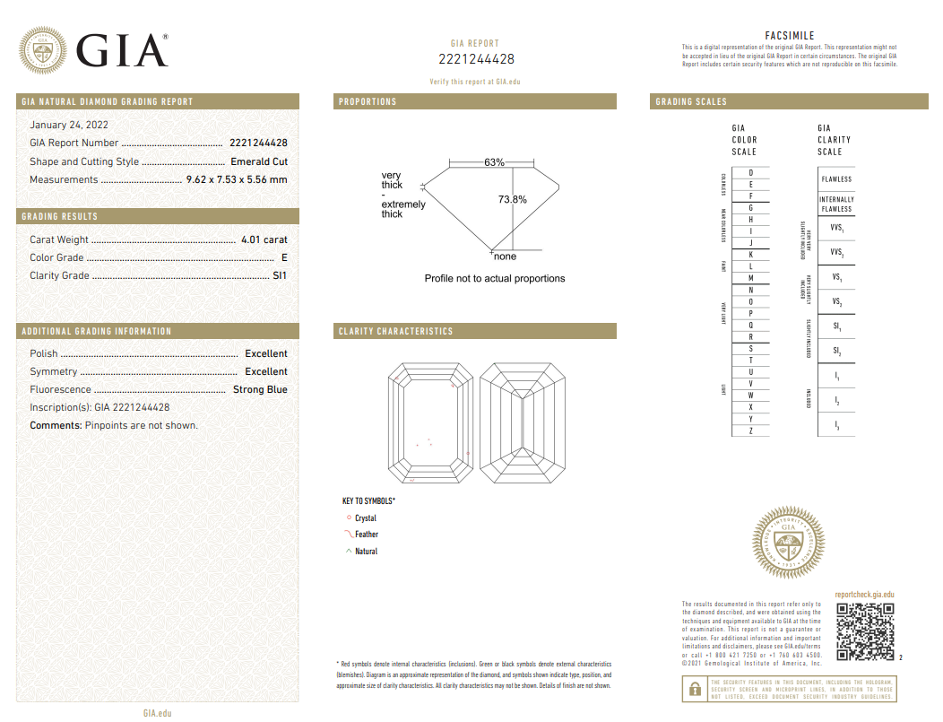 A loose Emerald cut Diamond of 4.01ct (With GIA report graded as E SI1 #2221244428