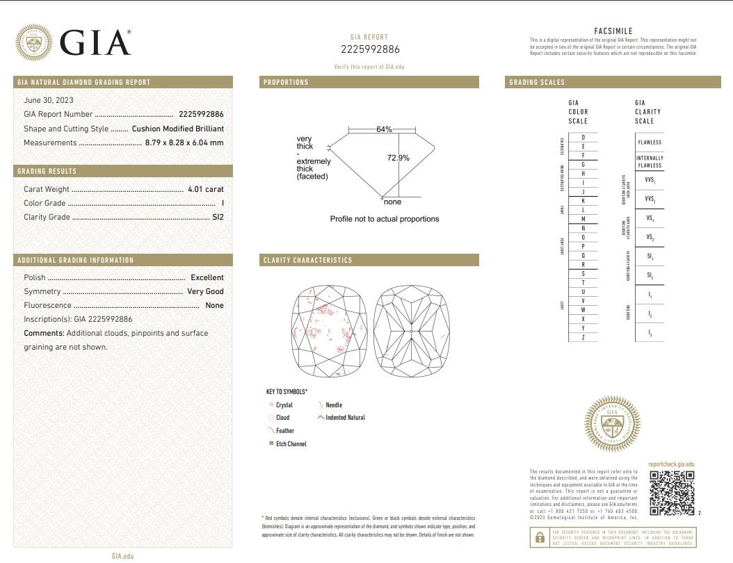 A loose cushion cut Diamond of 4.01ct (with GIA report graded as I SI2 #2225992886). (New)<br><br><STRONG>*Shipping:</STRONG> <BR>This item will be dispatched 7 working days after full payment is received <BR><BR><STRONG>*Viewing:</STRONG> <BR>Pre-auction viewing is unavailable for this item