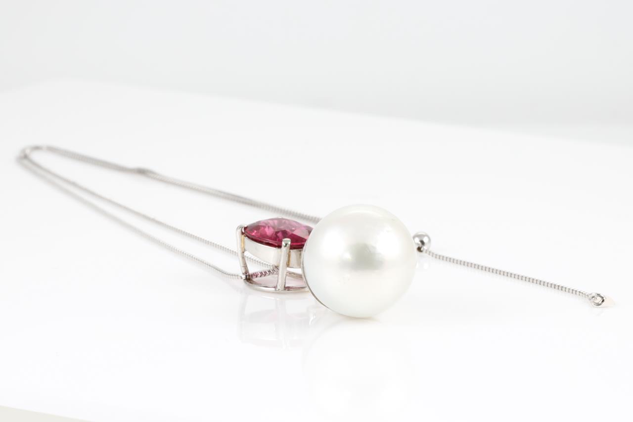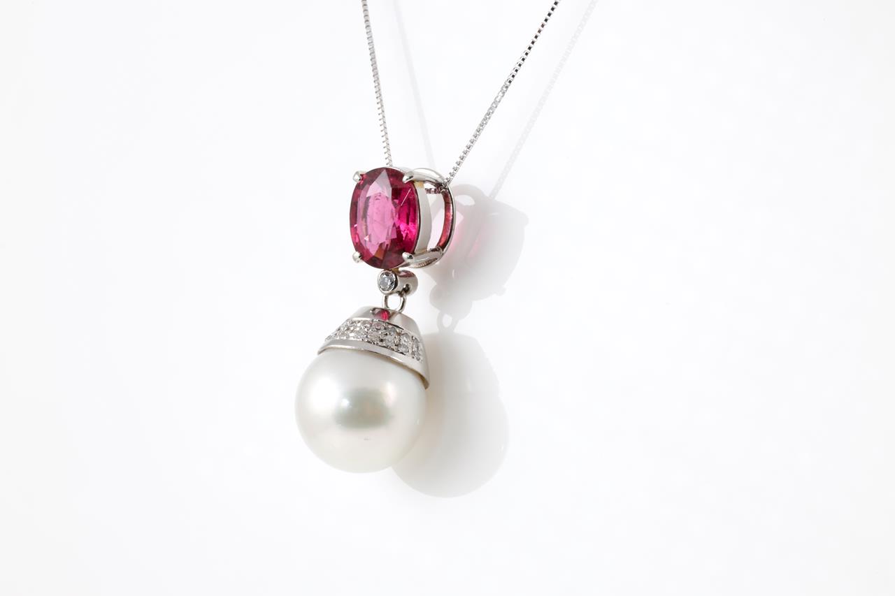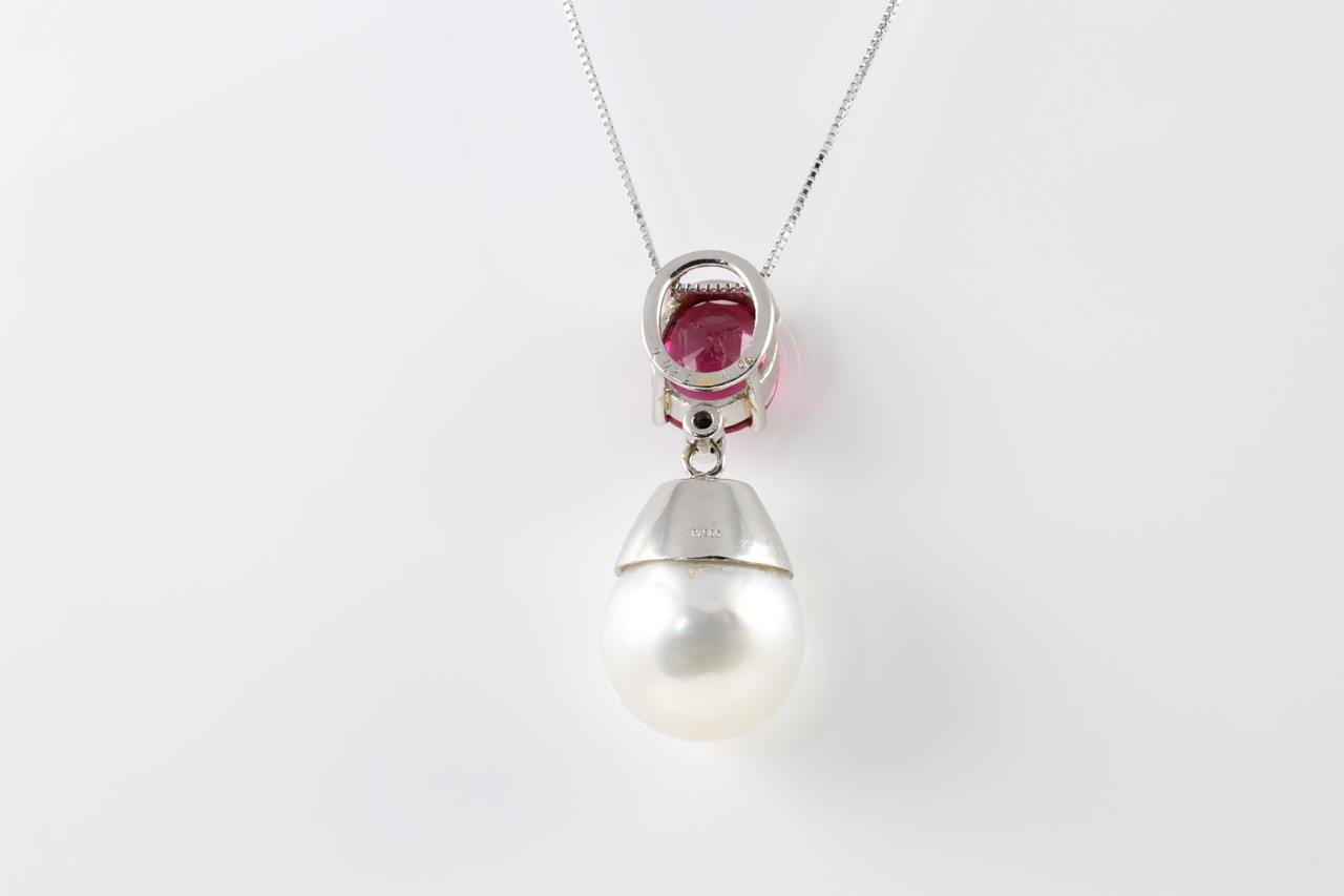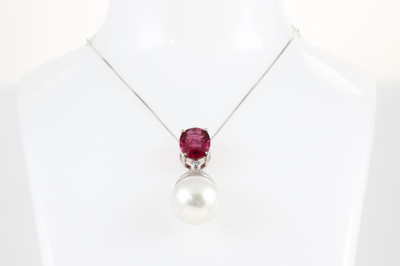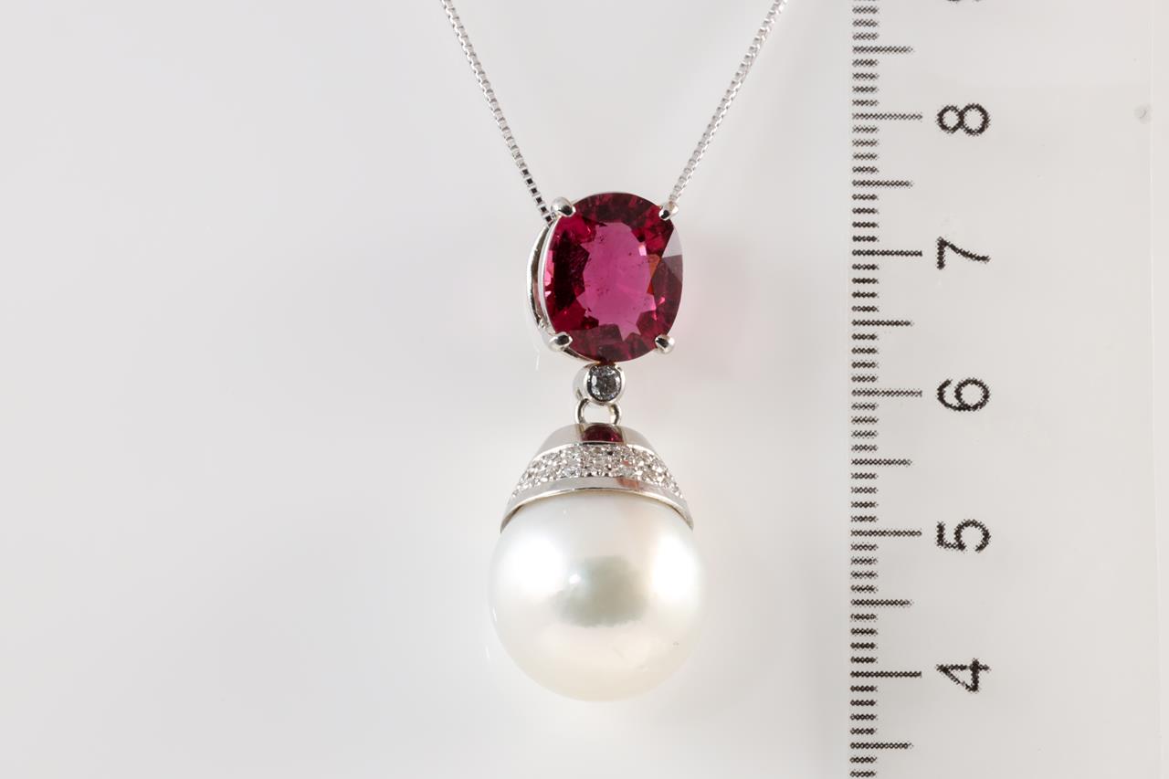 Tourmaline, Pearl and Diamond pendant with oval deep pink Tourmaline of 4.01ct, South Sea Pearl of 15.2mm and Diamonds totalling 0.25cts. Platinum with 18ct white gold chain. Weight: 12.7g (Pre-owned)