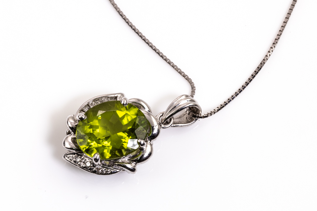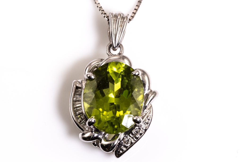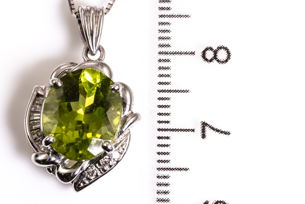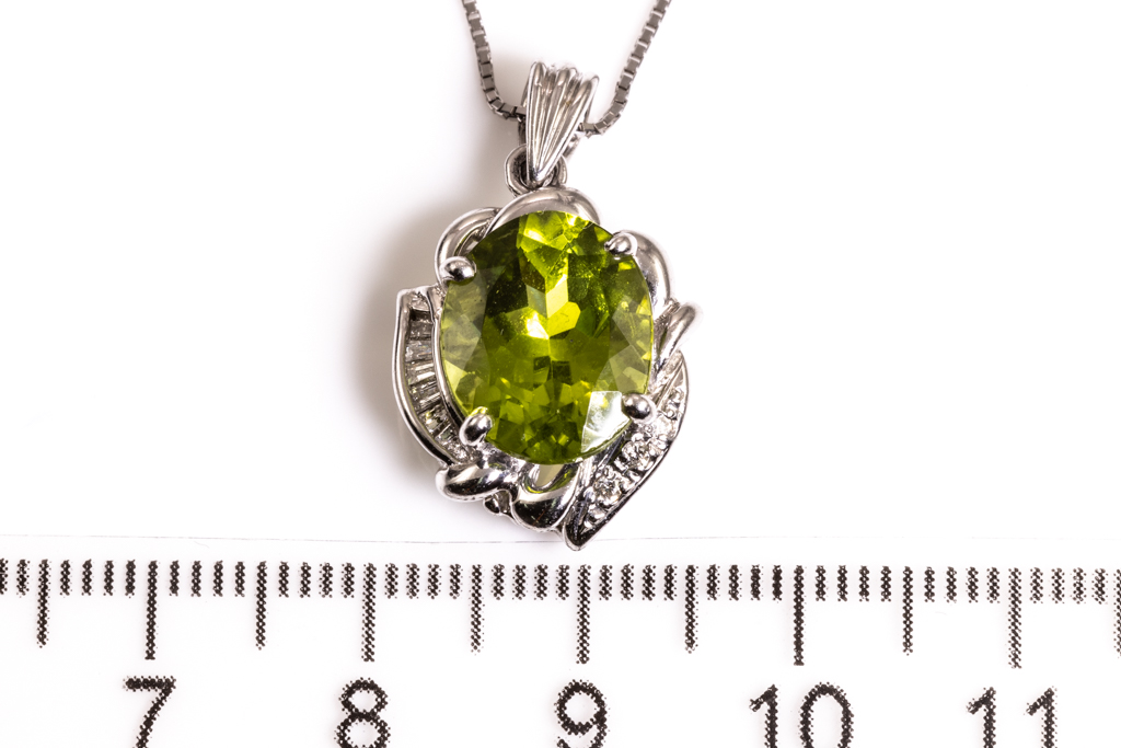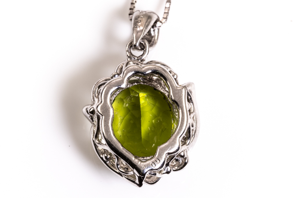 Peridot and Diamond pendant with oval shape Peridot of approximately 4.02ct and Diamonds totalling approximately 0.20cts. Platinum with 18ct white gold adjustable chain. Length: 44cm. Weight: 7.3g. (Pre-owned)