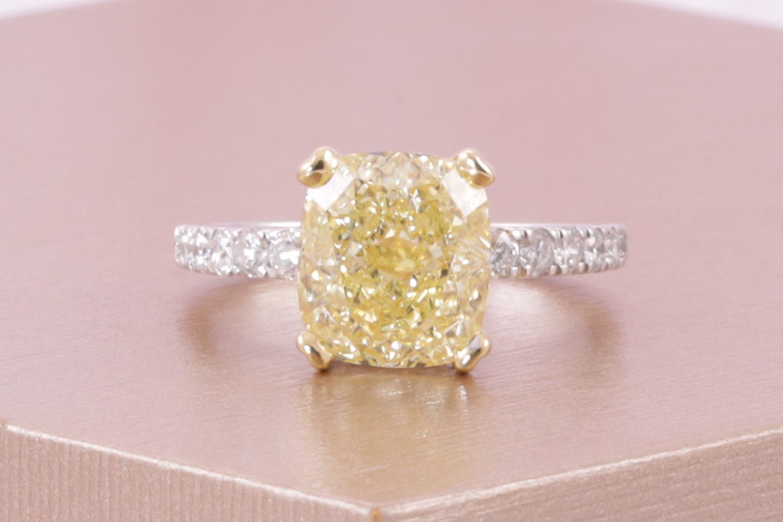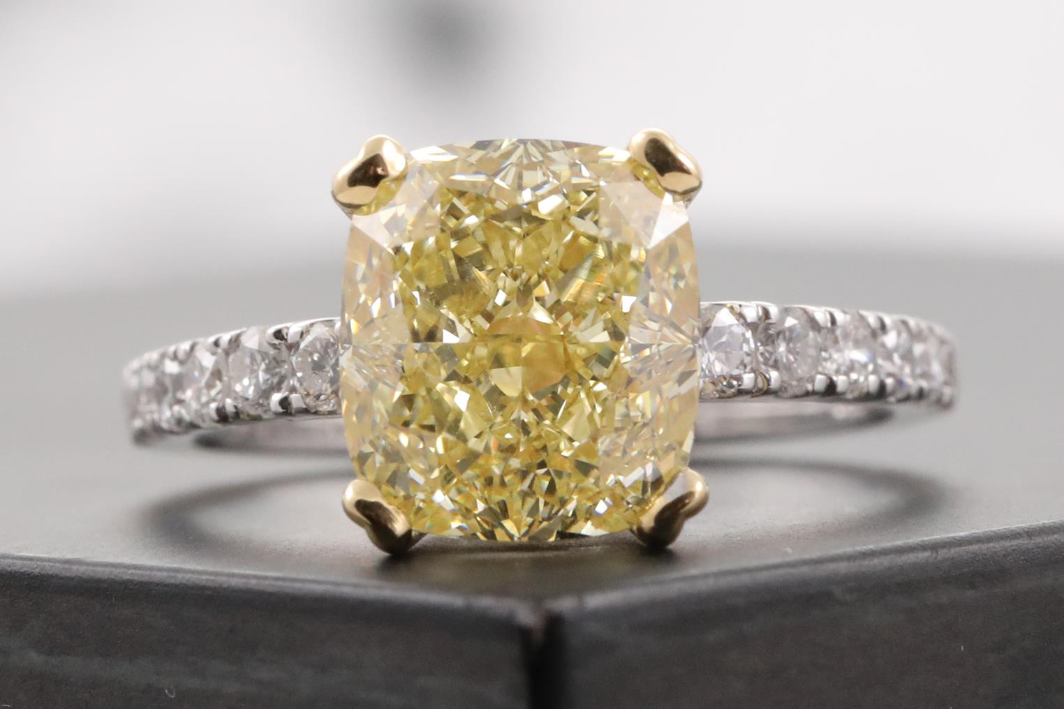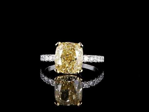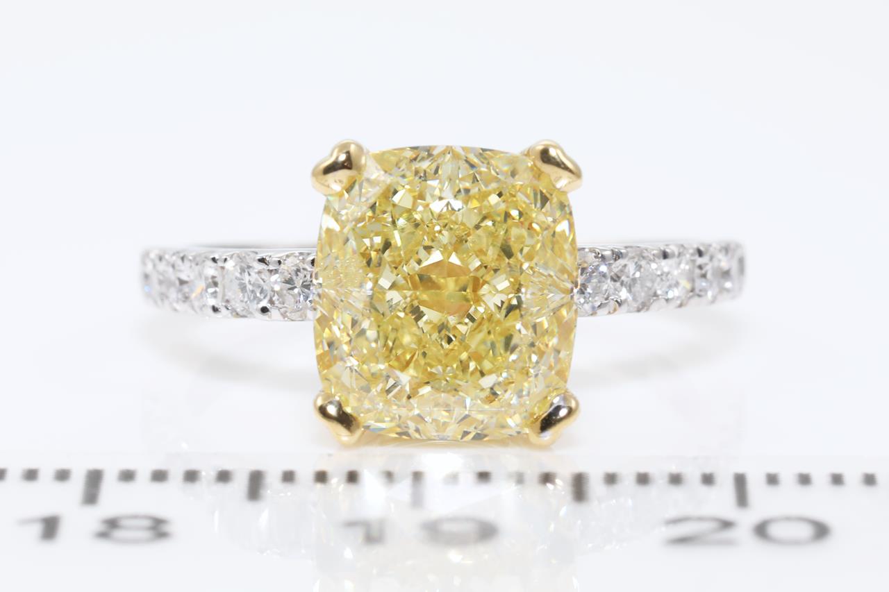 Diamond Ring with Centre Cushion Cut Diamond of 4.03ct (with GIA report graded as Natural Fancy Yellow Even SI2 #5211014832) and 12 shoulder diamonds totalling 0.33cts (Estimated grading: G SI). Ring size M. Weight: 4.5g (New)