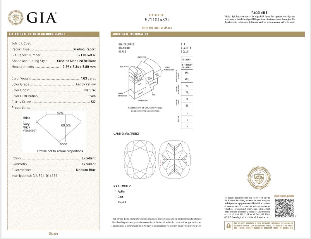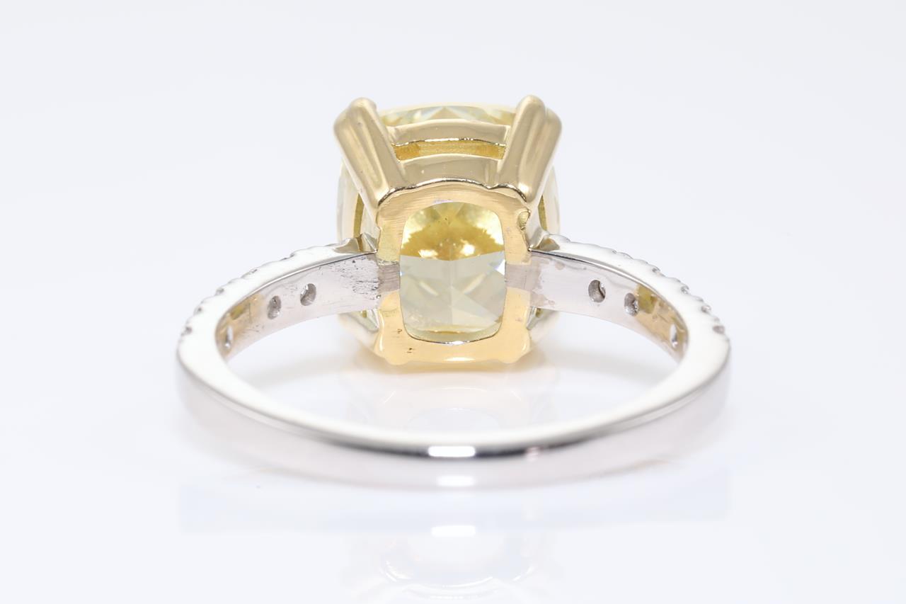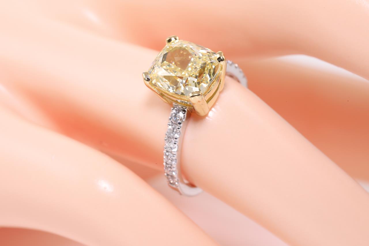 Diamond Ring with Centre Cushion Cut Diamond of 4.03ct (with GIA report graded as Natural Fancy Yellow Even SI2 #5211014832) and 12 shoulder diamonds totalling 0.33cts (Estimated grading: G SI). Ring size M. Weight: 4.5g (New)