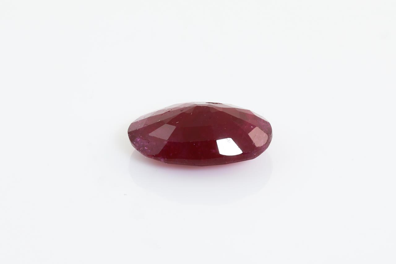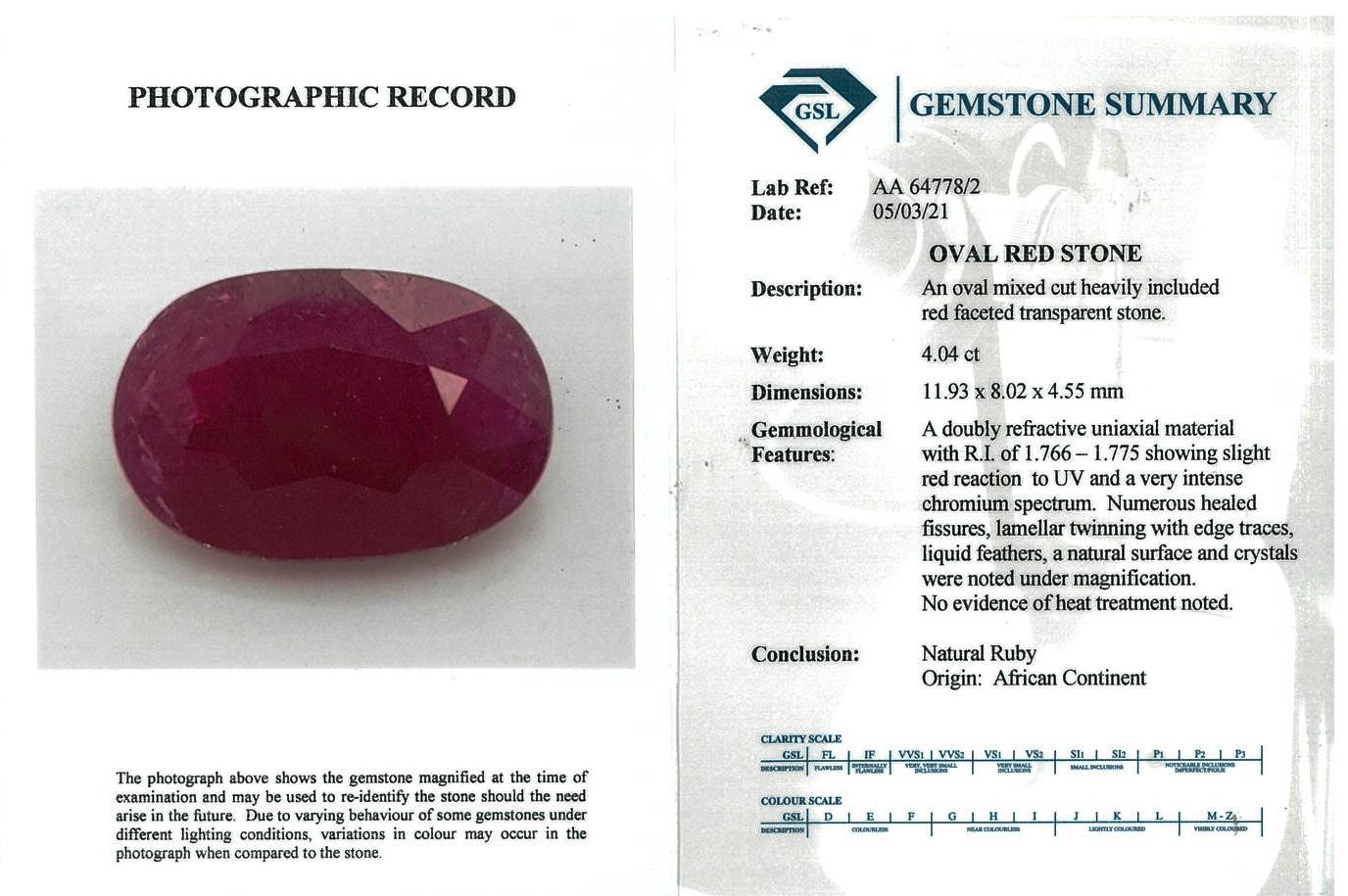 A loose oval shape African Ruby of 4.04ct (with GSL Gemstone summary #AA 64778/2). Approximate size: 11.93mm x 8.02mm x 4.55mm. (As New)