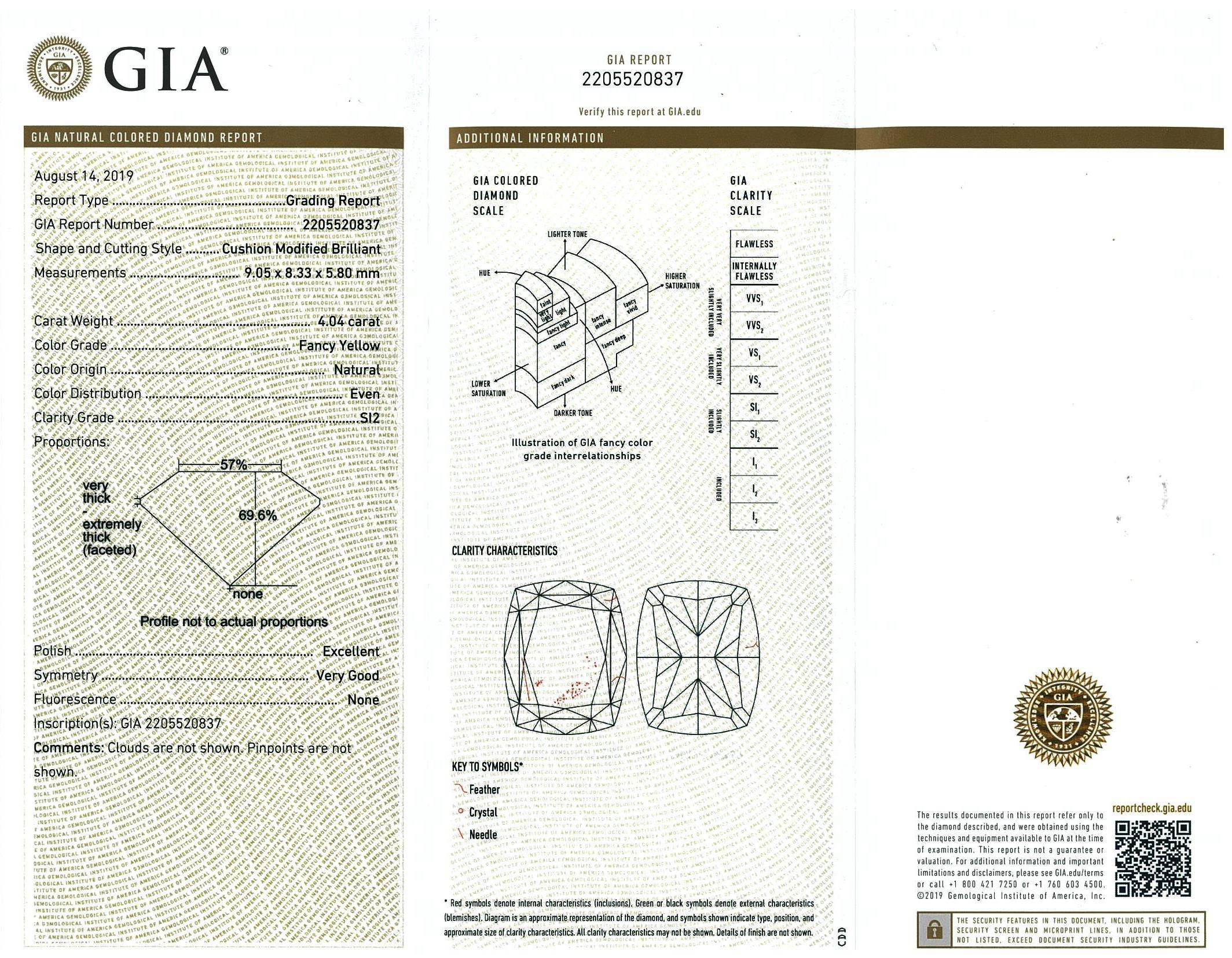 A loose cushion cut Diamond of 4.04ct (with GIA report graded as Natural Fancy Yellow Even SI2 #2205520837). (New)
