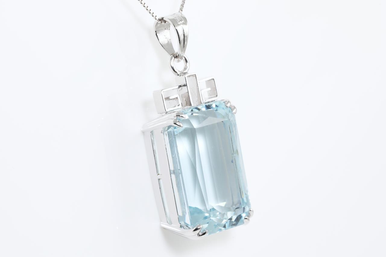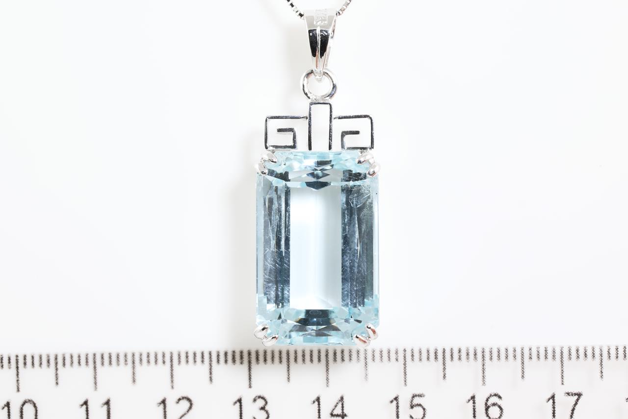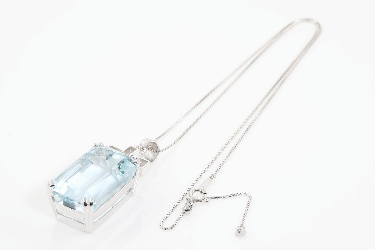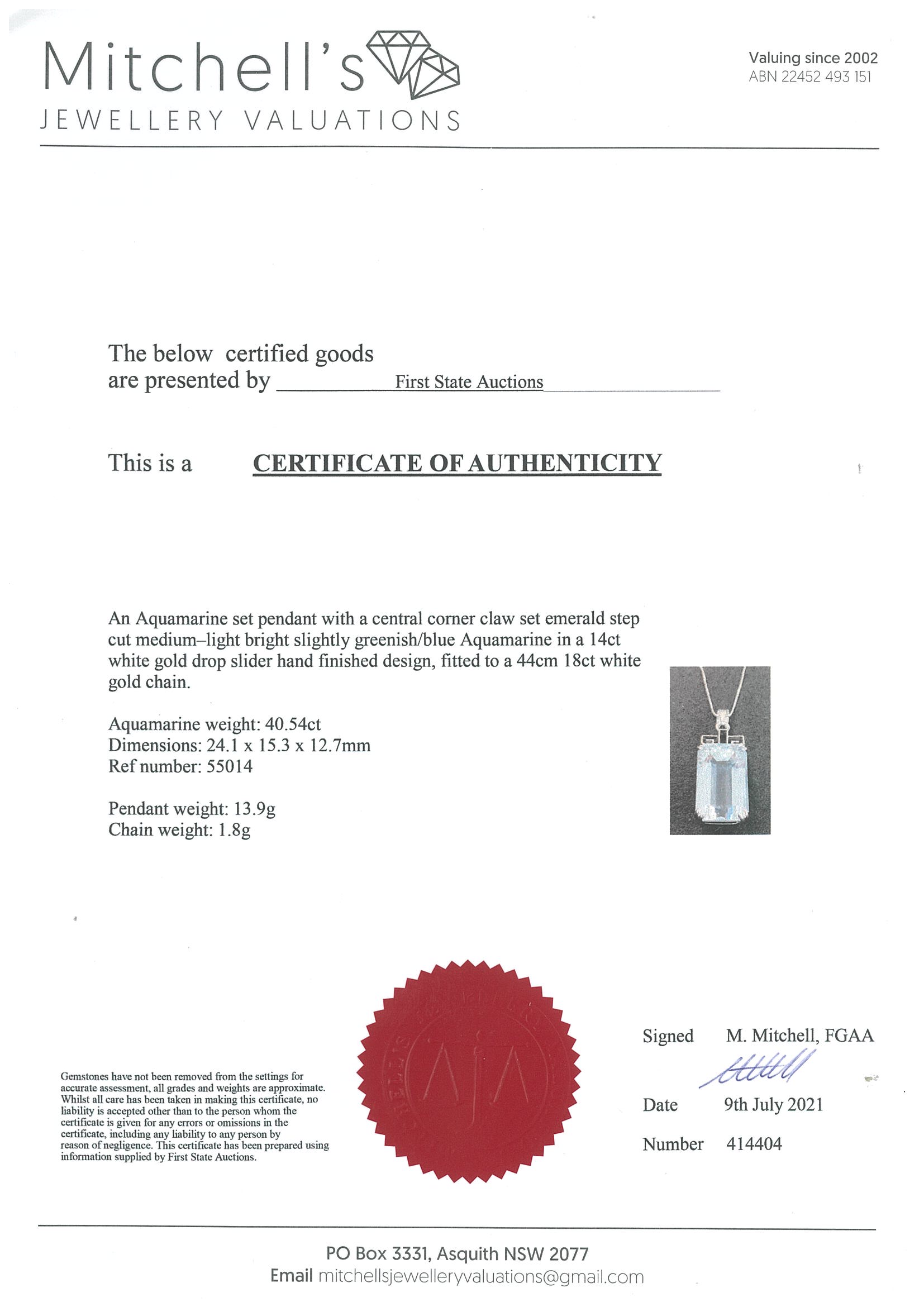 Aquamarine pendant with an emerald cut Aquamarine of 40.54ct. 14ct white gold with 18ct gold adjustable 44cm chain. Weight: 15.7g. With certificate #414404. (Pre-owned)