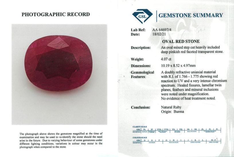 A loose oval shape Burmese Ruby of 4.07ct (with GSL Gemstone summary report #AA 64697/4). Size: 10.1mm x 8.5mm x 4.9mm. (New)