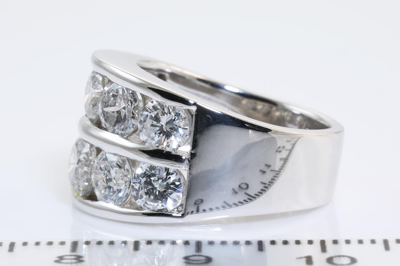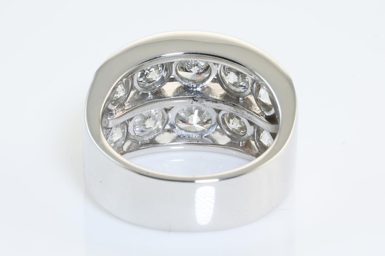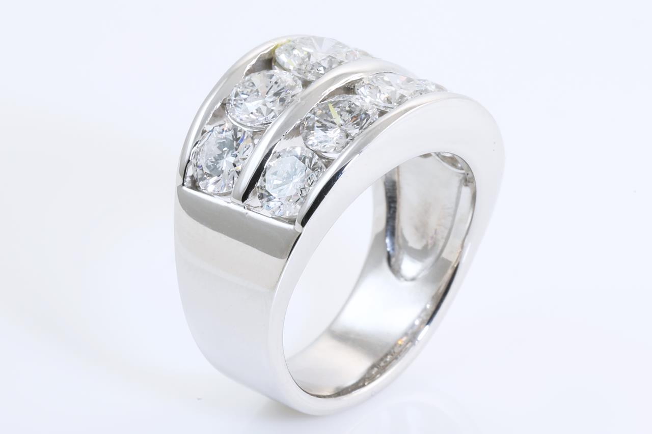 Diamond Dress Ring with 2 rows of channel set round brilliant cut Diamonds totalling 4.10cts (Estimated grading: G-H P1). Platinum. Ring size: L1/2. Note this ring cannot be resized up, it can be resized down by ring clip only. Weight: 14.9g. With Certificate (Pre-owned)