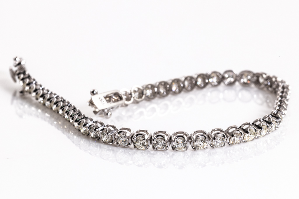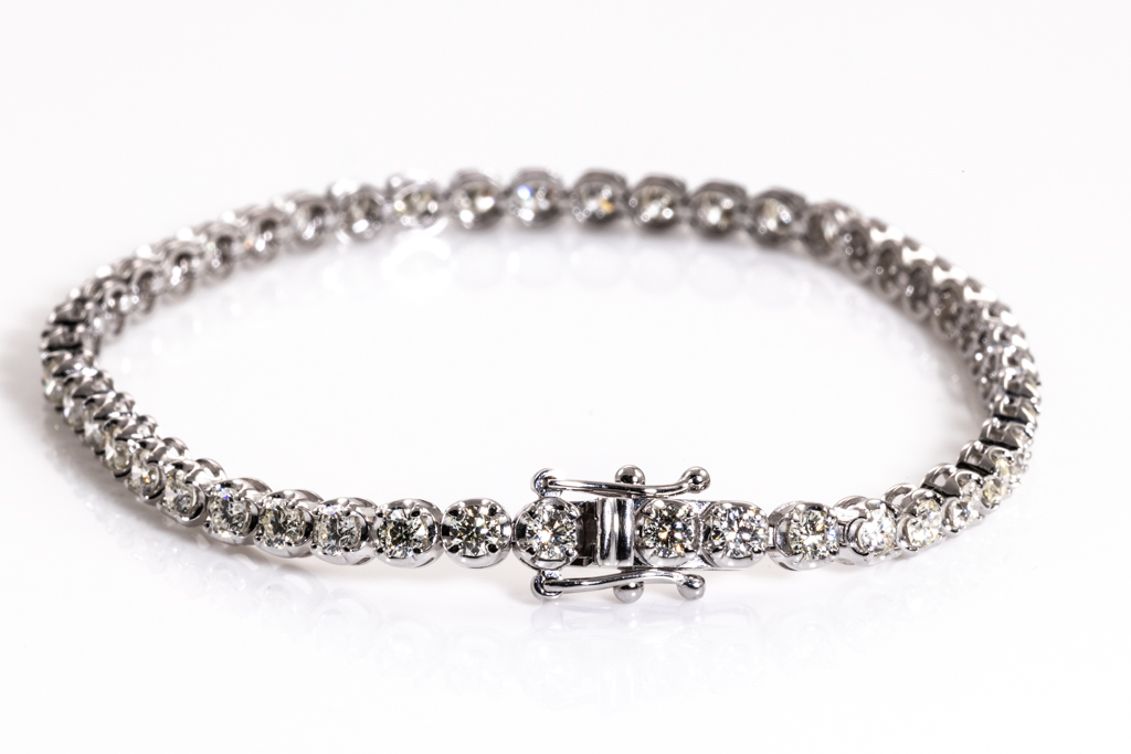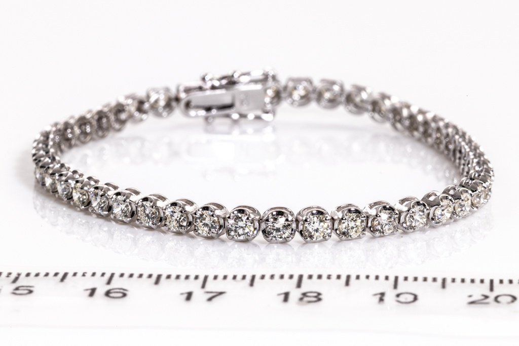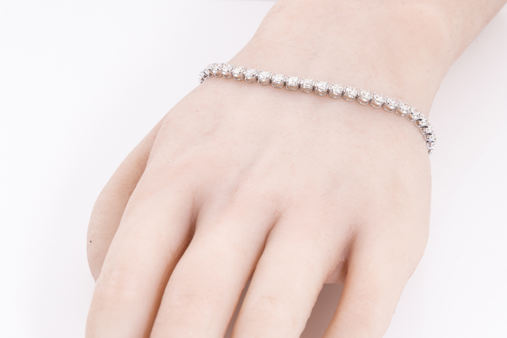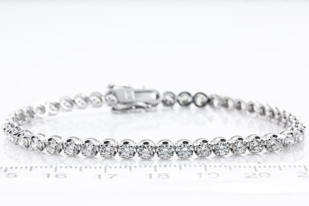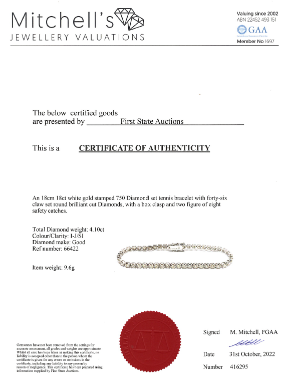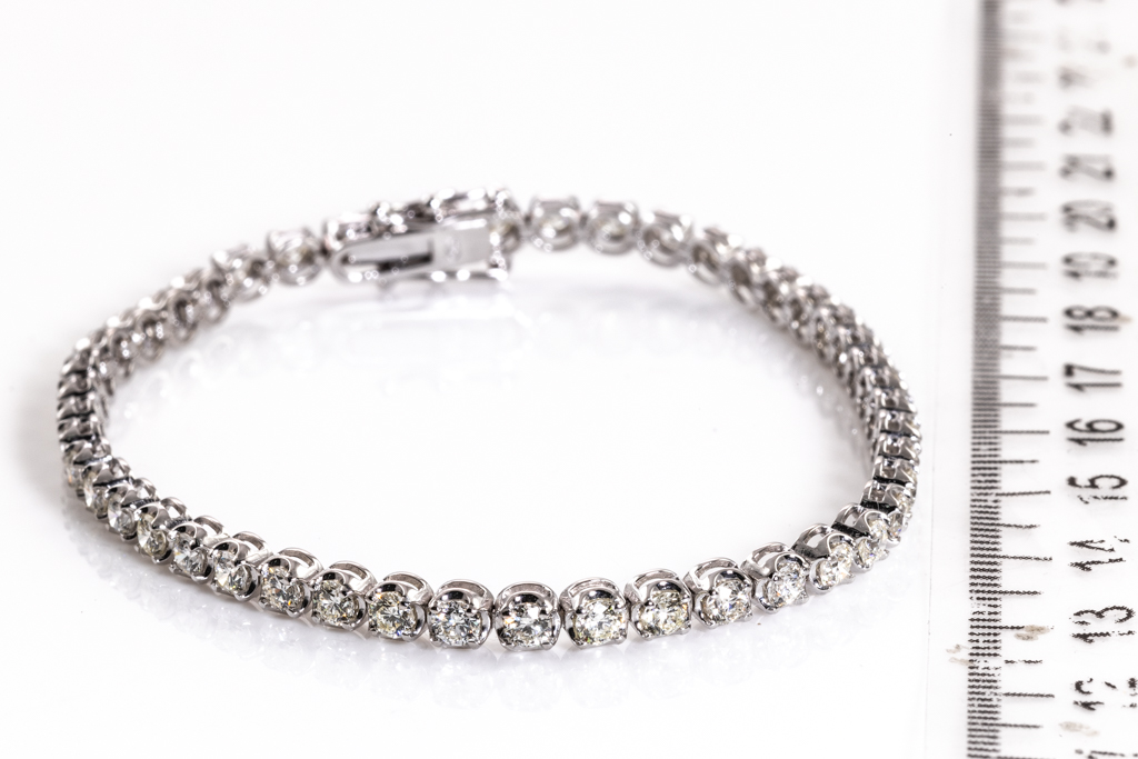 Diamond tennis bracelet with 46 round Diamonds totalling 4.10cts. (Estimated grading: I-J SI). 18ct white gold. Length: 18cm. Weight: 9.6g. With Certificate #416295. (New)