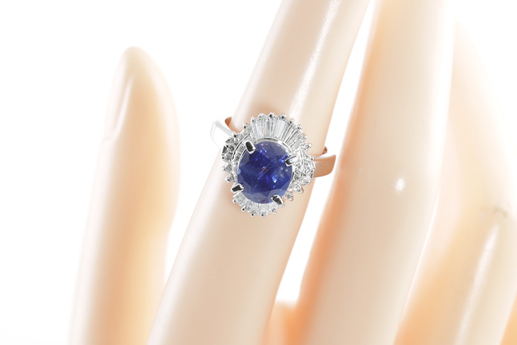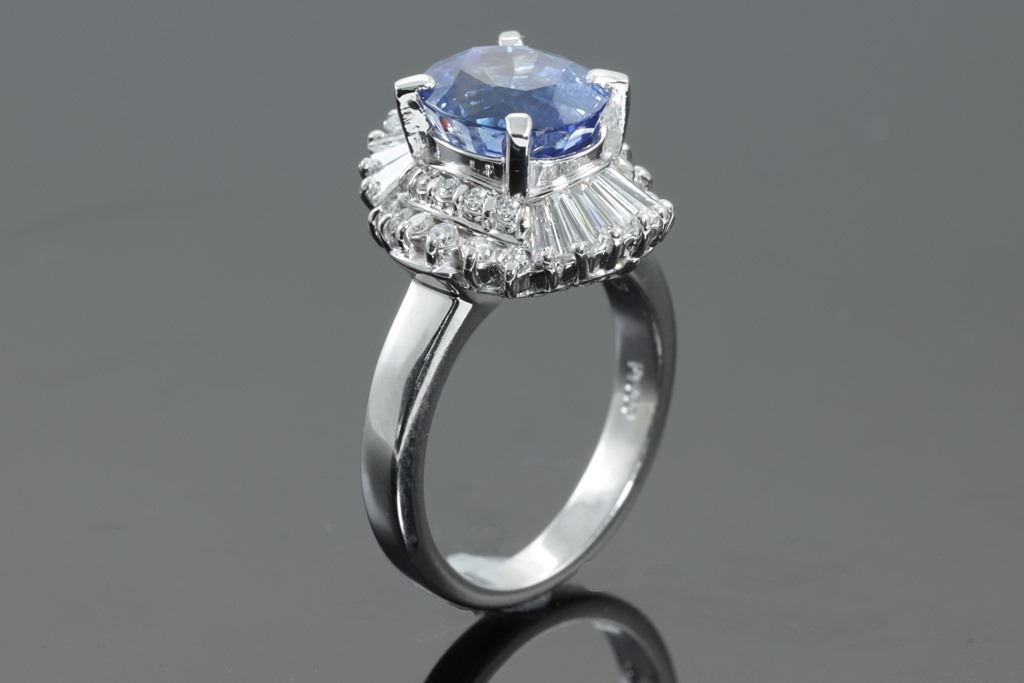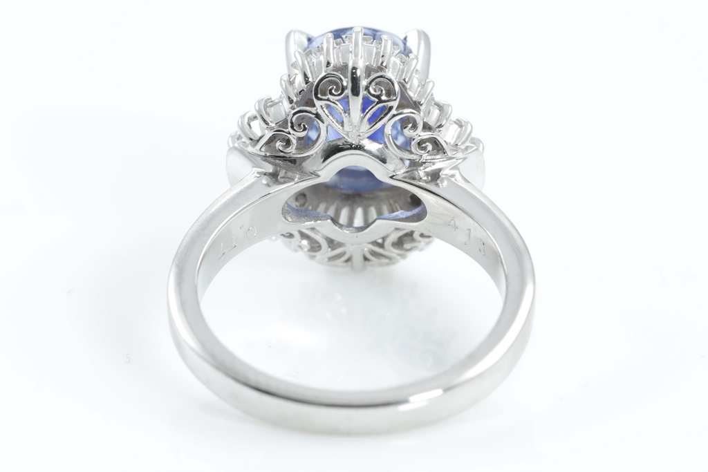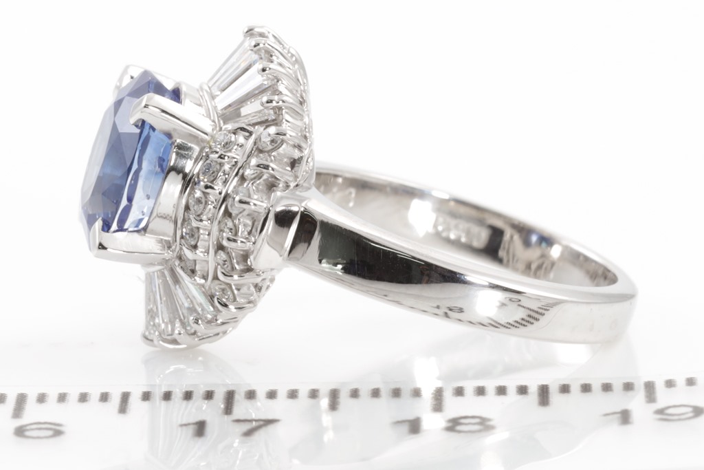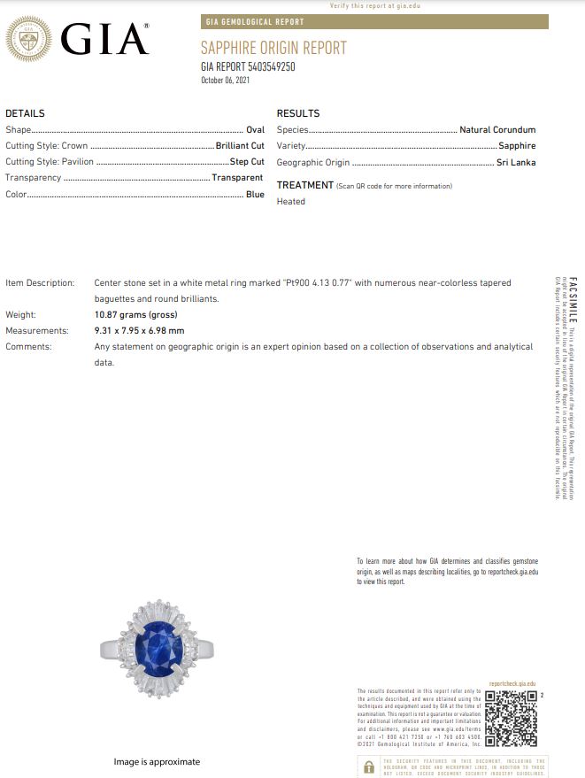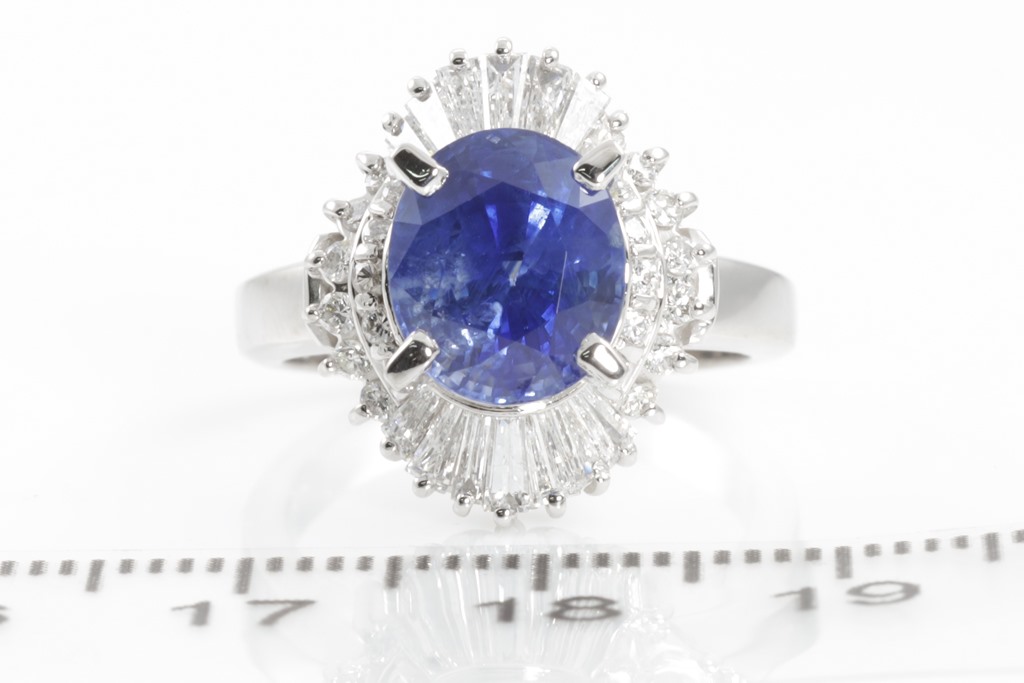 Sapphire and Diamond Ring with centre oval shape blue Sri Lankan Sapphire of 4.13ct and round & baguette cut Diamonds totalling 0.77cts (Estimated grading: G SI). Platinum. Ring size: K. Weight: 10.8. With GIA Report #5403549250. (Pre-owned)