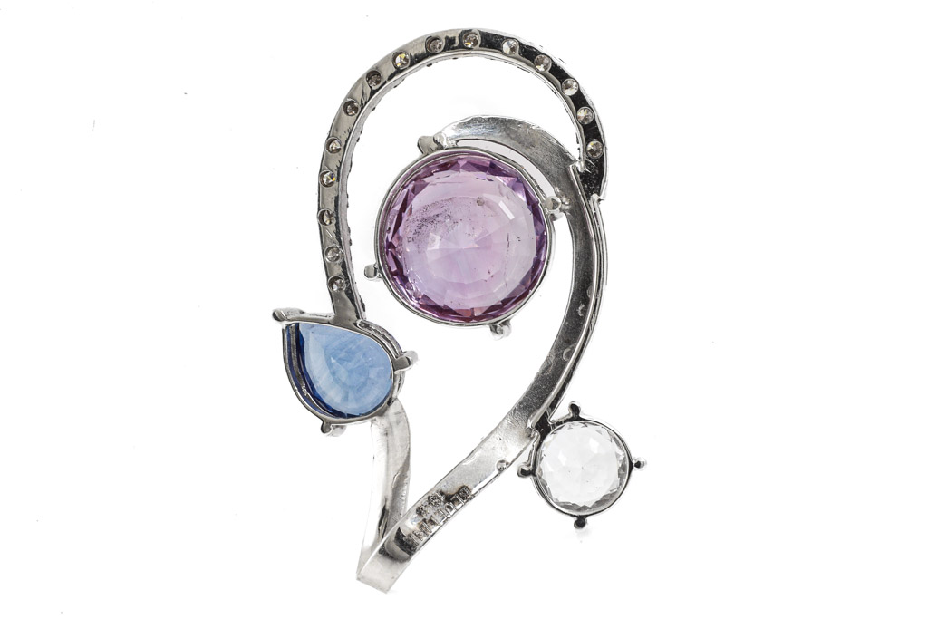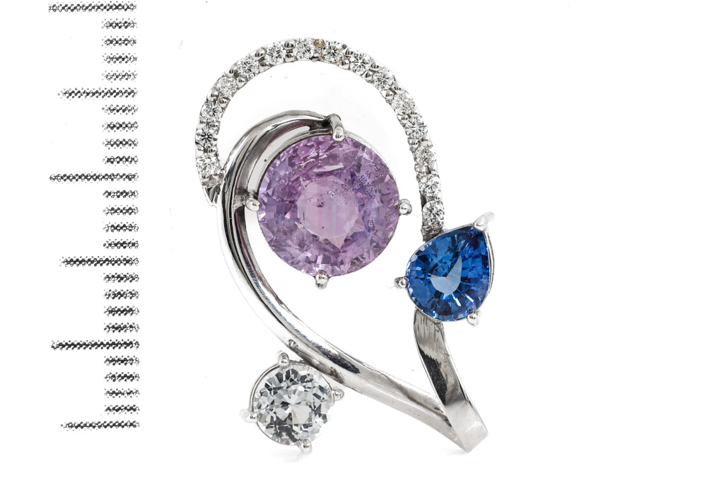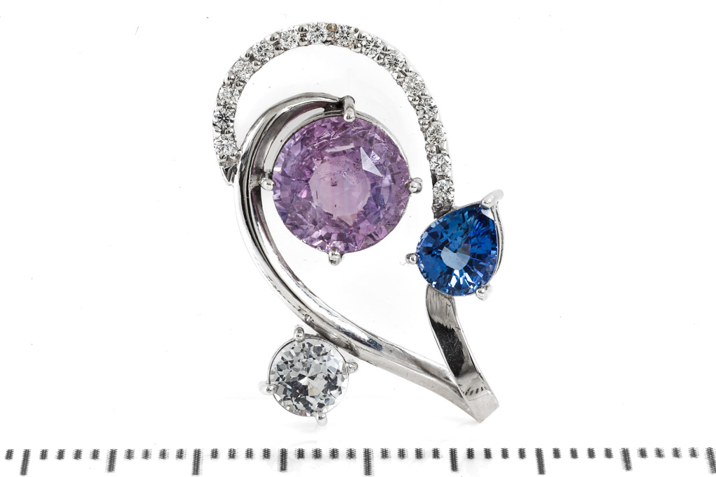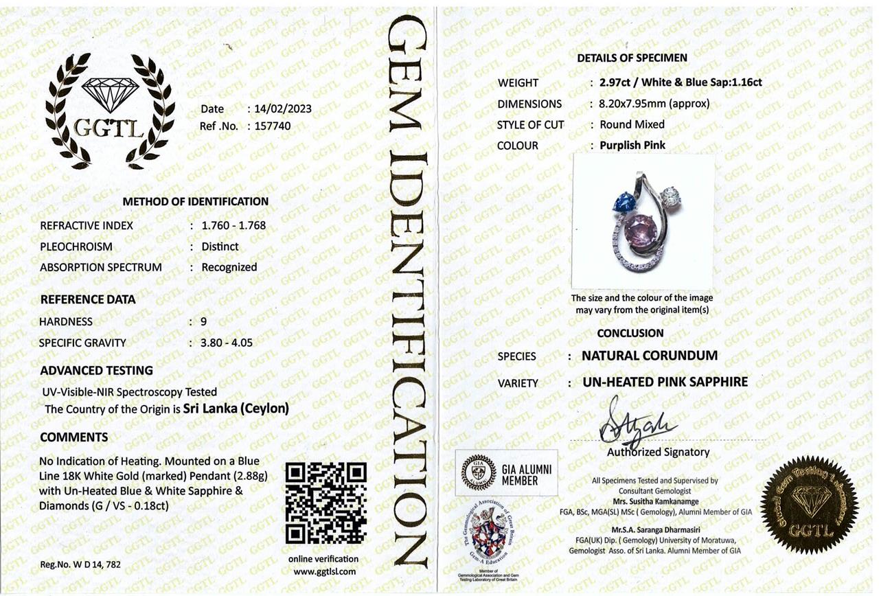 Sapphire and Diamond pendant with unheated Ceylon round pink Sapphire of 2.79cts, pear & round shape blue & white Sapphire totalling 1.16cts and round Diamonds totalling 0.18cts.. 18ct white gold. No chain provided. Weight: 2.8g. With Certificate GGTL #157740. (Pre-owned)