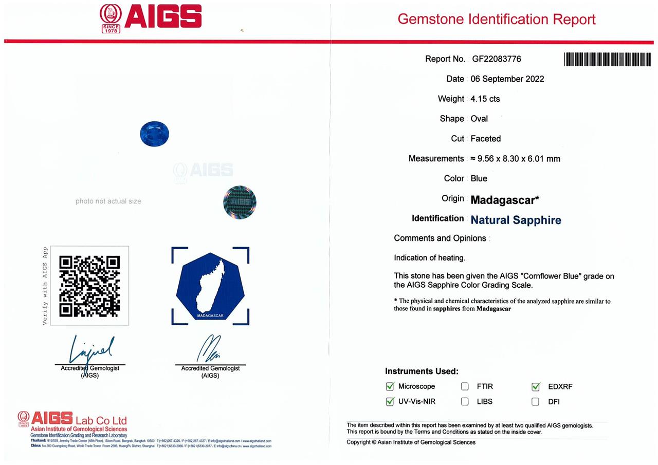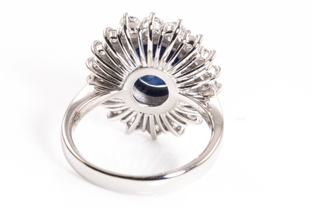 Sapphire and Diamond ring with oval Cornflower Blue Madagascar Sapphire of 4.15ct and round Diamonds totalling 1.55cts (Estimated grading: G-H SI-P1). Platinum. Ring size M. Weight: 10.8g. (Pre-owned)