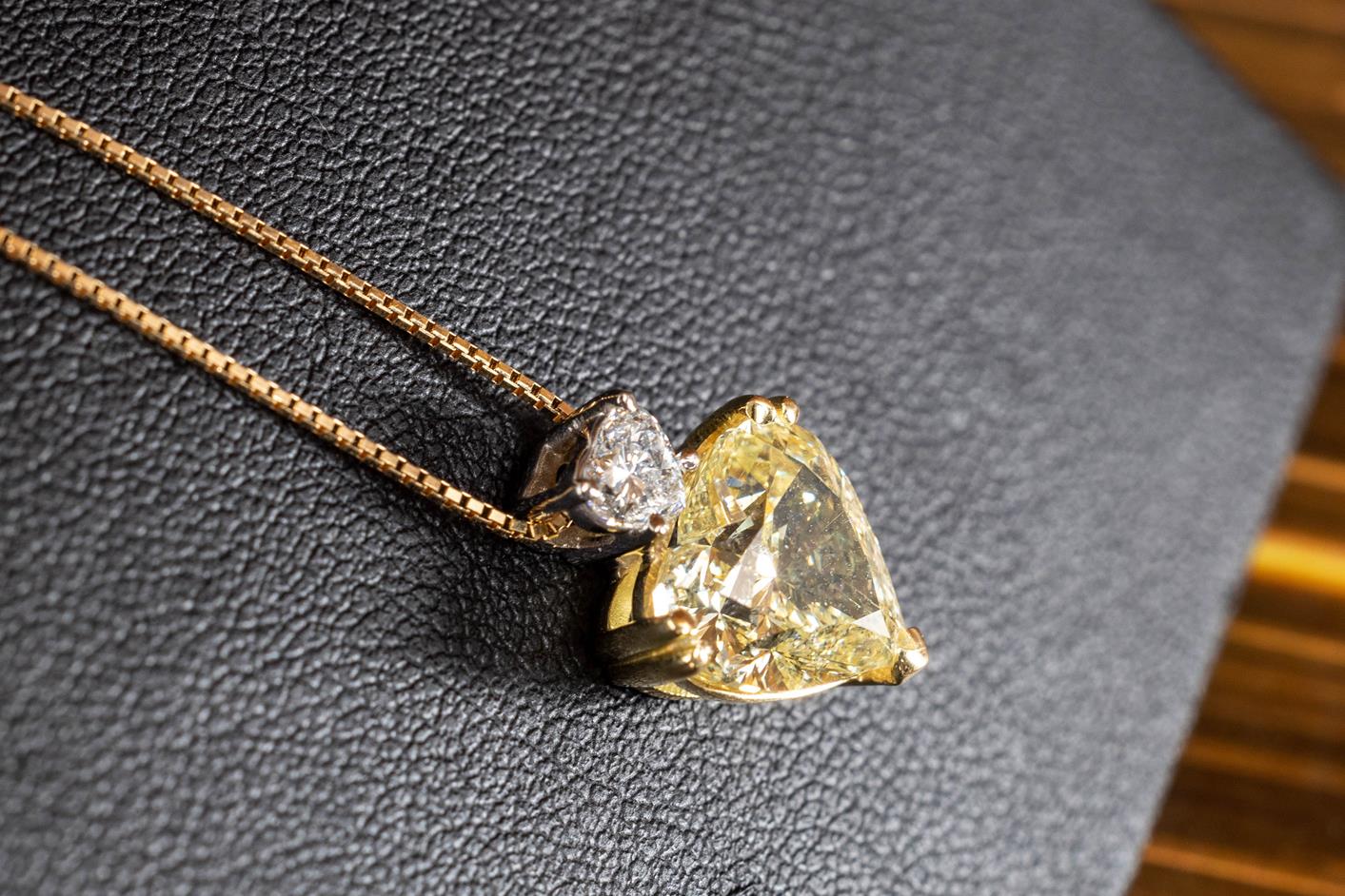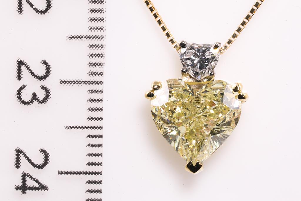 Diamond Pendant with heart shaped Diamond of 4.16ct (with HRD report graded as Natural Fancy Yellow #210000090766) and heart shaped diamond of 0.30cts (with GIA summary report graded as D VS2 #6401417845). 18ct yellow and white gold with 18ct yellow gold 44cm chain. Weight: 4.3g. (New)