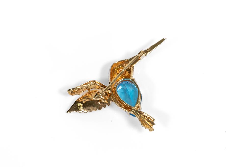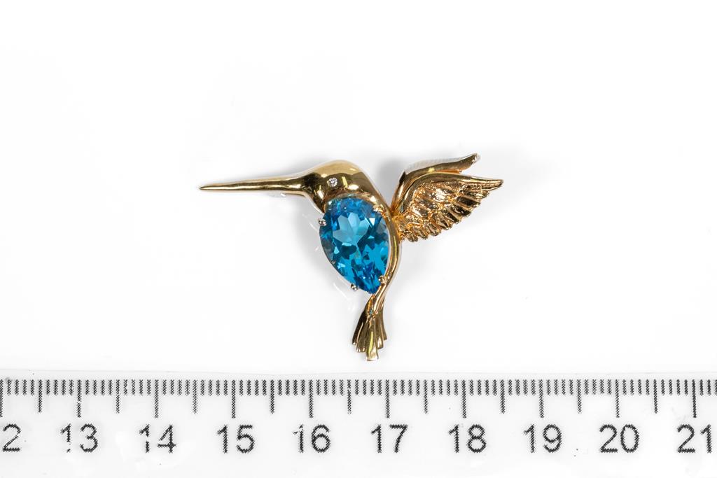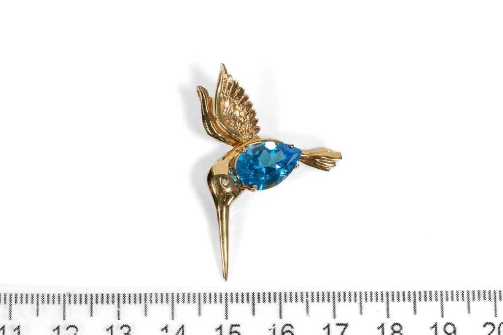 Topaz and Diamond bird designed brooch/pendant with pear shape Blue Topaz of approximately 4.17ct and a round Diamond of approximately 0.01ct. 18ct yellow gold. Weight: 4.9g. (Pre-owned)