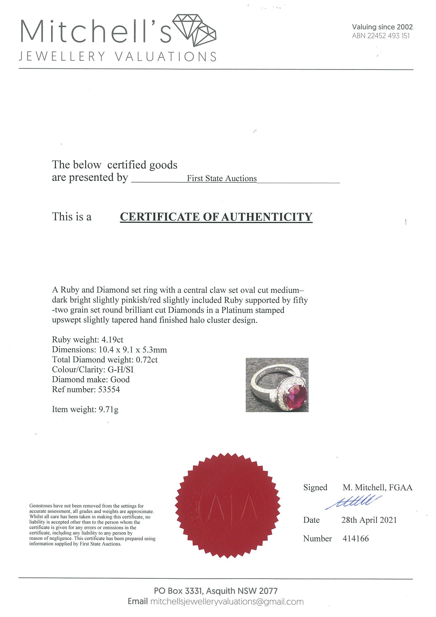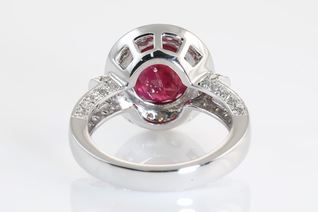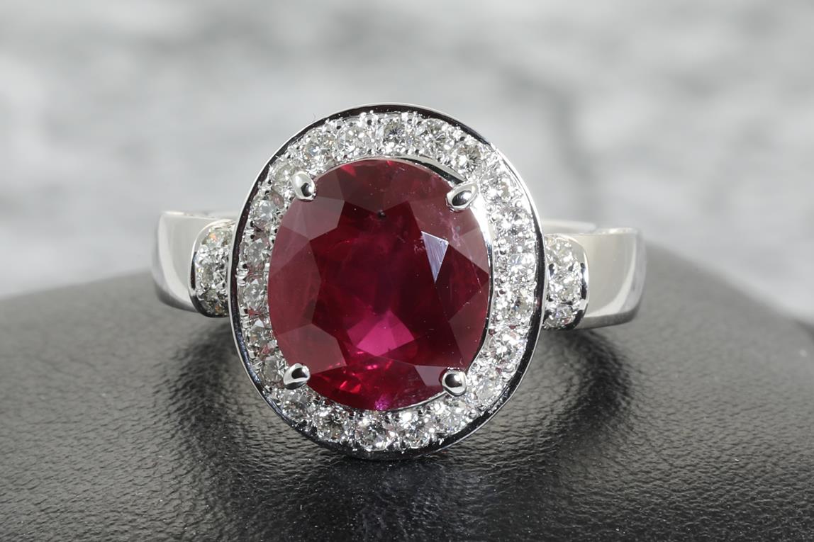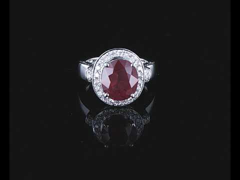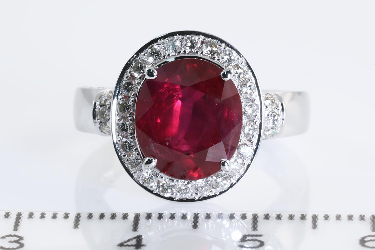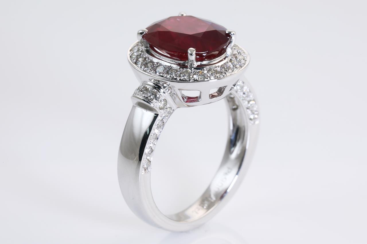 Ruby and Diamond ring with an oval Ruby of 4.19ct and Diamonds totalling 0.72cts (Estimated grading: GH SI). Platinum. Ring size K. Weight: 9.7g. With certificate #414166. (Pre-owned)