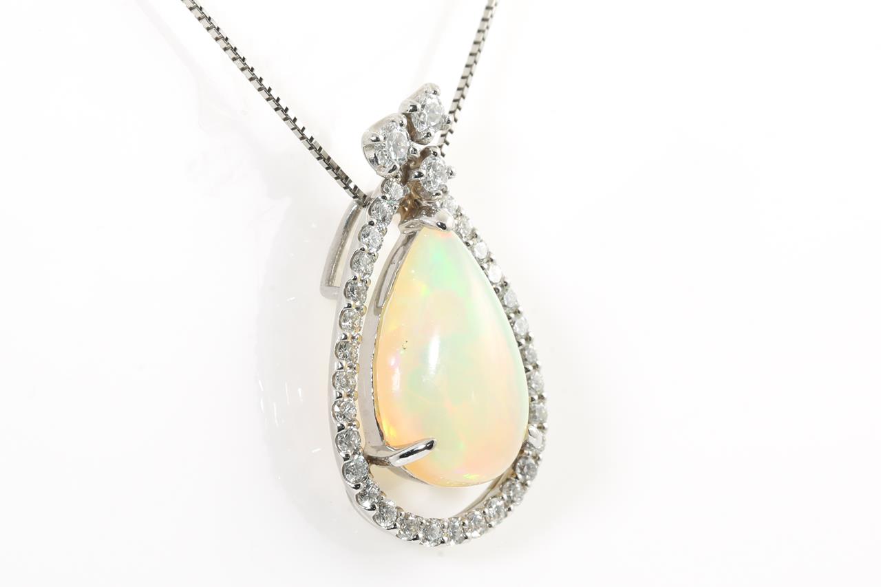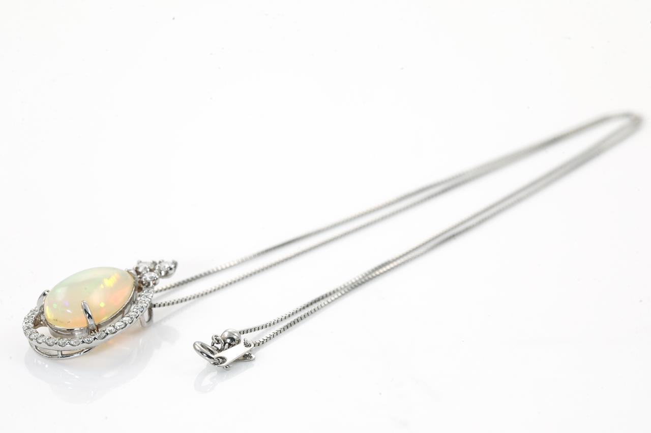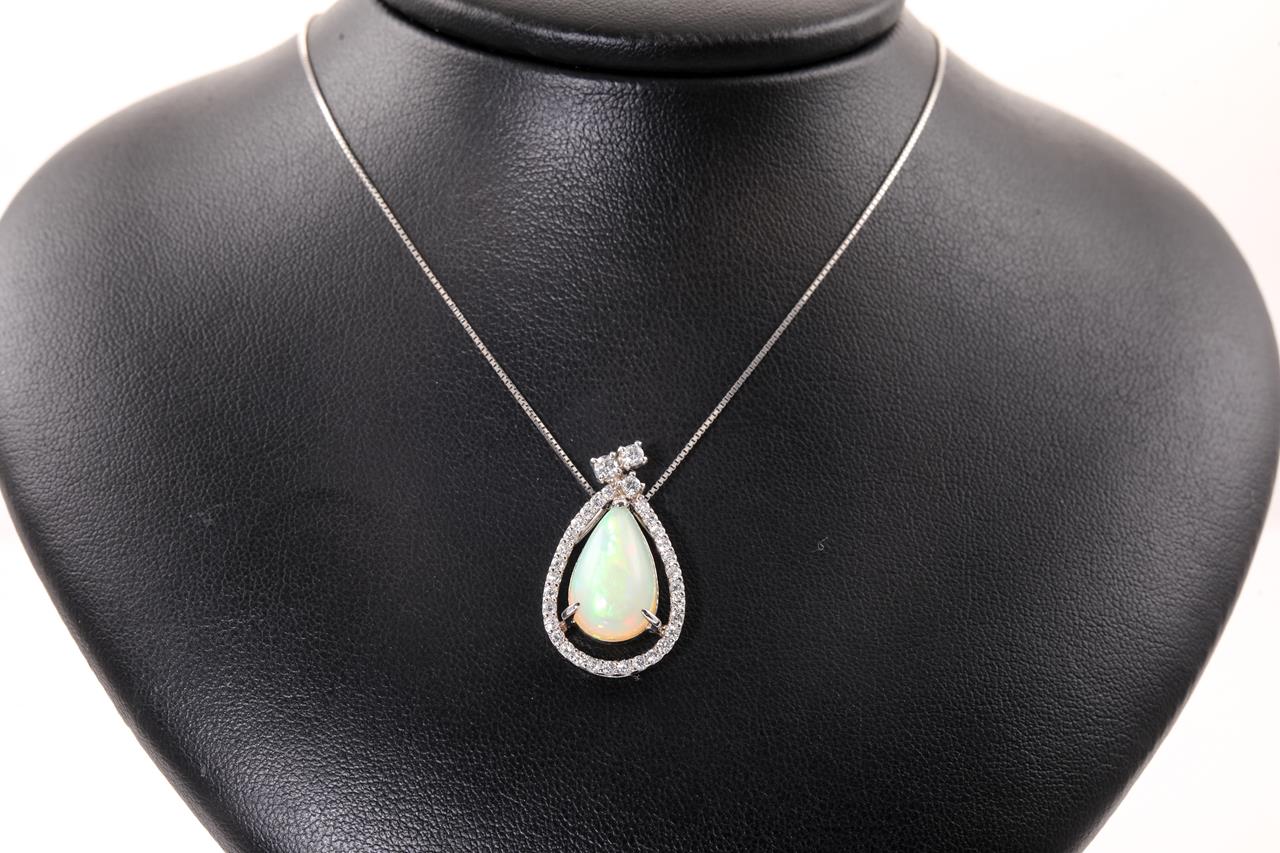 Opal and Diamond pendant with a pear cabochon cut Opal of 4.20ct and Diamond totalling 0.66cts (Estimated grading: G SI). Platinum with adjustable 45cm chain. Weight: 6.3g (Pre-owned)