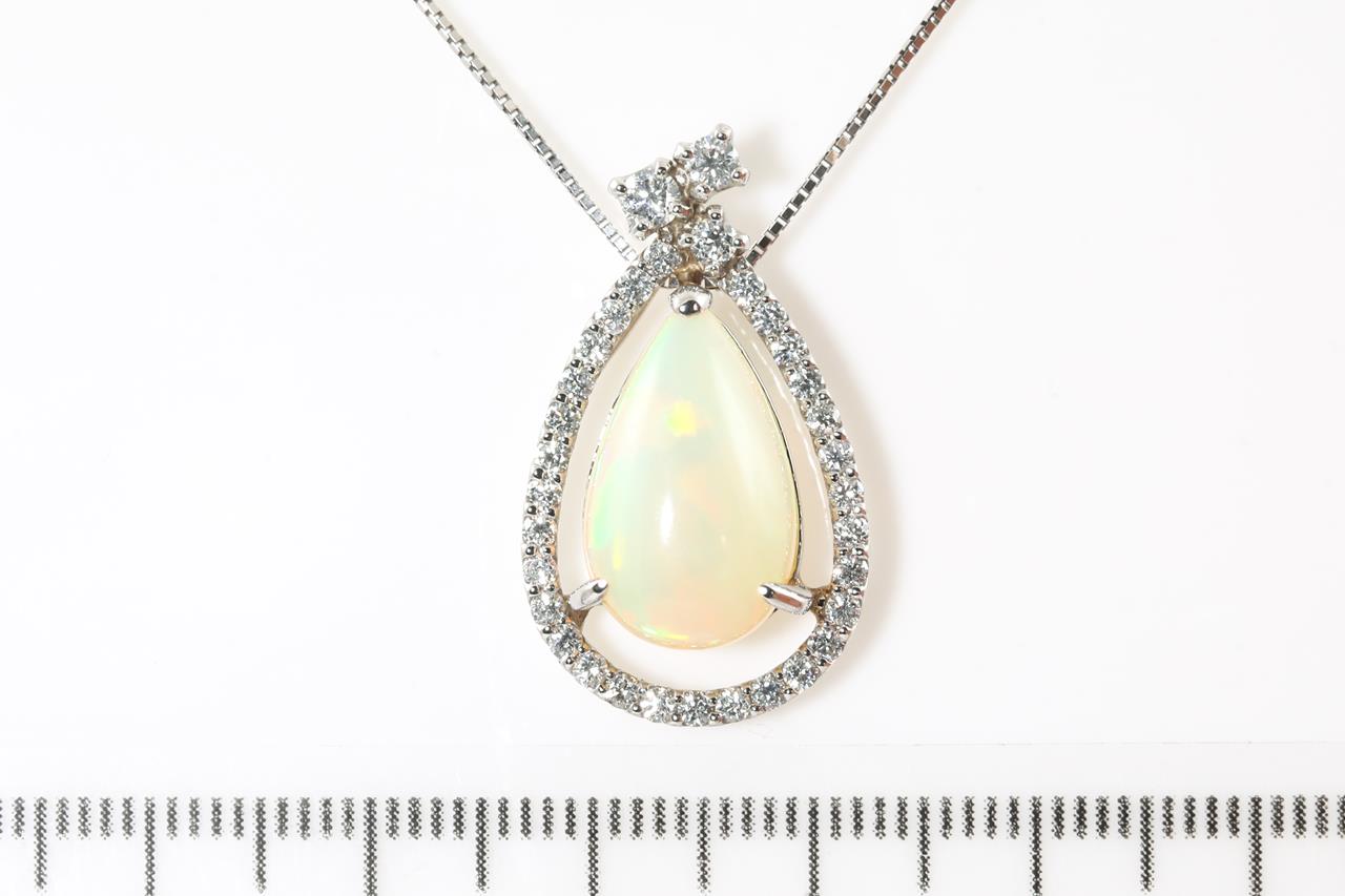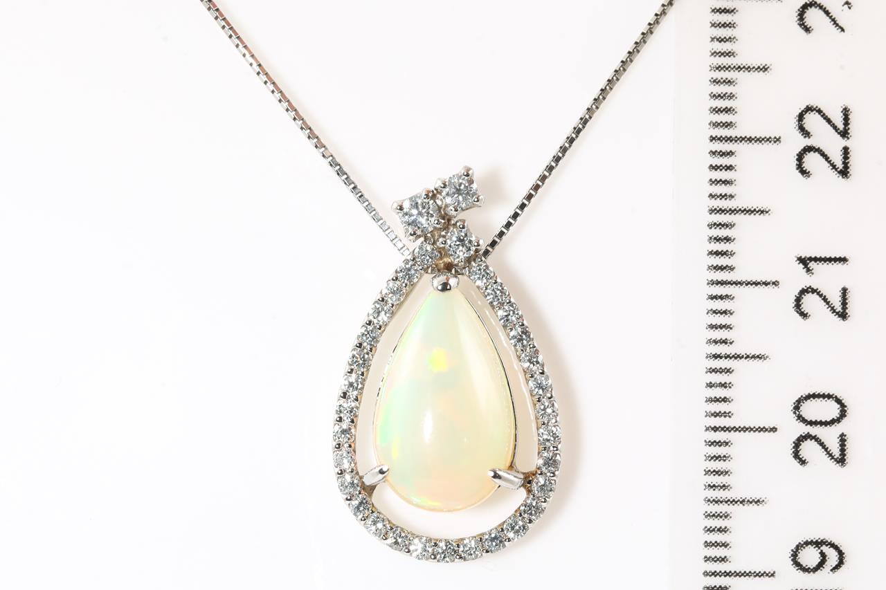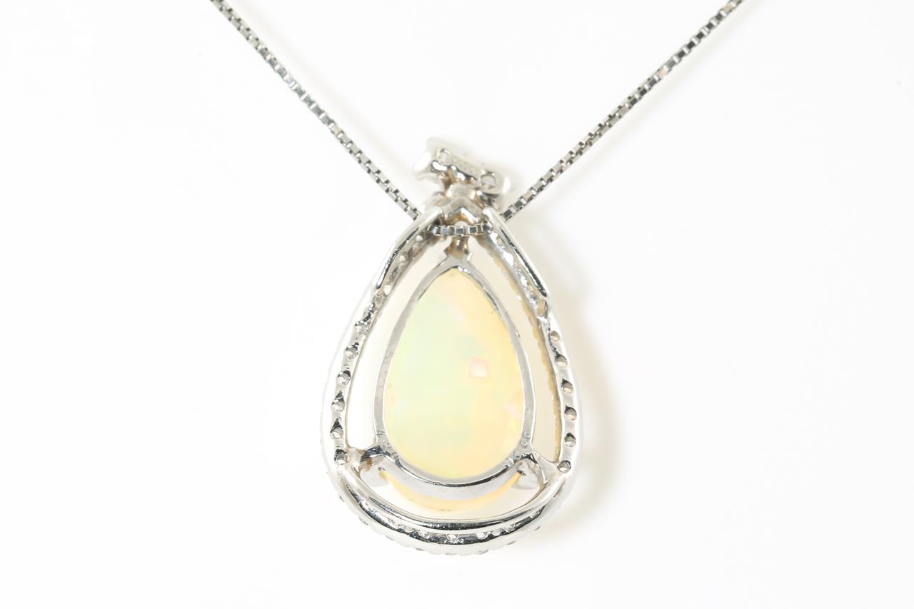 Opal and Diamond pendant with a pear cabochon cut Opal of 4.20ct and Diamond totalling 0.66cts (Estimated grading: G SI). Platinum with adjustable 45cm chain. Weight: 6.3g (Pre-owned)