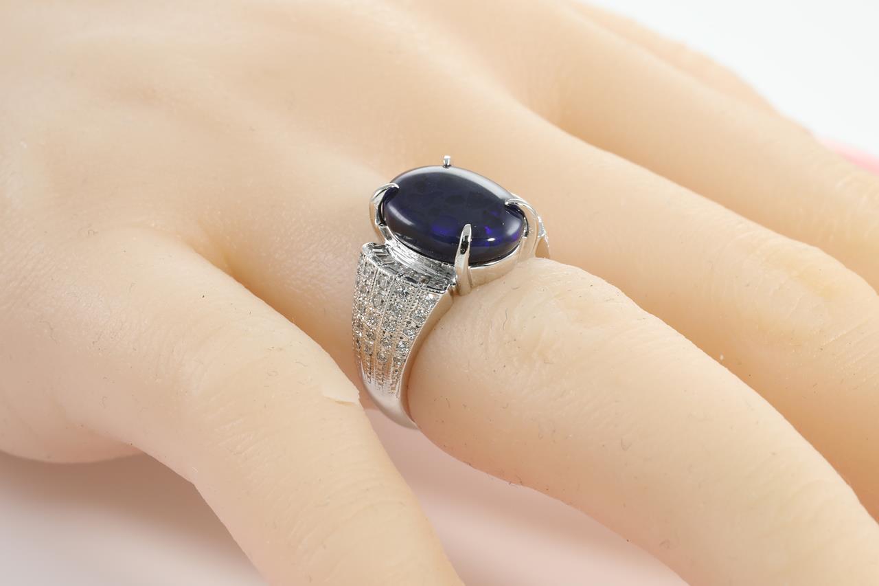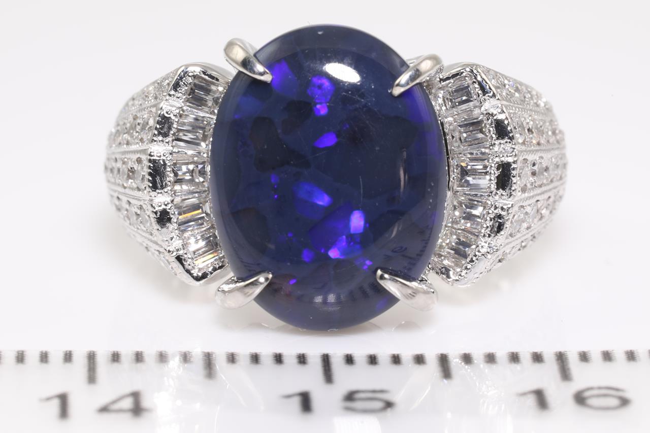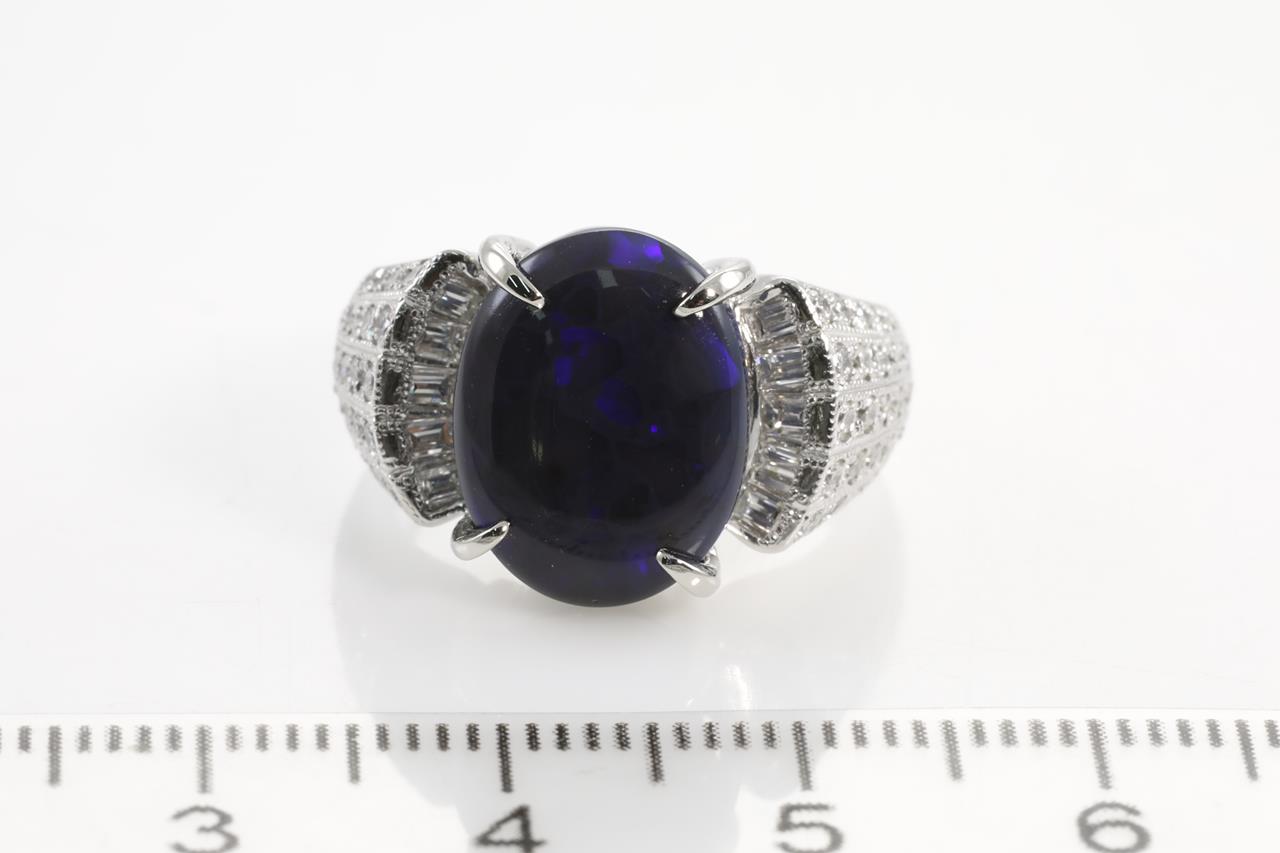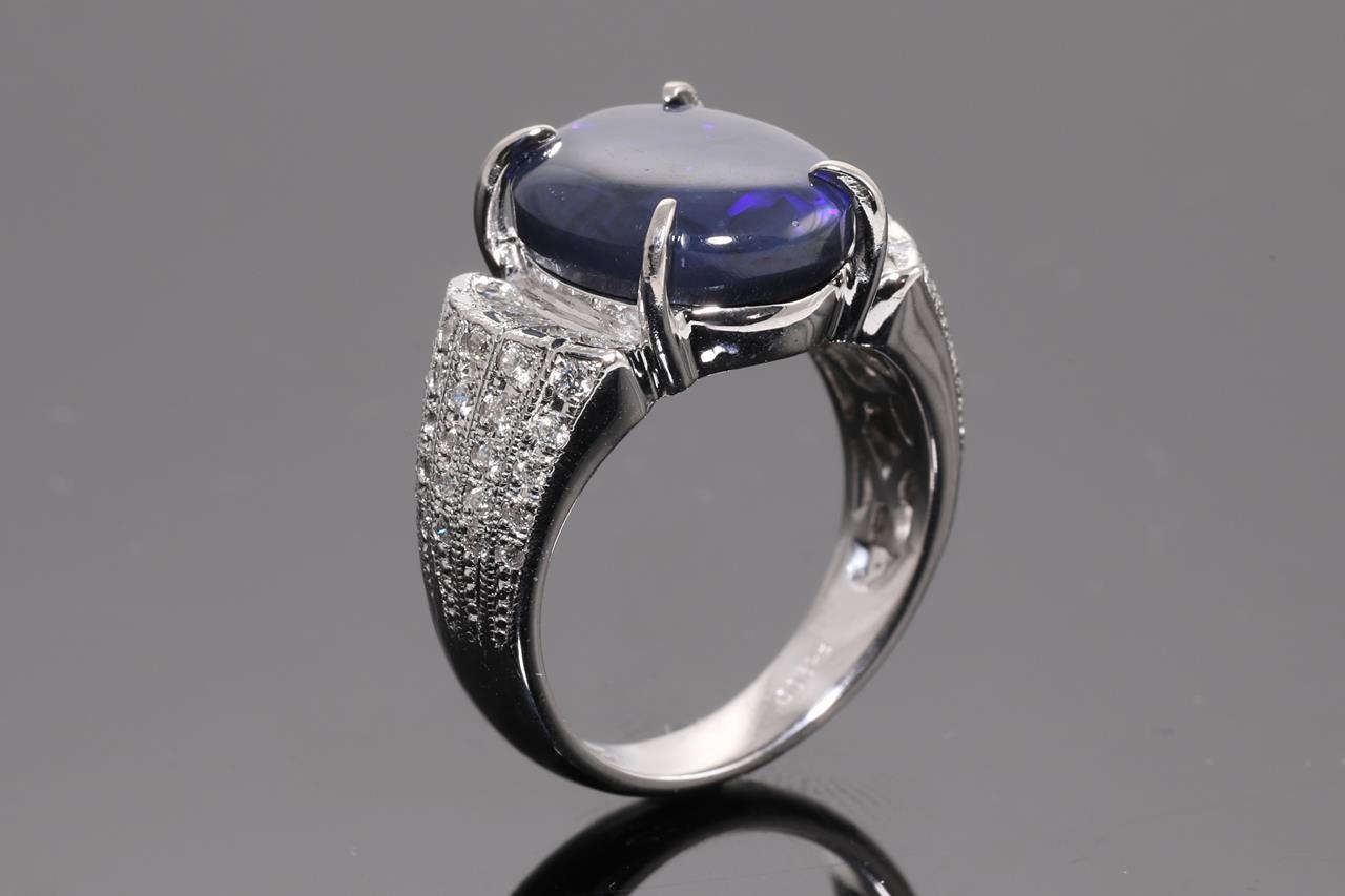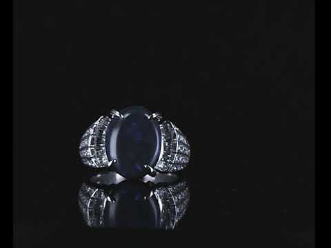 Opal and Diamond ring with oval shape black Opal of 4.20ct and Diamonds totalling 0.65cts (Estimated grading: H-I VS-SI). Platinum. Ring size K. Weight: 11.2g (Pre-owned)