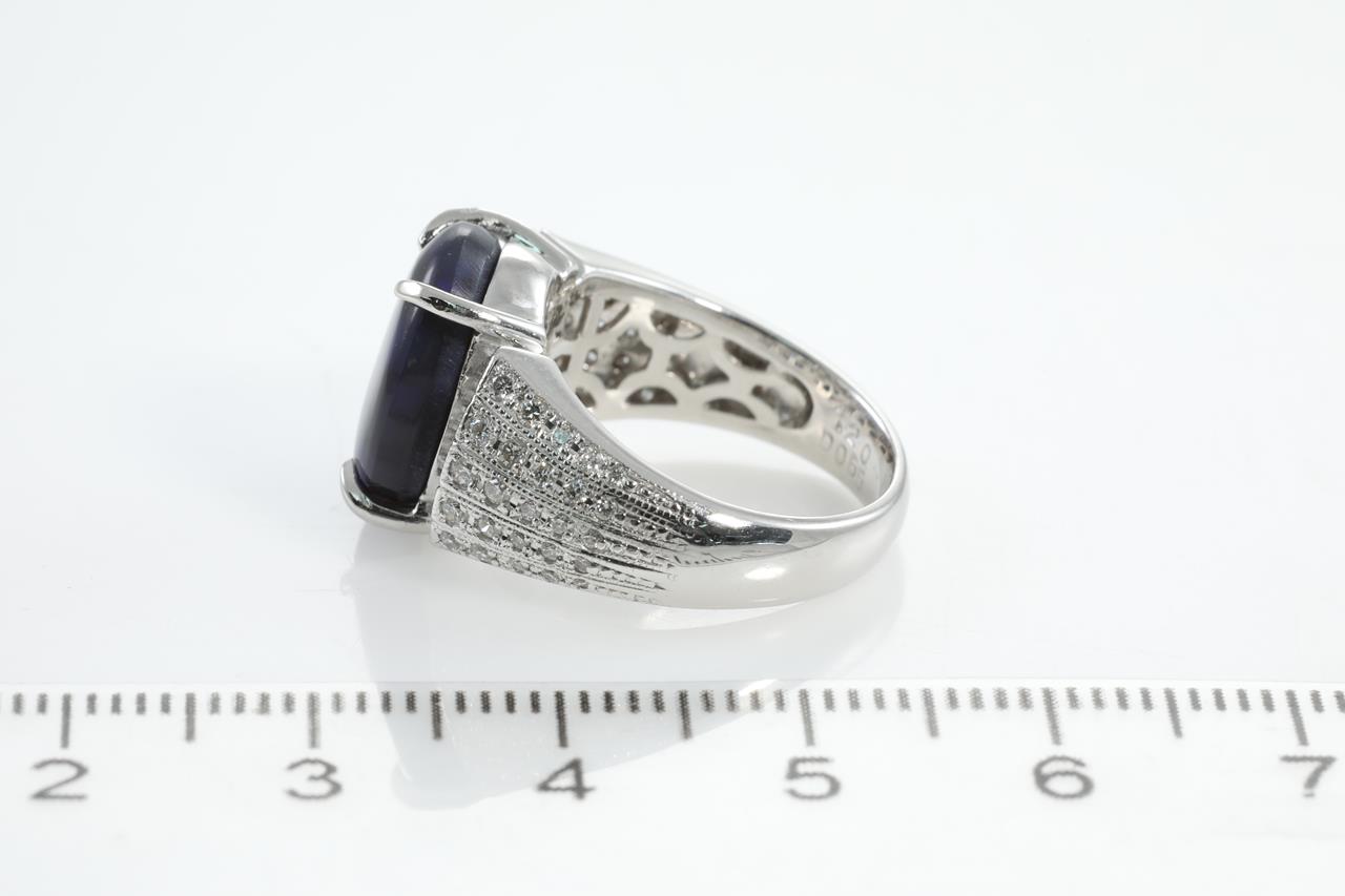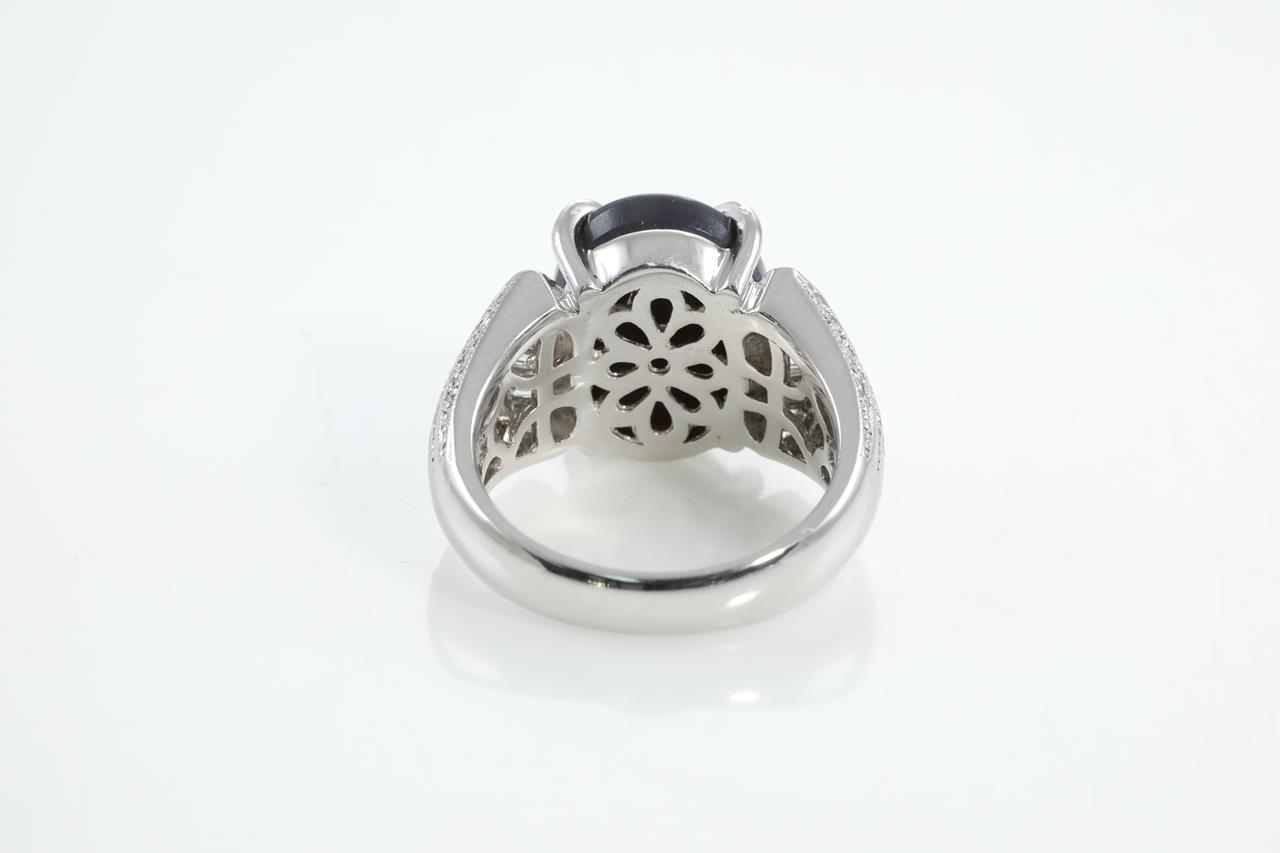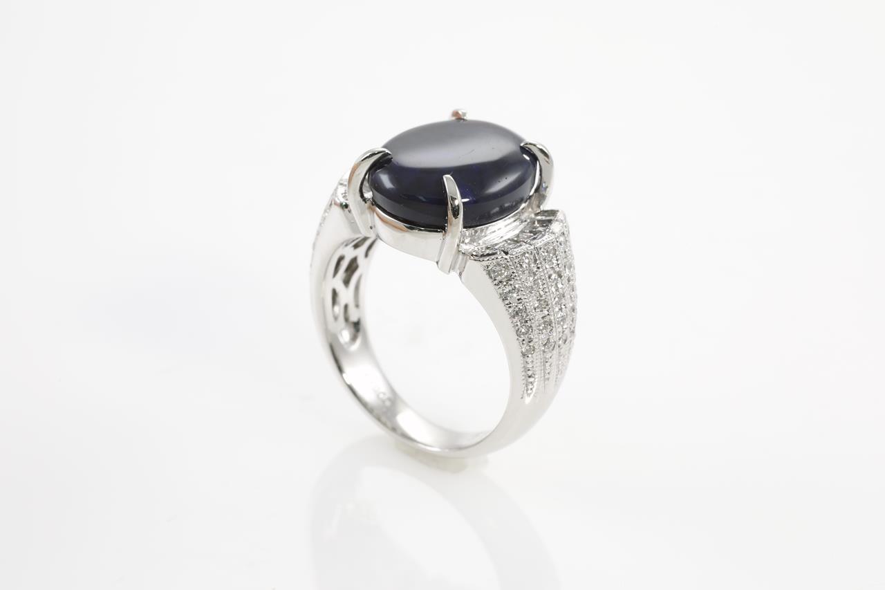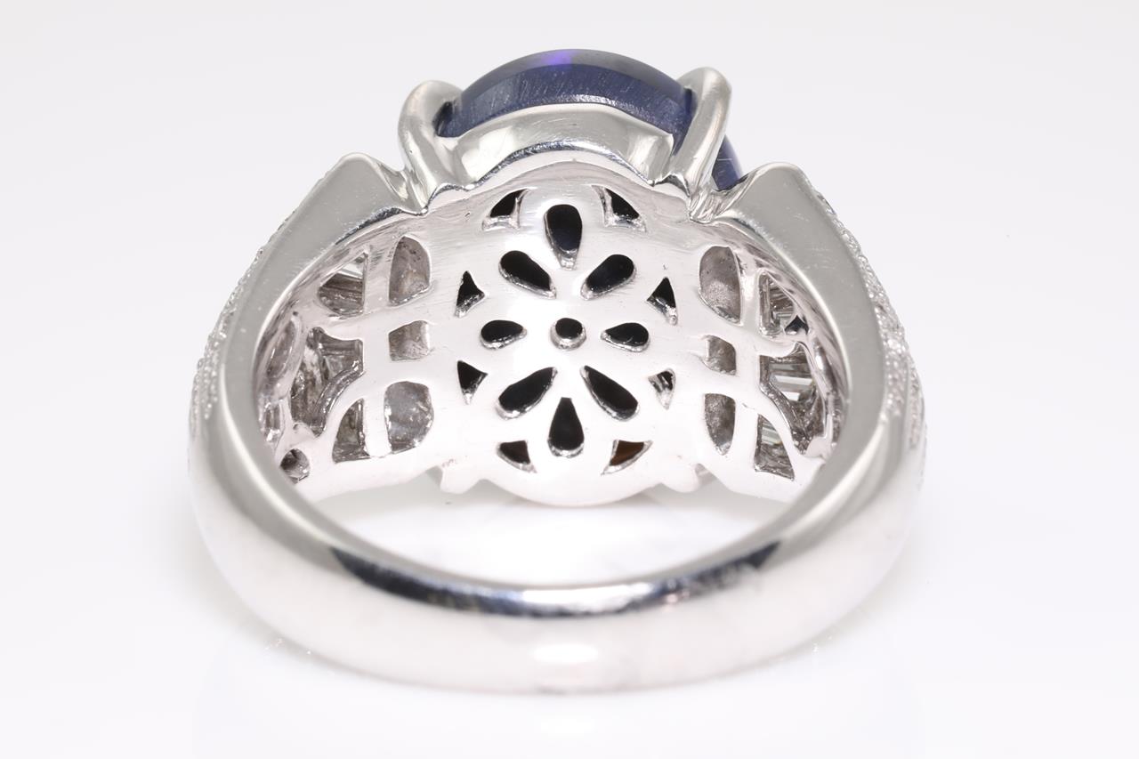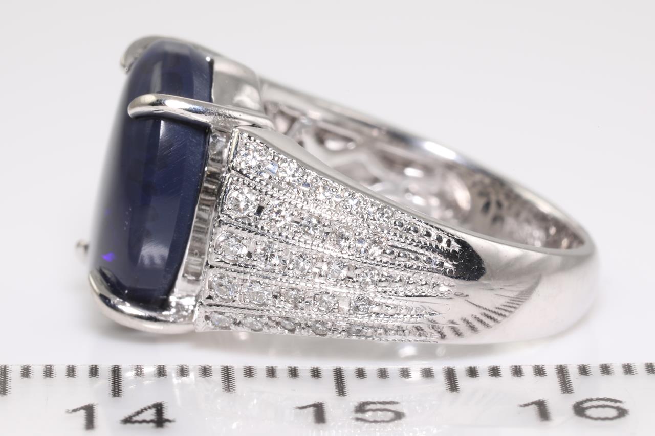 Opal and Diamond ring with oval shape black Opal of 4.20ct and Diamonds totalling 0.65cts (Estimated grading: H-I VS-SI). Platinum. Ring size K. Weight: 11.2g (Pre-owned)