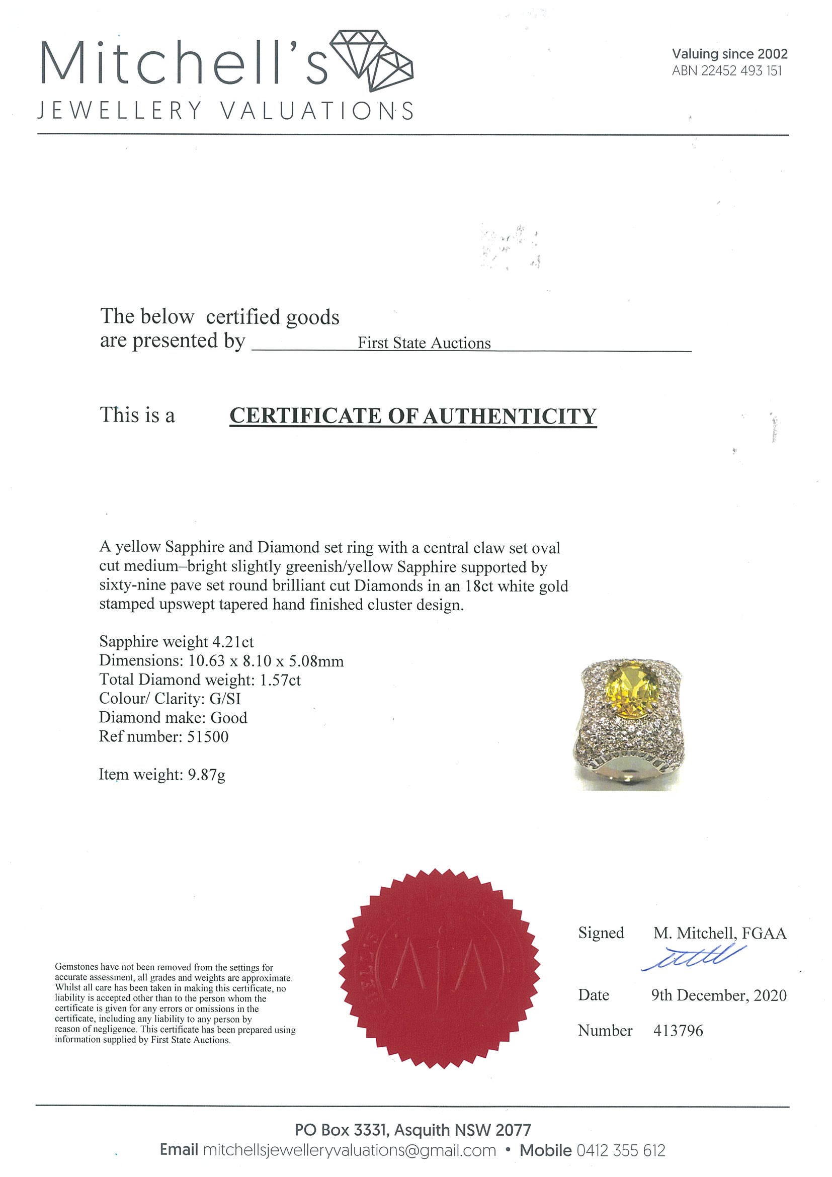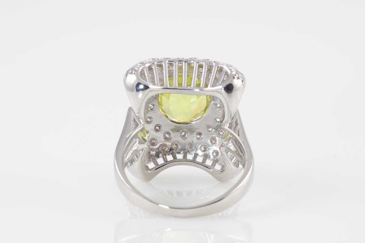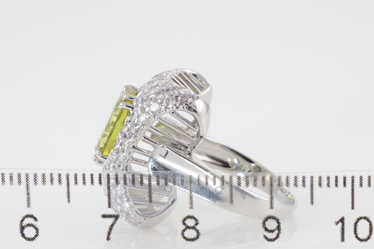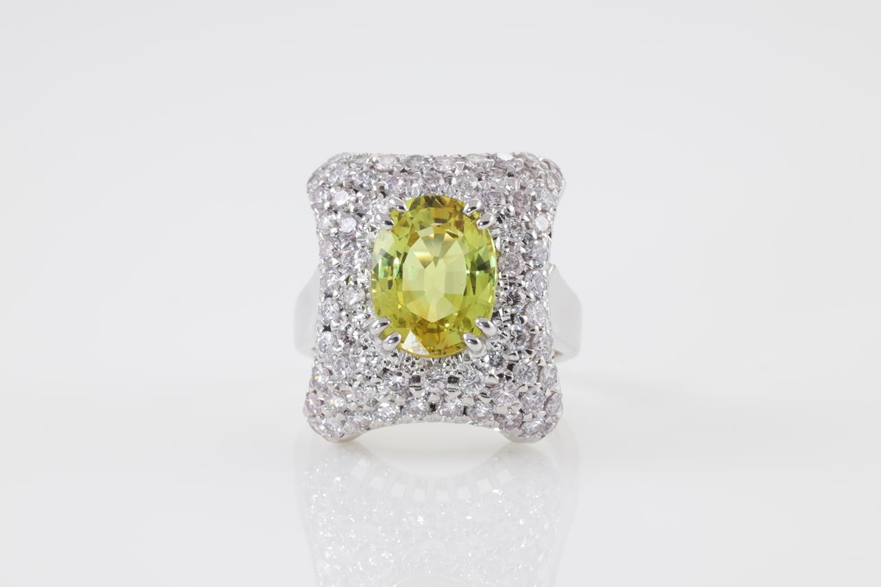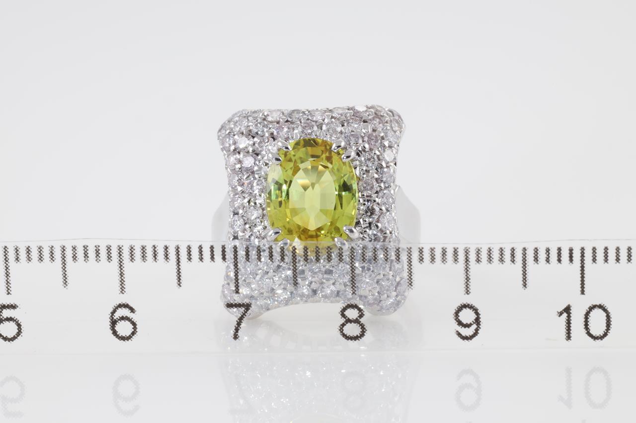 Sapphire and Diamond ring with oval Yellow Sapphire of 4.21ct and round Diamonds totalling 1.57cts (Estimated grading: G SI). 18ct white gold. Ring size: L1/2 - It is not recommended to resize this ring. Weight: 9.87g. With Certificate #413796. (Pre-owned)