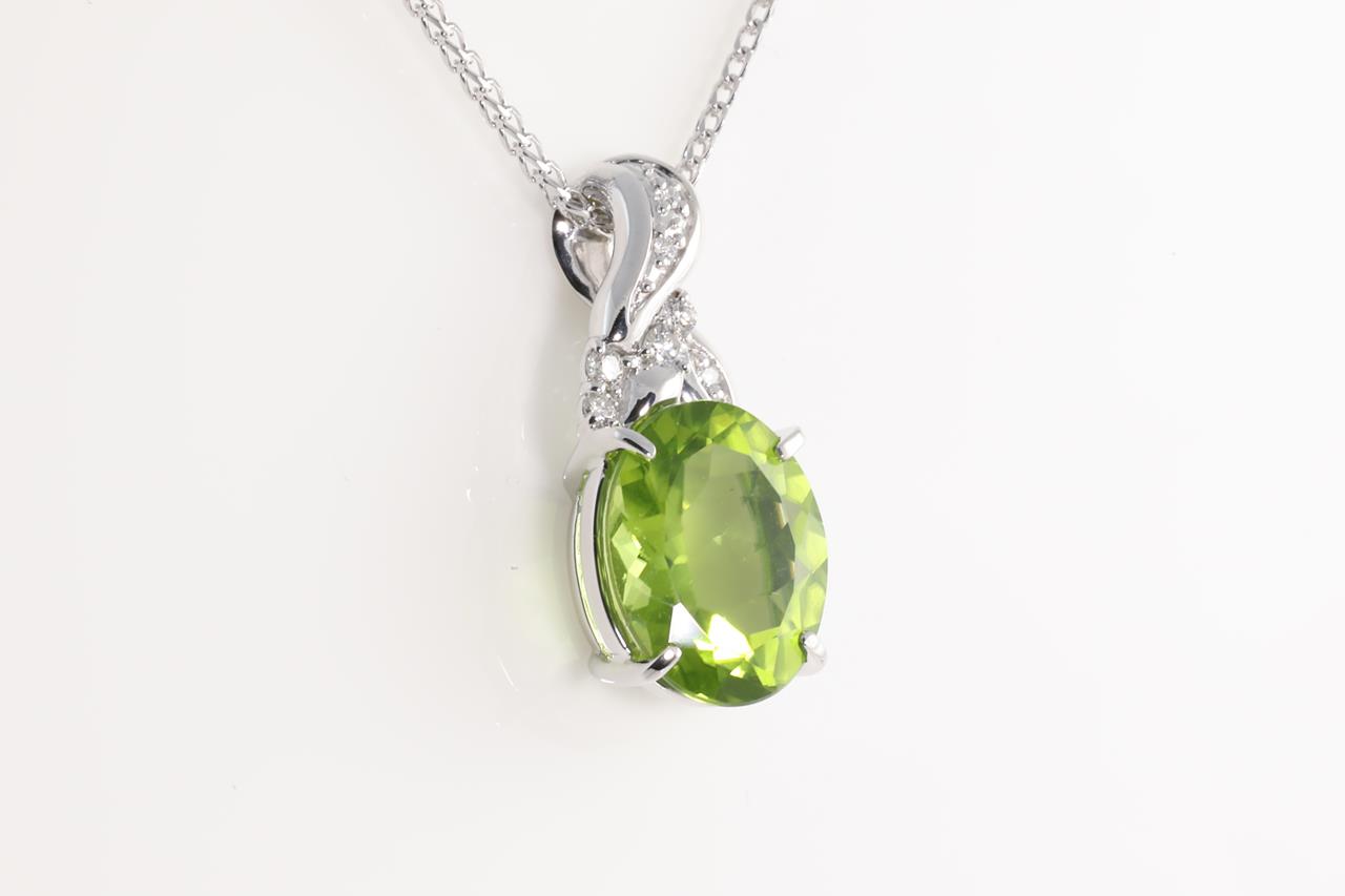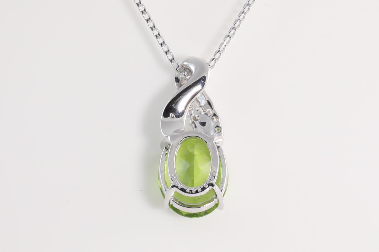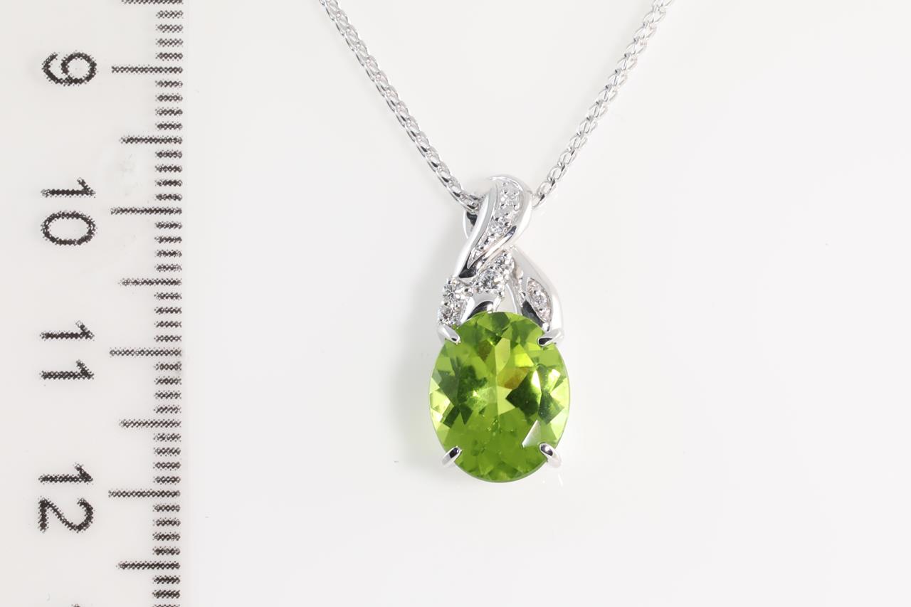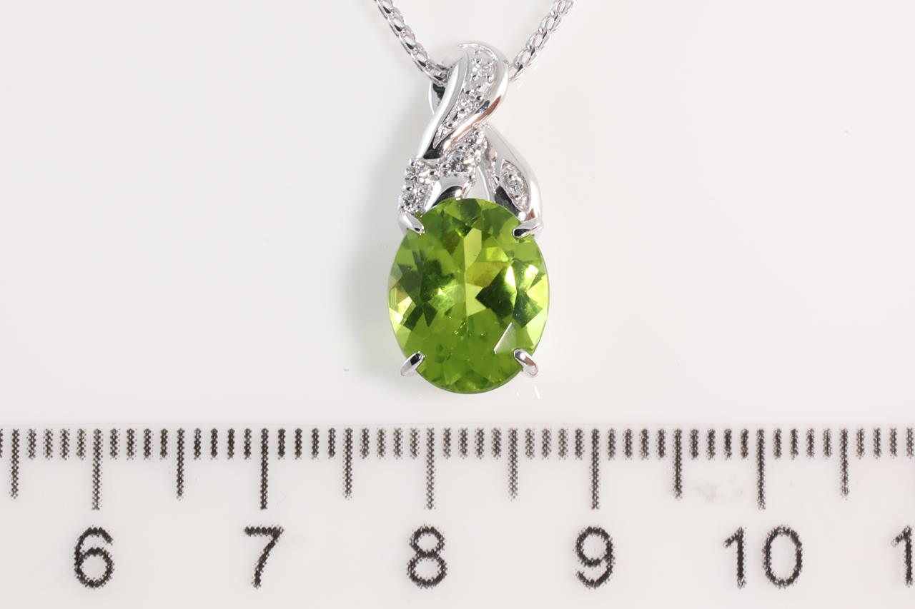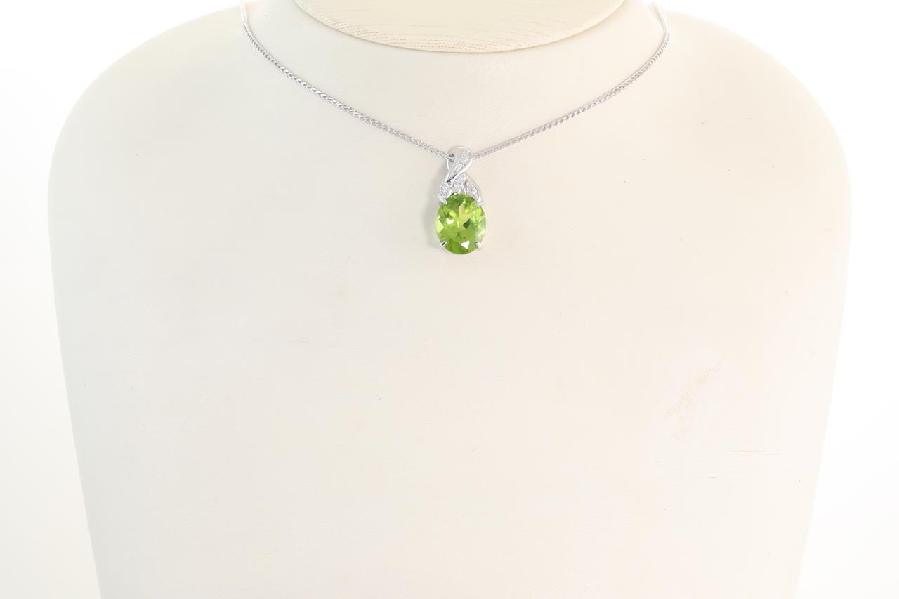 Peridot and Diamond pendant with oval shape Peridot of 4.22ct and Diamonds totalling 0.09cts. 18ct white gold with 18ct white gold 45cm chain. Weight: 6.2g (Pre-owned)