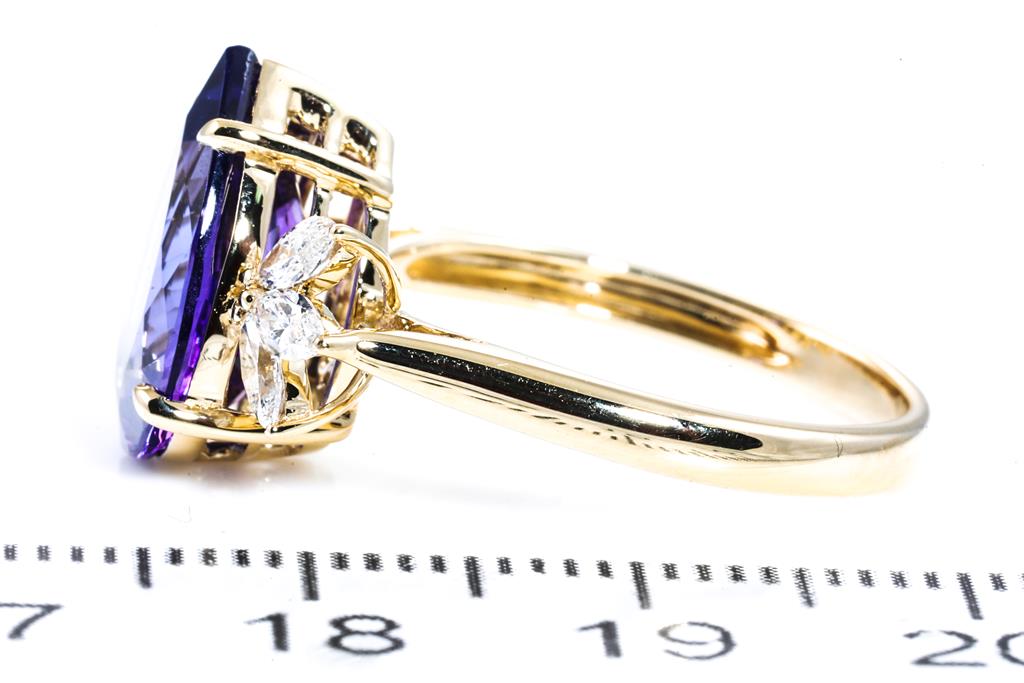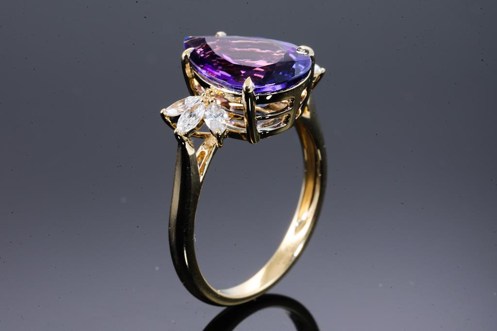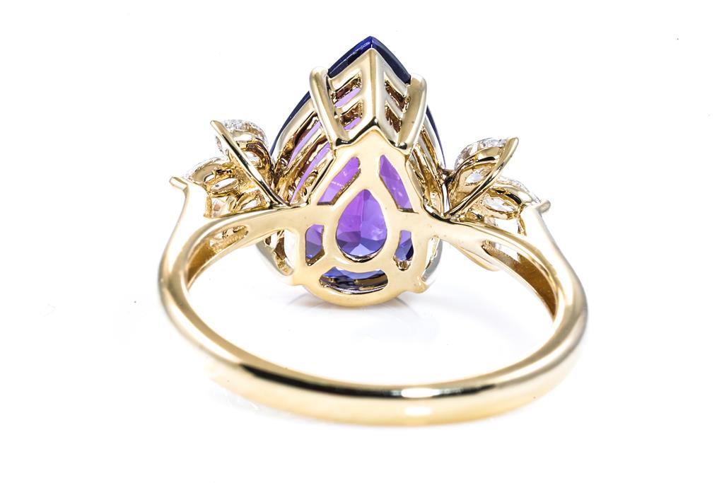 Tanzanite and Diamond ring with pear shape Tanzanite of 4.23ct and 6 marquise cut Diamonds totalling 0.42cts (Estimated grading: H-SI). 18ct yellow gold. Ring size N1/2 - ring resizing is not recommended. Weight: 4.2g. With Certificate #415924. (As new)