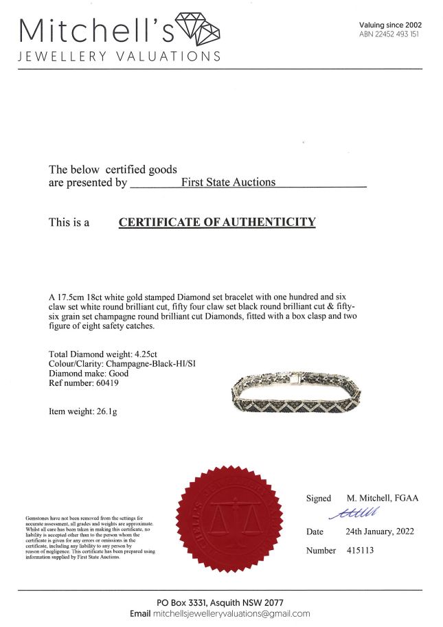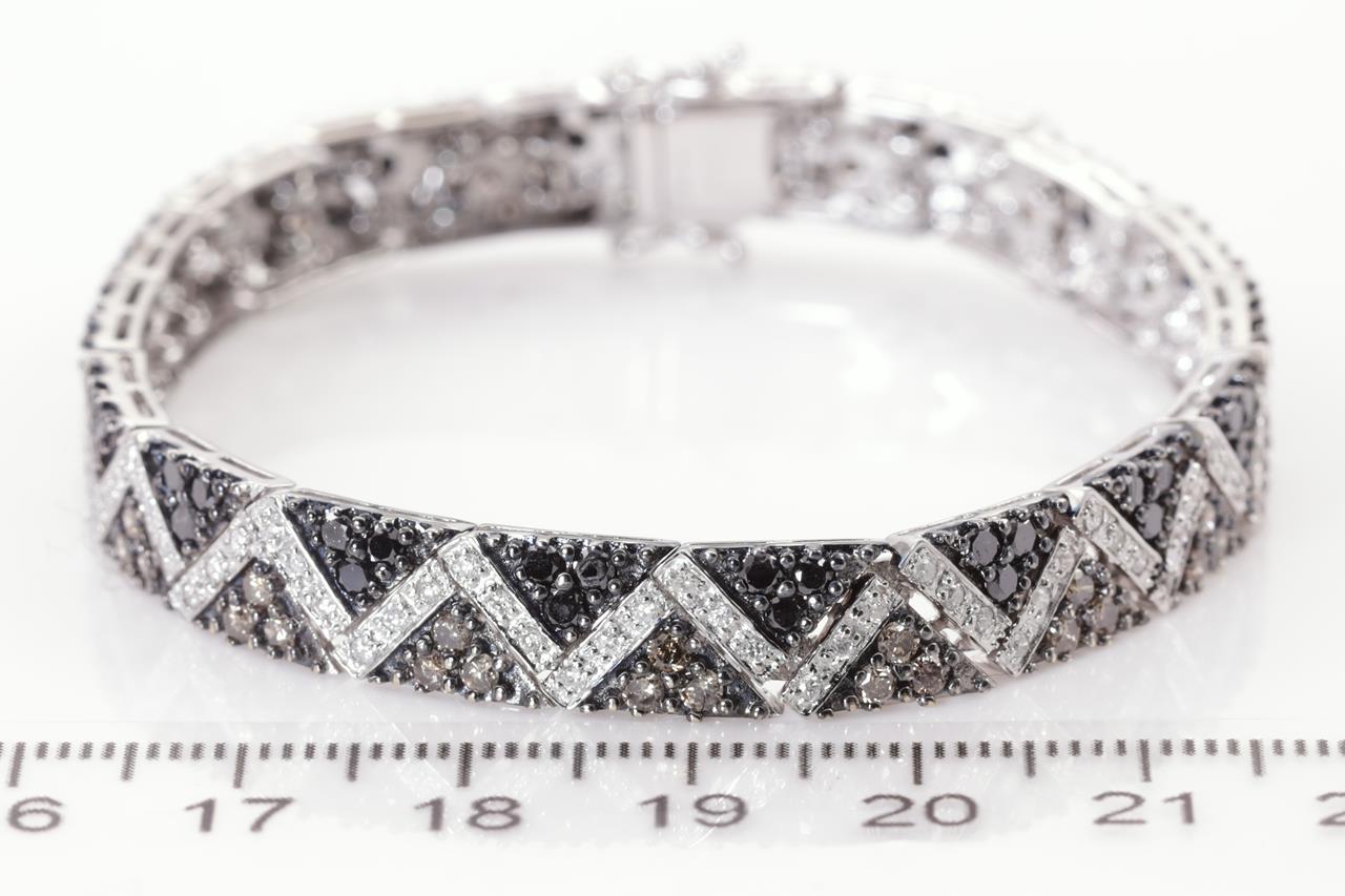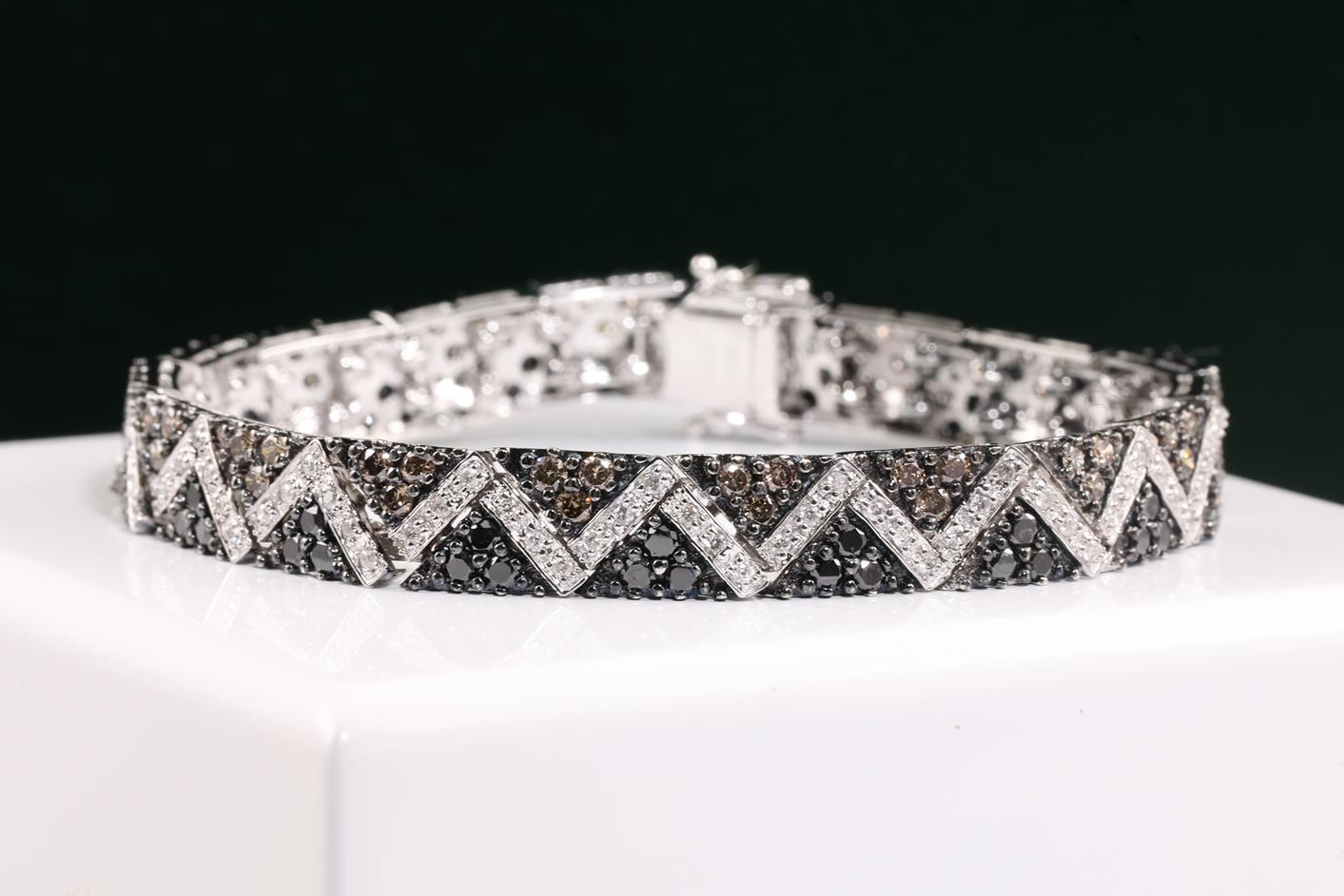 Diamond bracelet with round brown, black and white Diamonds totalling 4.25cts (Estimated grading: Champagne-Balck-HI SI). 18ct white gold with black rhodium plating. Length: 17.5cm. Weight: 26.1g. With certificate #415113. (Pre-owned)