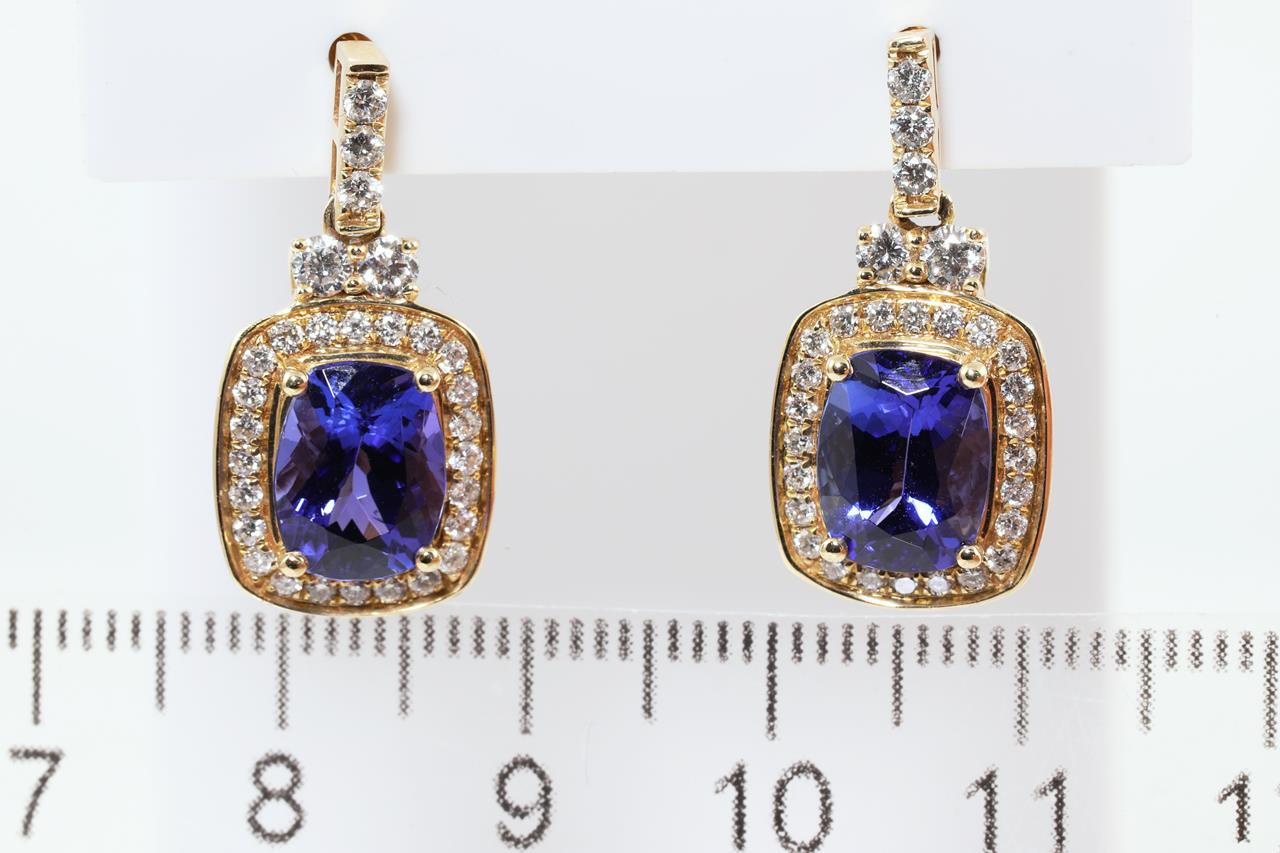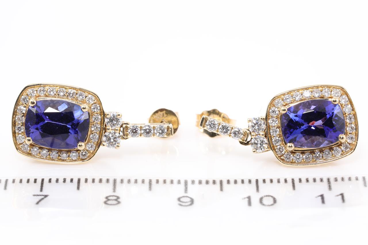 Tanzanite and Diamond earrings with cushion cut Tanzanites totalling 4.27cts and Diamonds totalling 0.84cts (Estimated grading: H SI). 14ct yellow gold. Weight: 5.9g. With certificate #414848. (As new)