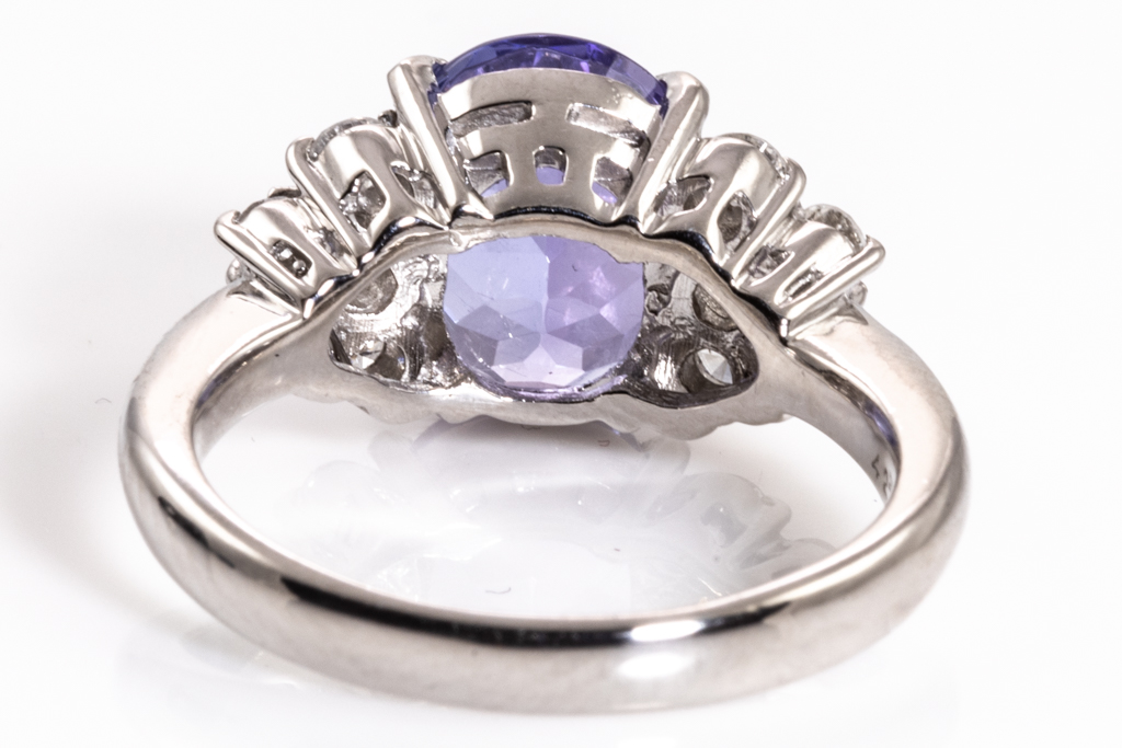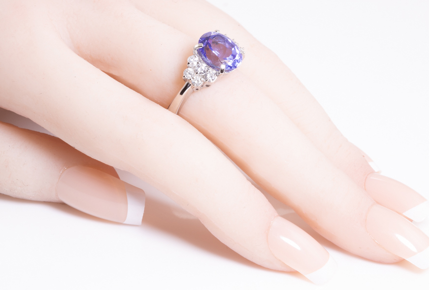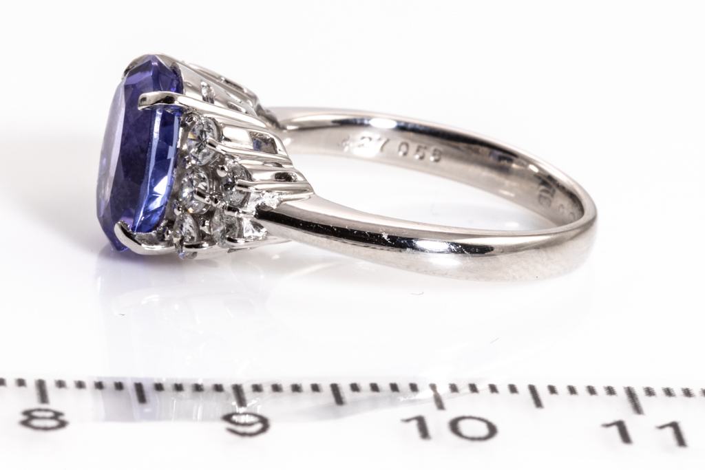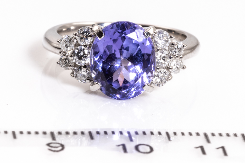 Tanzanite and Diamond ring with an oval Tanzanite of 4.27ct and round Diamonds totalling 0.58cts (Estimated grading: H SI-P1). Platinum. Ring size O1/2. Weight: 9g. (Pre-owned)