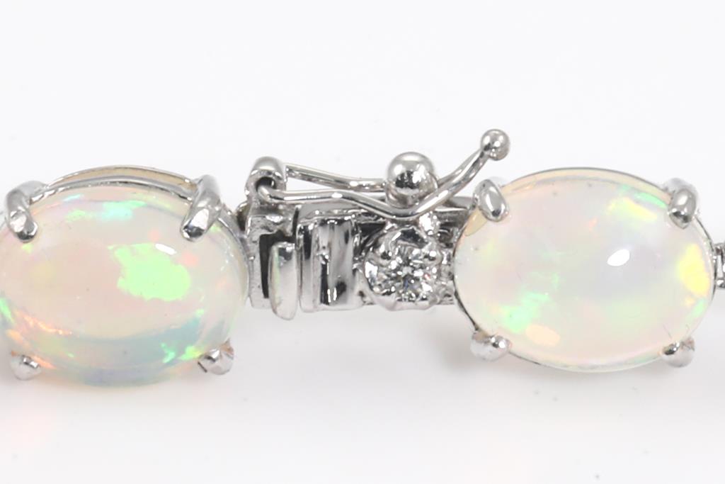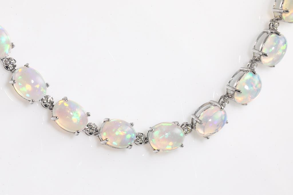 Opal and Diamond necklace with oval cabochon cut solid Opals totalling 42.95cts and round Diamonds totalling 1.11cts (Estimated grading: K-L SI). Platinum. Length: 47cm. Weight: 36.7g. With certificate #415326. (Pre-owned)